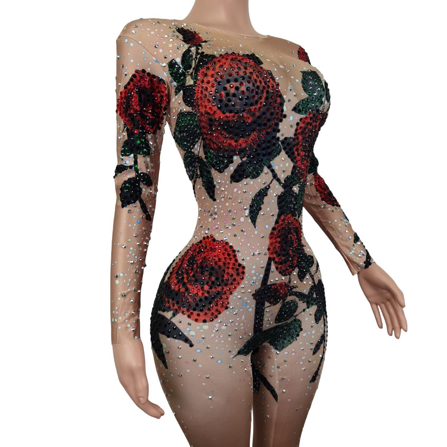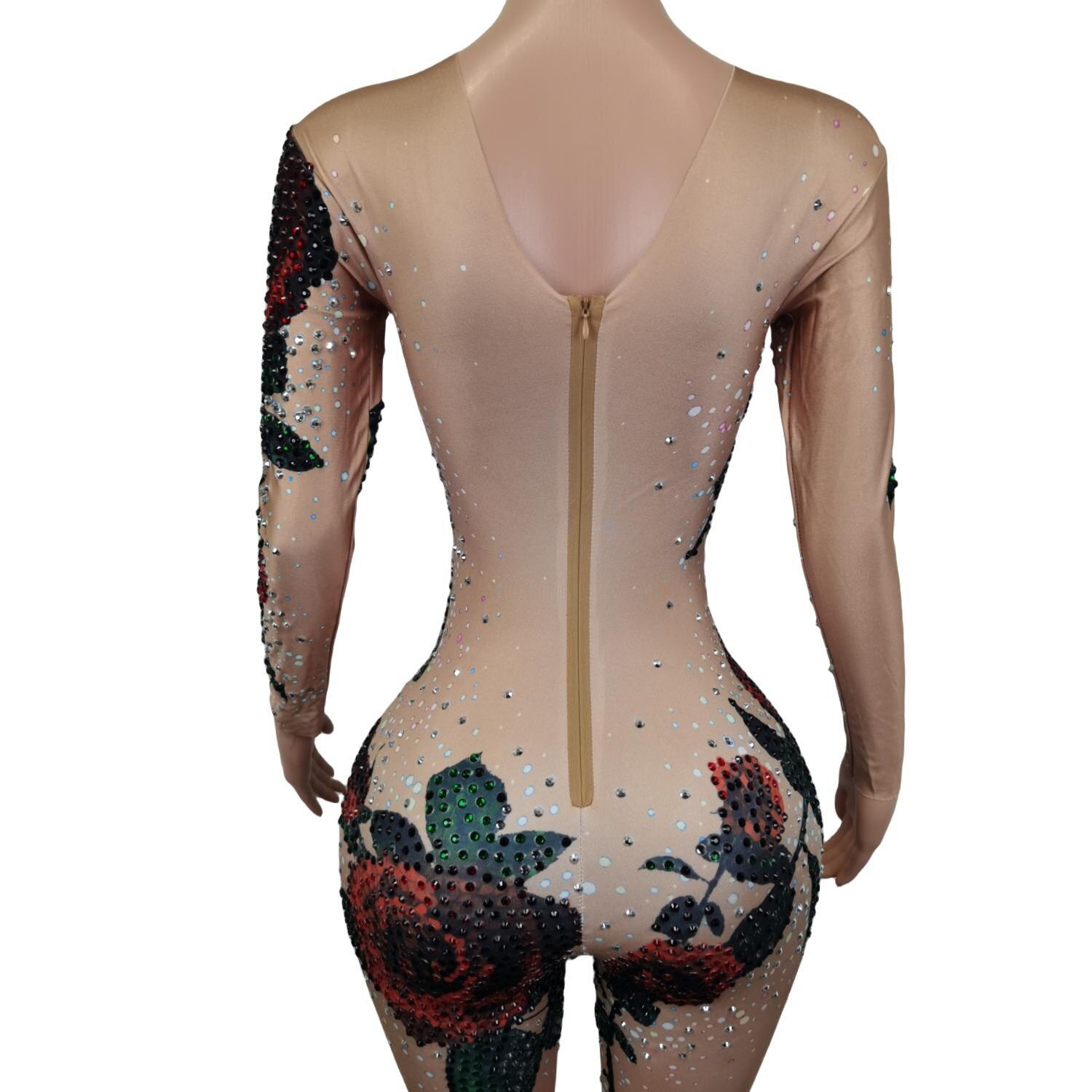 Romantic Rose pattern Rhinestone Stretch Skinny Leotard Nightclub DJ Stage Costumes Pole Dancing Performance Jumpsuit Meiguiku