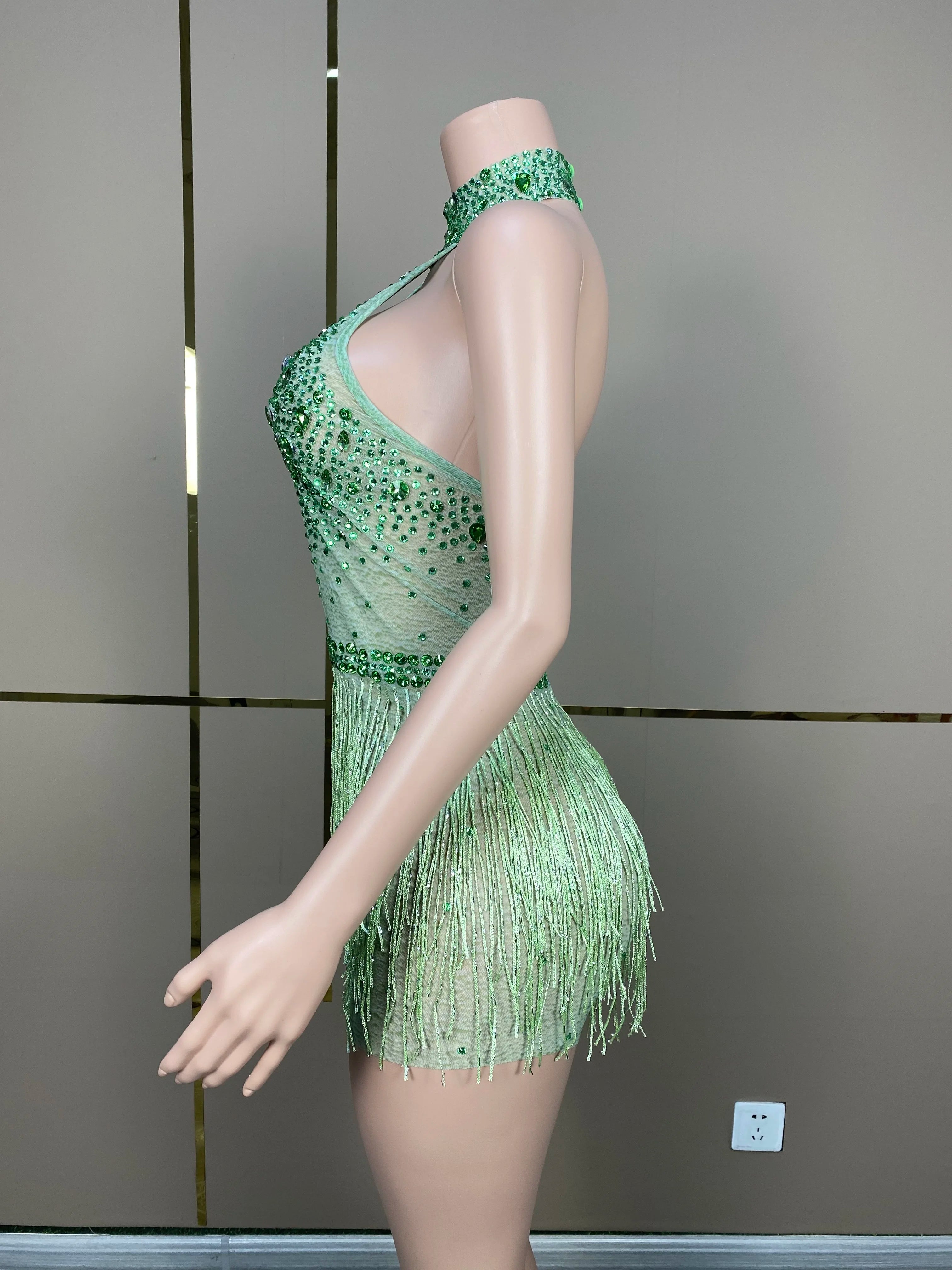 Get ready to dance the night away in this samba-inspired hot green tassels hollow out short wrap evening dress, perfect for drag queens, club parties, birthdays, special occasions, and festivals. This sexy costume features vibrant green tassels that sway with your every move, creating a dynamic and eye-catching look that is sure to captivate the audience. The hollow-out design adds a touch of sultry appeal, while the short wrap silhouette allows for freedom of movement and a playful vibe. Whether you're performing on stage or hitting the dance floor, this costume exudes energy and excitement, making it a standout choice for a night of celebration and entertainment. Embrace the festive spirit and showcase your style with this samba-inspired and sexy ensemble designed to make a statement and leave a lasting impression.