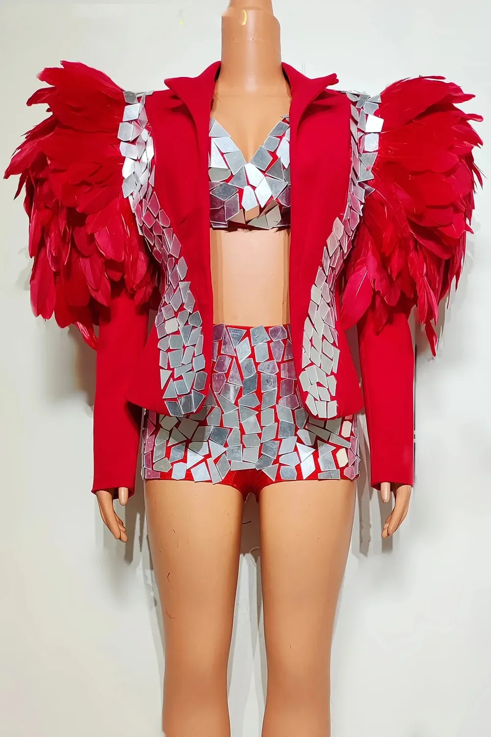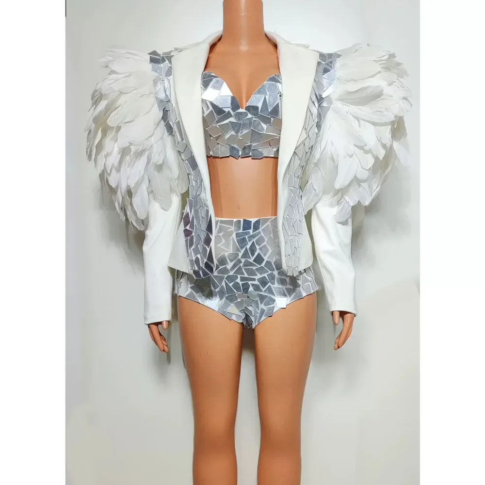 Sequin Bikini Nightclub Stage Performance Dance Outfit Singer Concert Exaggerated Drag Queen Costume White Feather Mirror Coat