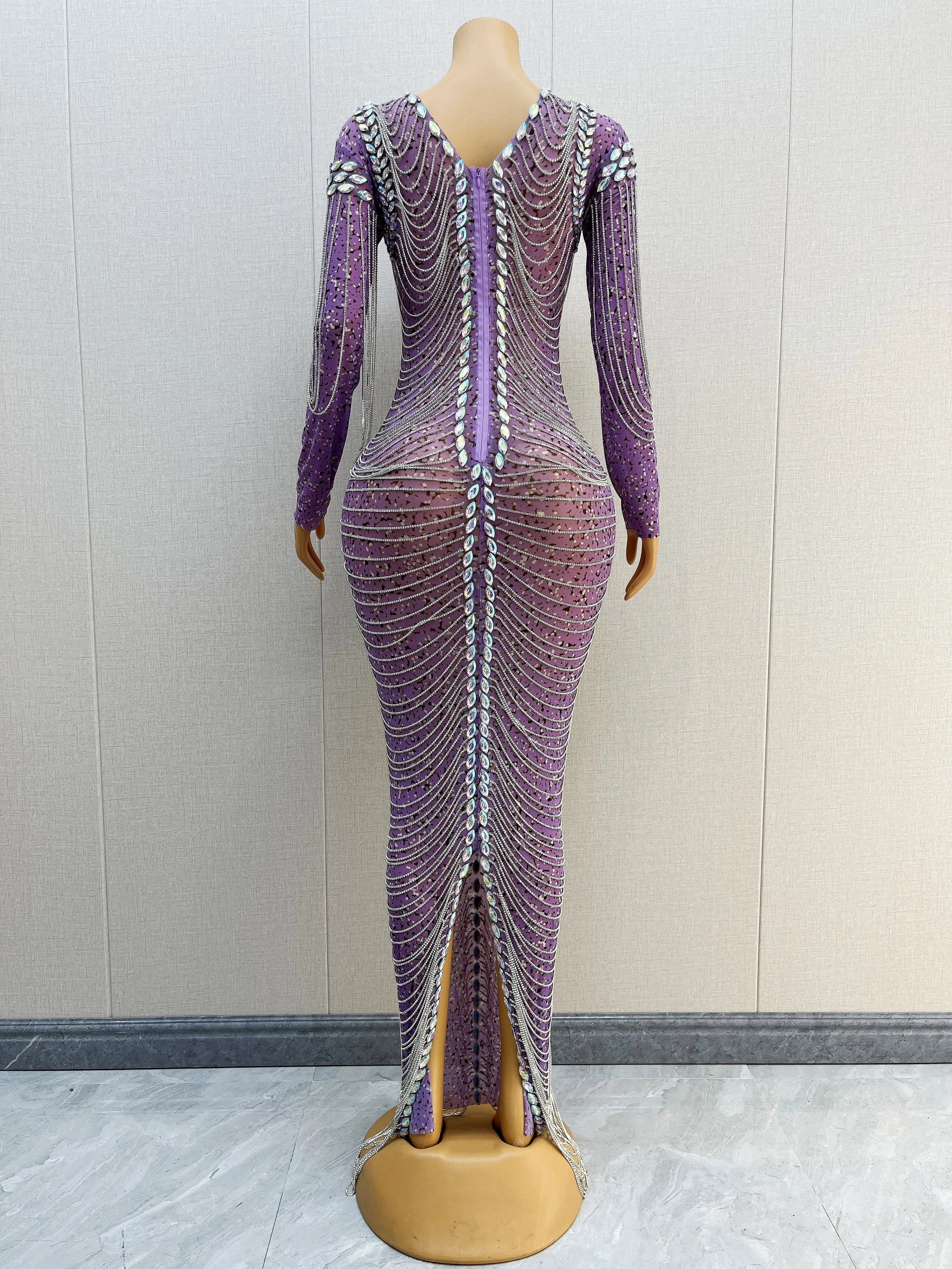 The sexy AB rhinestones crystals chains purple dress is perfect for evening events, nightclubs, and as a costume for female singers during performances. The dress features a stretchy fabric and is adorned with eye-catching rhinestones and crystals, adding a touch of glamour and allure to the outfit. It's an ideal choice for those seeking a standout and alluring costume for their performances.??