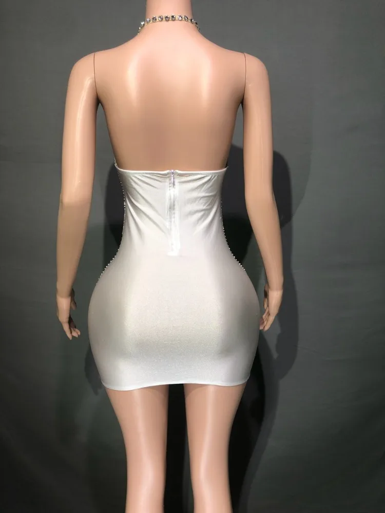 Sexy Birthday Party Celebrate Dress Women Sparkly Gold Rhinestones Chains Deep V Neck Backless Short Dress Singer Show Wear