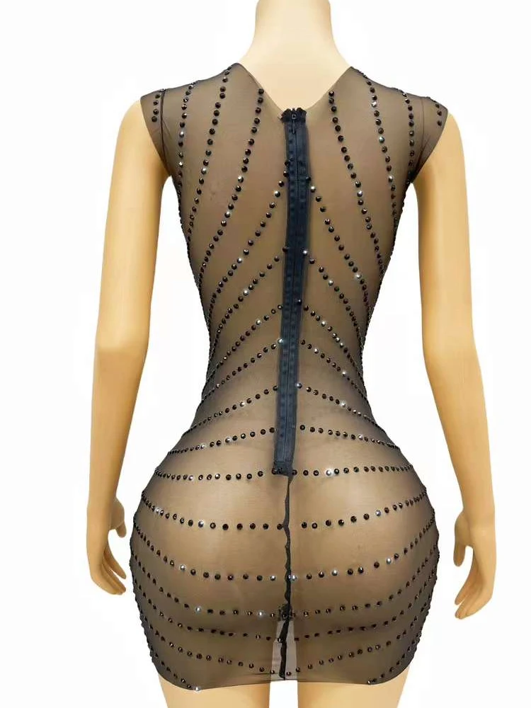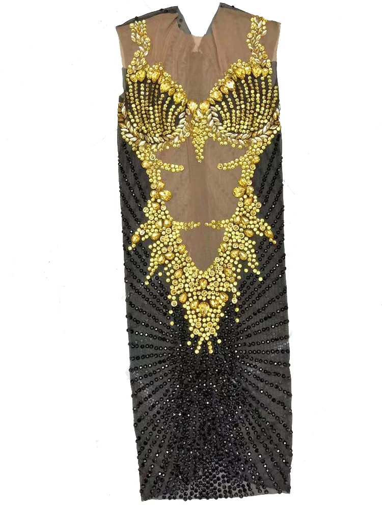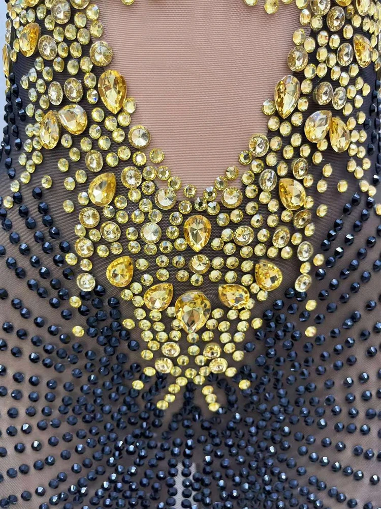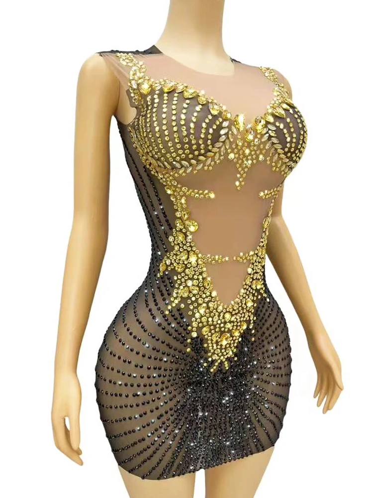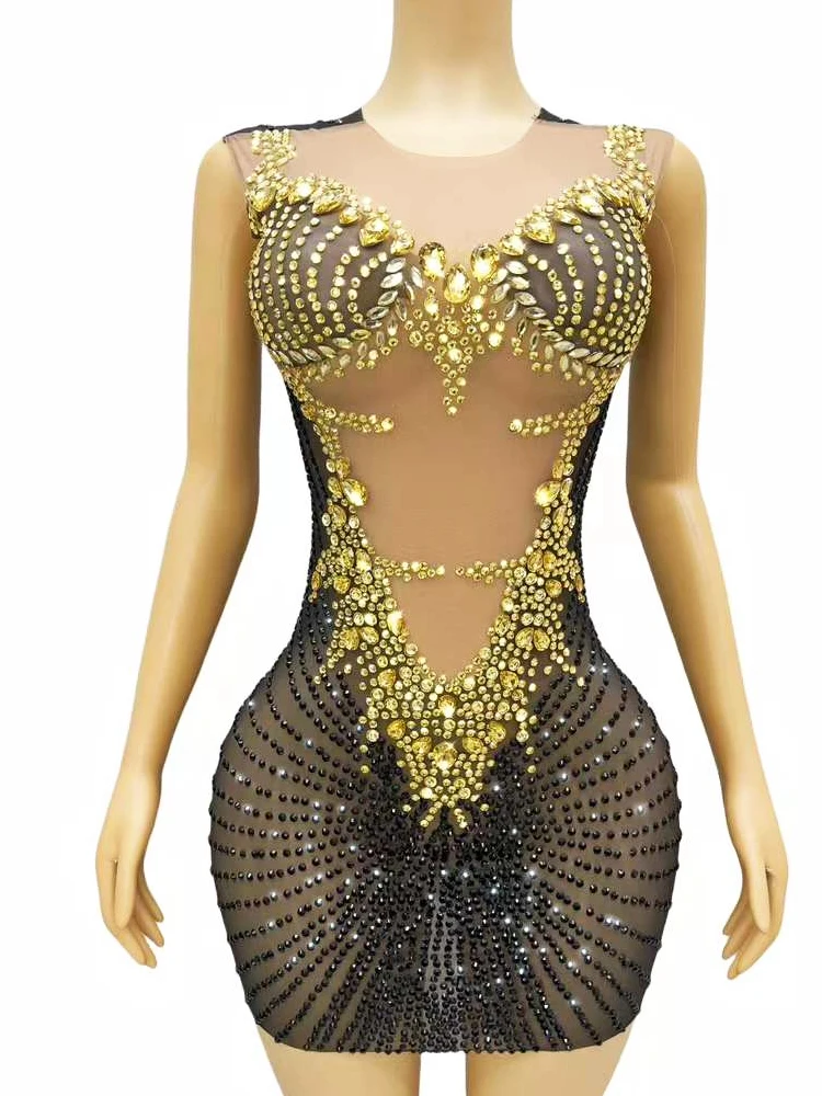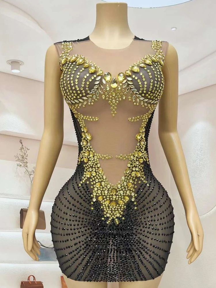 Sexy Black See Through Mesh Women Short Dress Shining Golden Crystal Evening Party Show Wear Nightbar Photoshoot Stage Costumes