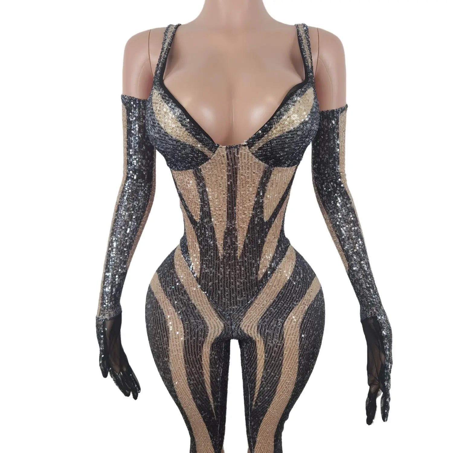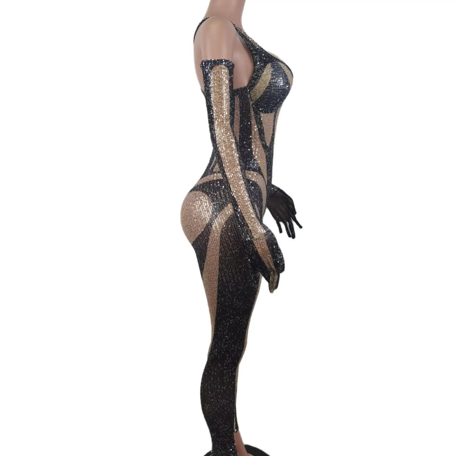A high‑impact, figure‑skimmingblack sequin jumpsuitwith matching gloves designed for nightclub, pole dance, drag performances, birthday parties, and stage shows. The piece combines dense sequin coverage with performance construction so it shimmers under lights while allowing full mobility for choreography and aerial work.
