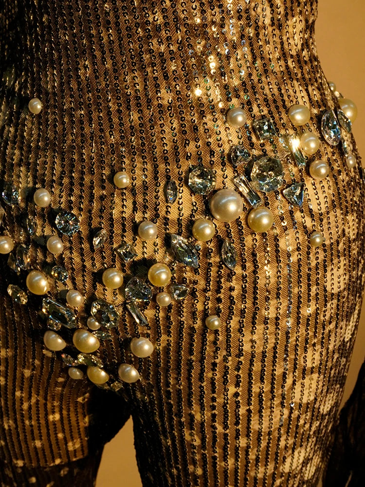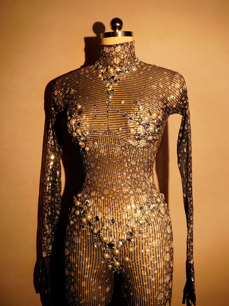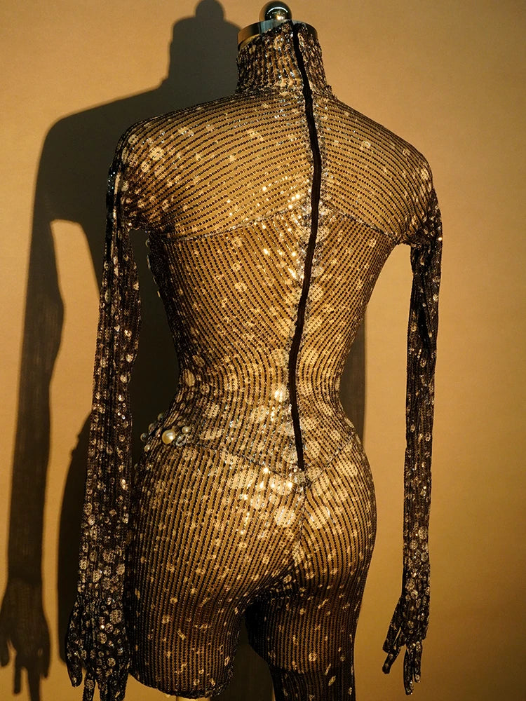 Sexy Black Sequined Jumpsuit Rhinestone Bodysuit Long Sleeves Club Rave Pole Stage Drag Queen Festival Outfits Halloween
