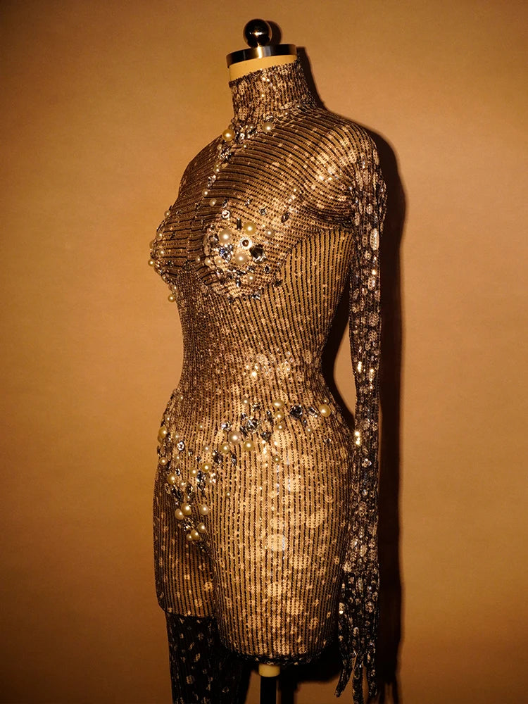 Get ready to turn heads in our stunning Black Sequined Jumpsuit! This eye-catching bodysuit features dazzling rhinestone accents and long sleeves, making it the perfect choice for club nights, rave parties, stage performances, or festival outings. Whether you're a drag queen looking to make a statement or searching for a unique Halloween costume, this jumpsuit combines glam, style, and confidence. Stand out in any crowd and let your personality shine through!