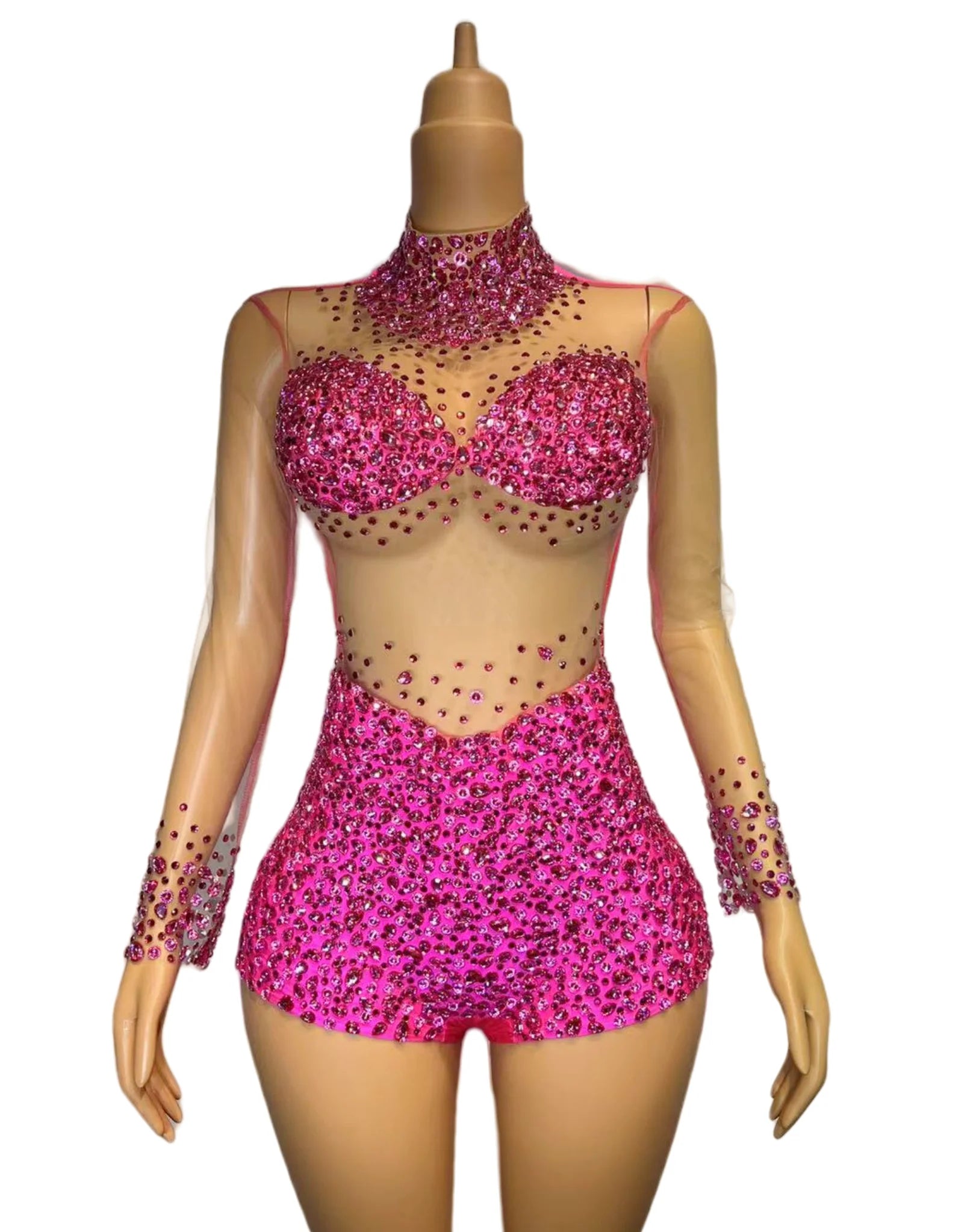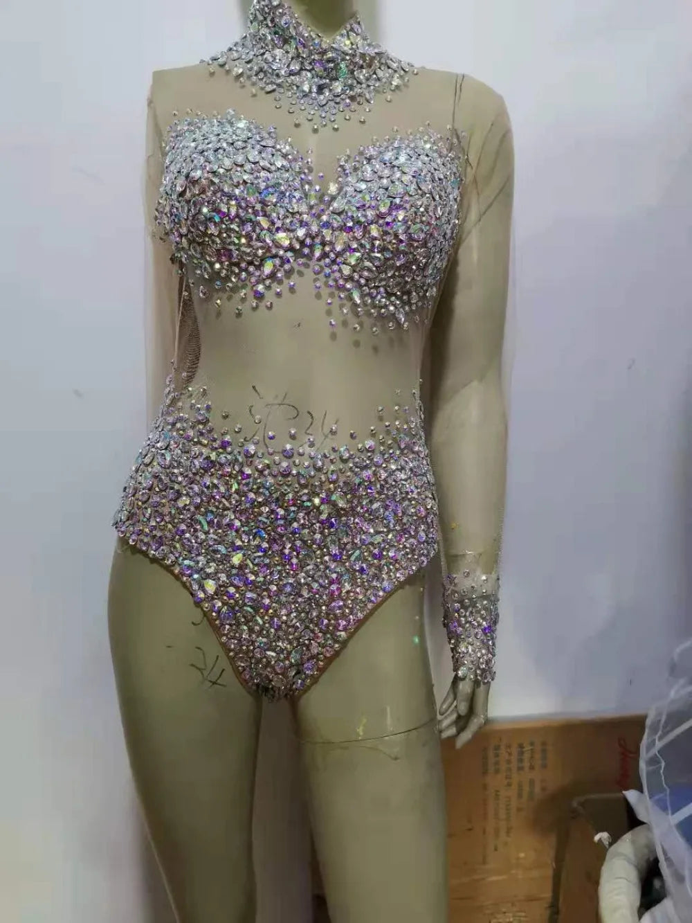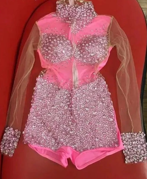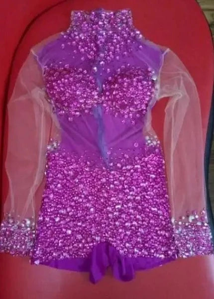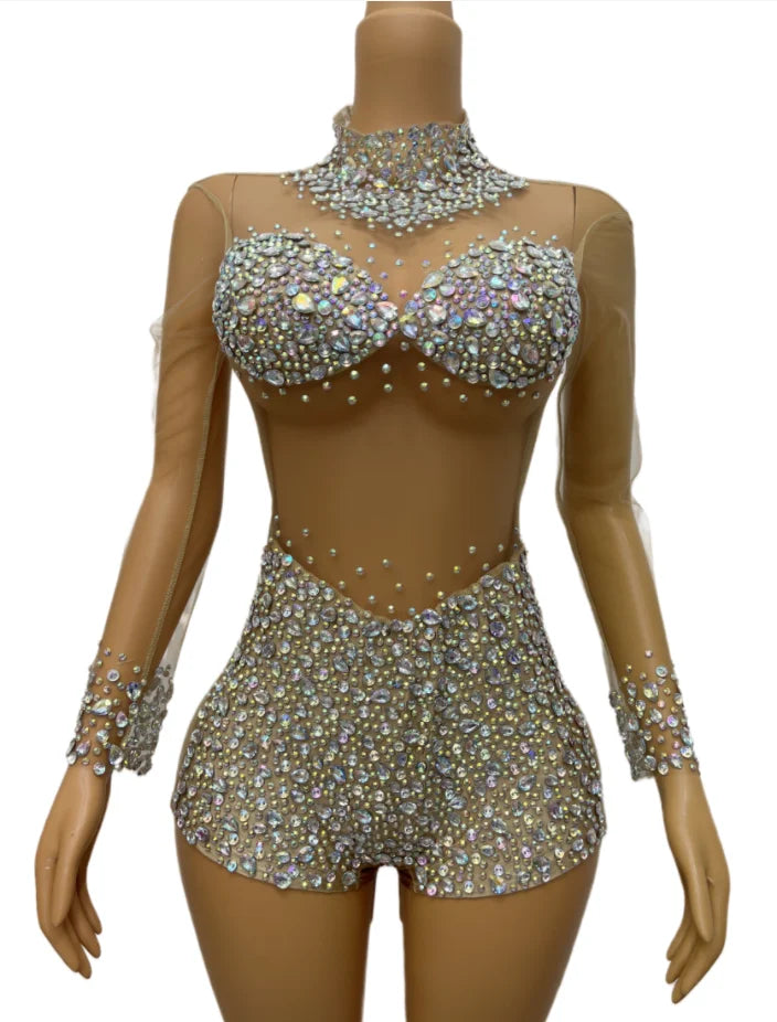 Turn heads at your next birthday party or dance performance in this sexy Blue Stones Transparent Romper. This outfit features rhinestones and bodysuits, making it perfect for singers and dance teams. Embrace your style and confidence in this stunning dance wear.