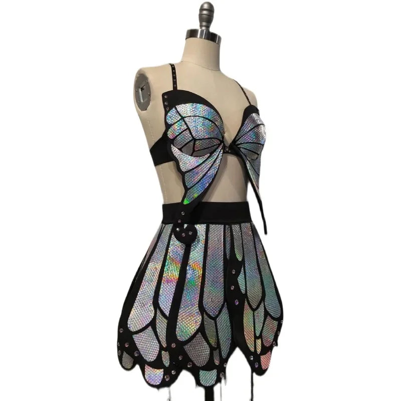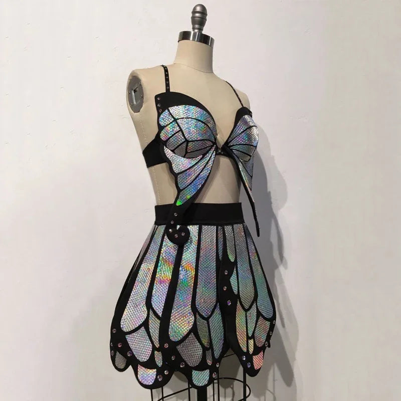 Sexy Butterfly Top Skirt Women Party Festival Outfit Stage Dj Ds Singer Dancer Rave Clothes Bright Laser Gogo Costumes