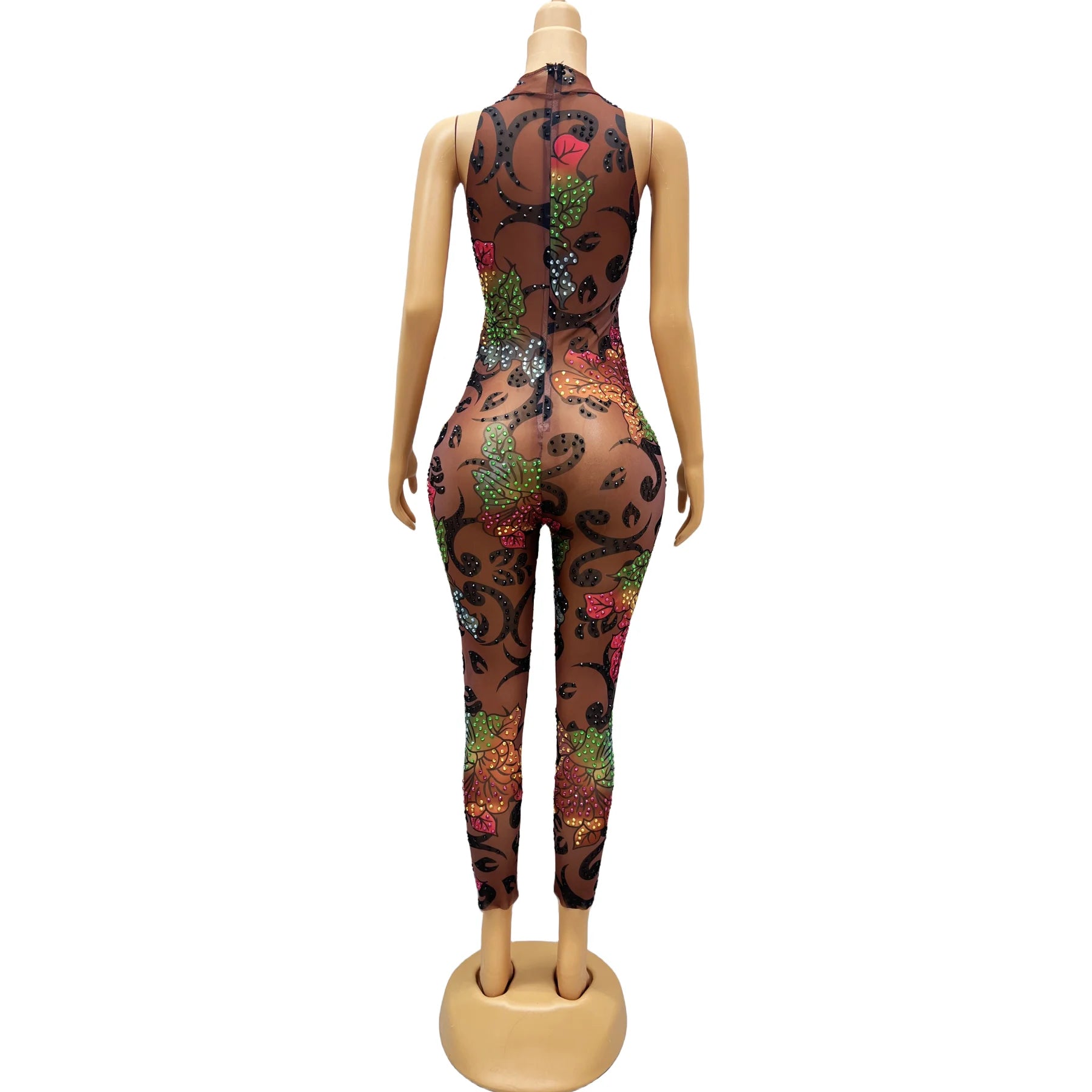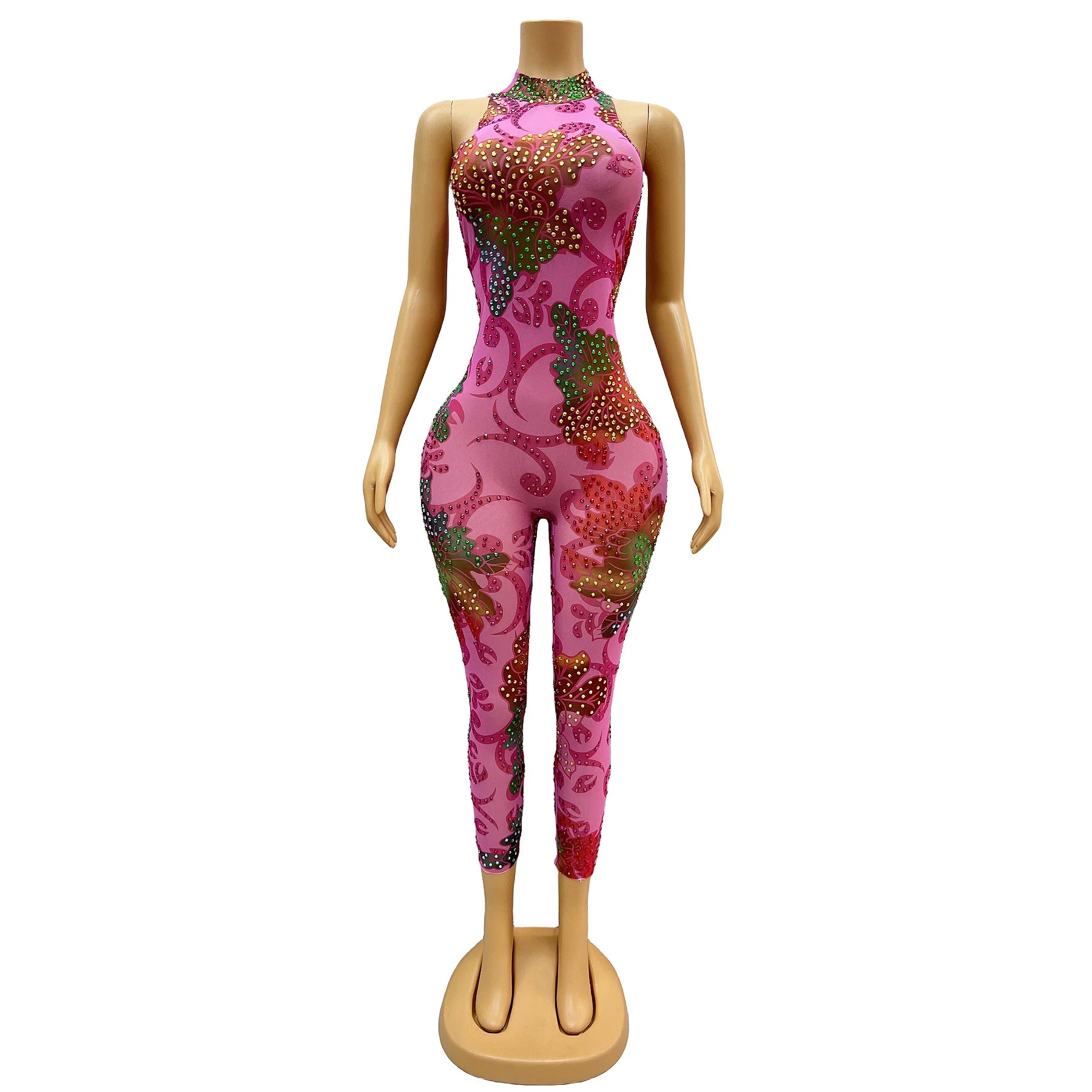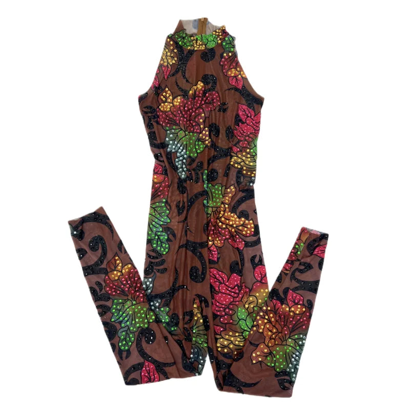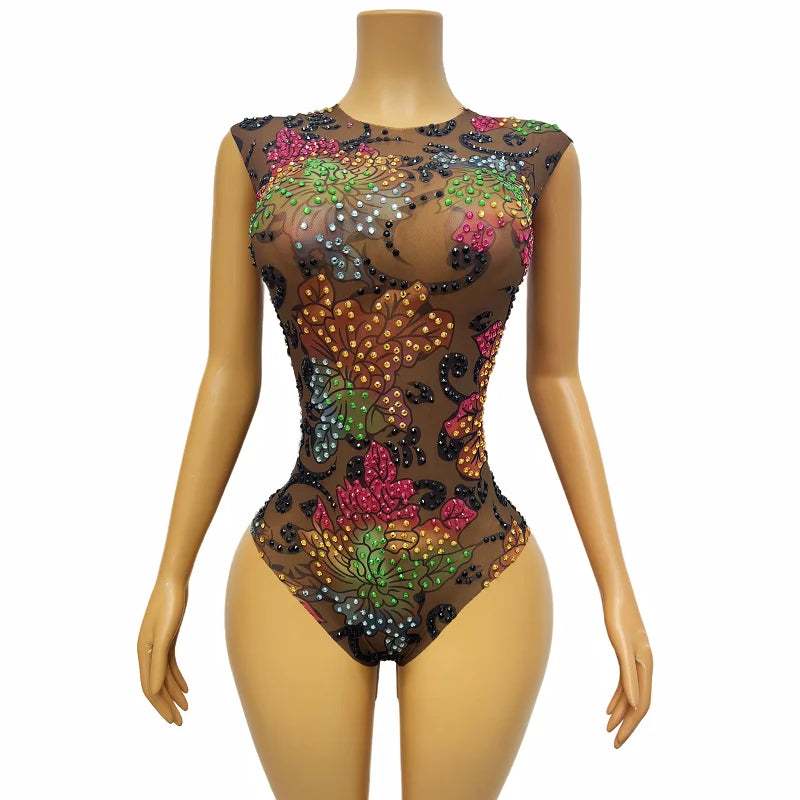 Get ready to stand out in this sexy and vibrant jumpsuit! Adorned with colorful rhinestone flowers and a transparent design, this sleeveless bodysuit is perfect for birthday celebrations, evening events, or dance performances. Make a bold statement and steal the show in this stunning ensemble.