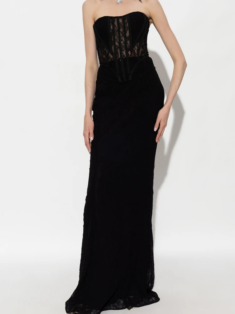 Turn heads in this sexy and elegant two-piece set for women. The set includes a black strapless lace mesh corset top paired with a bodycon maxi skirt in a matching style. Perfect for elegant parties and special occasions, this set exudes sophistication and allure, making you the epitome of style and grace. Stand out with this stylish ensemble that showcases your confidence and fashion-forward taste.