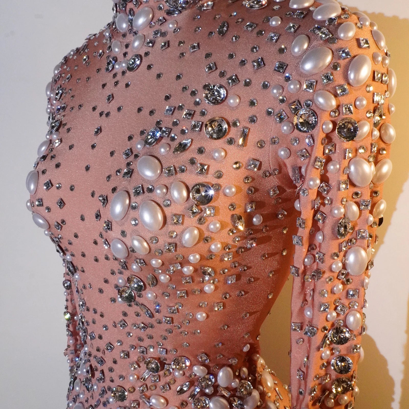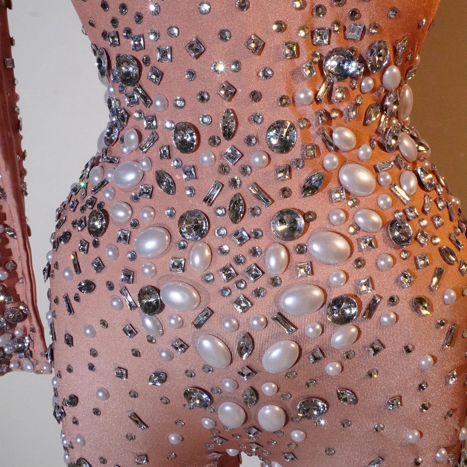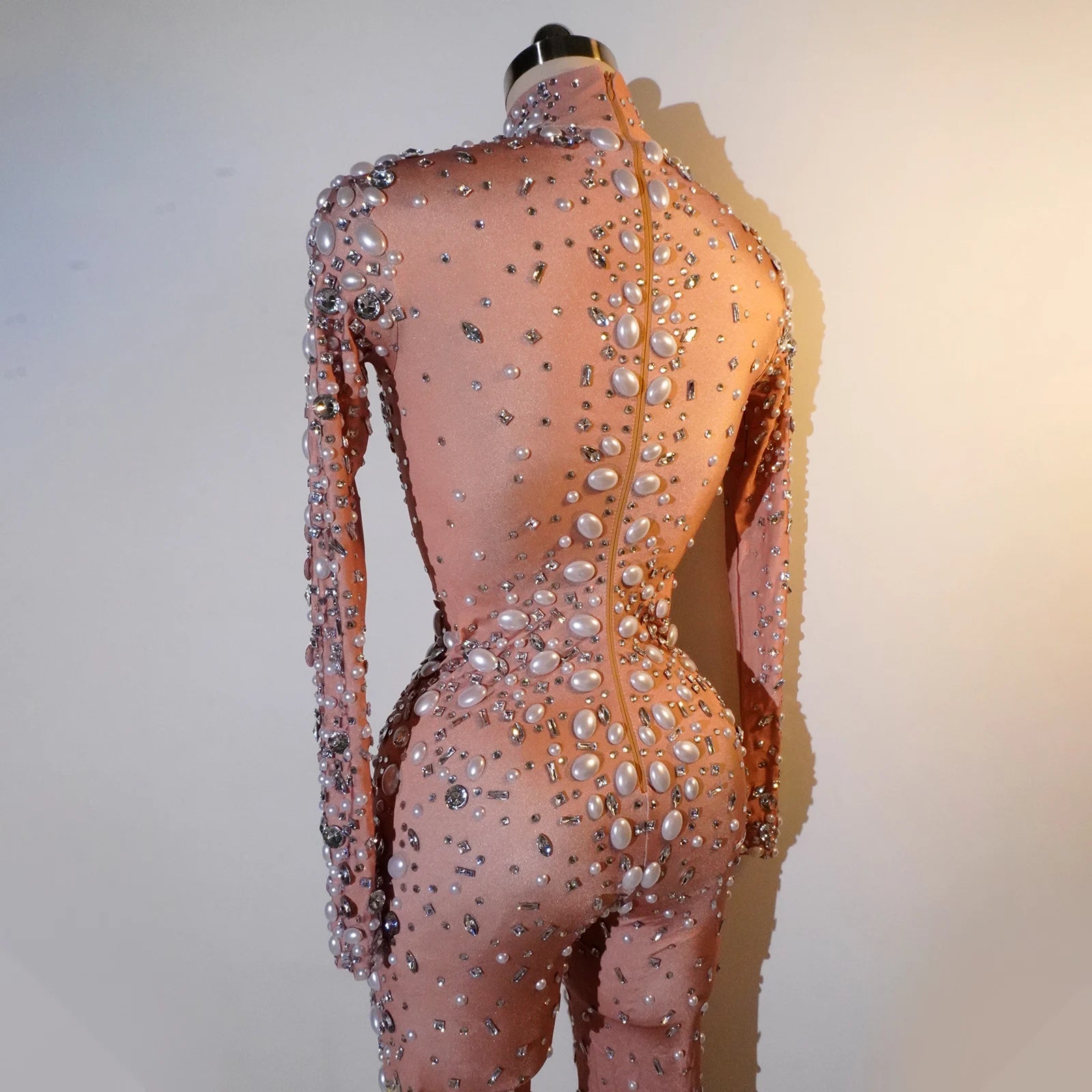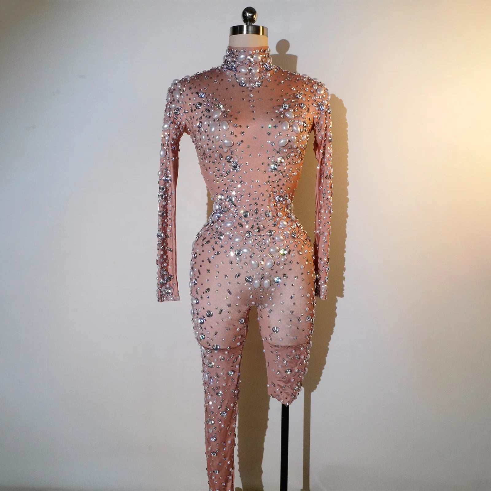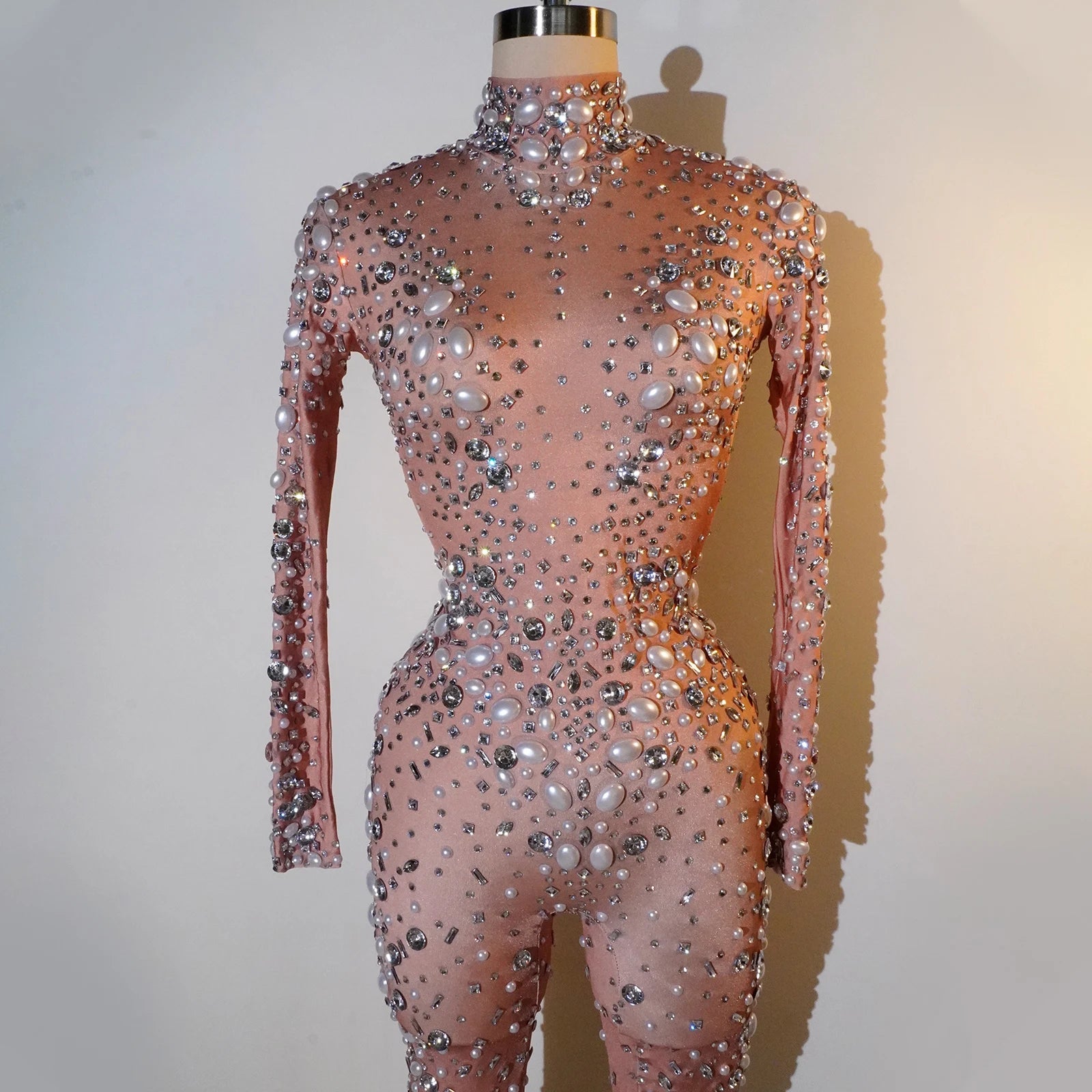 Command the stage in our Sexy Fashion Jumpsuits, designed for those who dare to shine. Featuring a nude base adorned with dazzling rhinestones and pearls, these stunning bodysuits are perfect for drag queen shows, parties, bars, and nightclubs. The body-hugging silhouette enhances your curves while providing unparalleled comfort for movement and performance. Ideal for female singers and performers looking to make a bold statement, these jumpsuits shine under the lights and ensure all eyes are on you. Elevate your style and showcase your unique flair with this eye-catching stage wear!