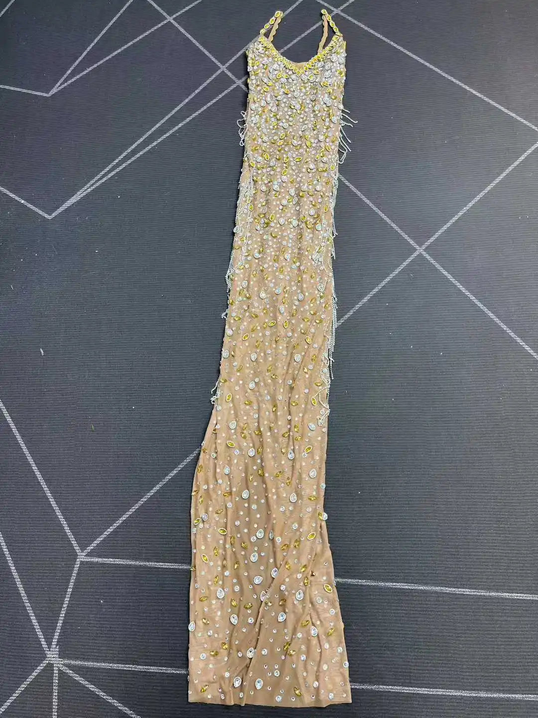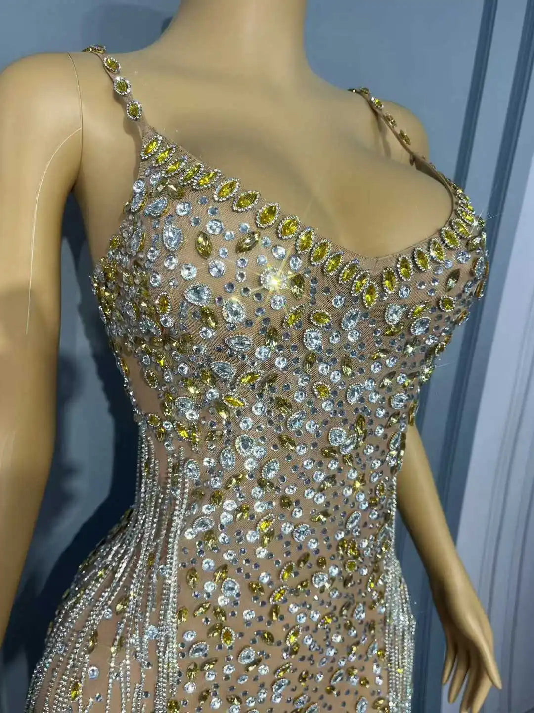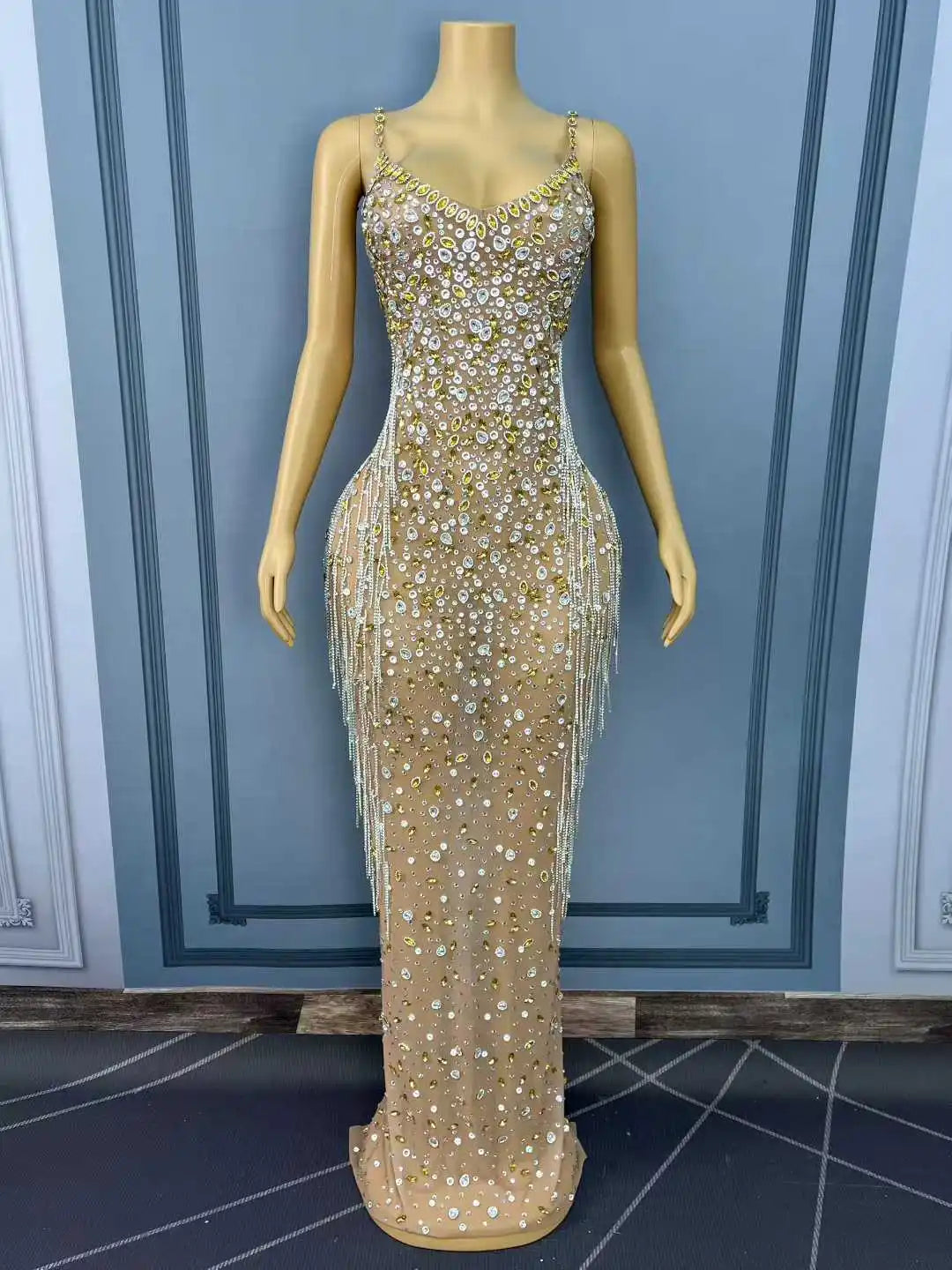 Make a bold, unforgettable entrance with this Sexy Flashing Rhinestones Crystals Chains Nude Mesh Suspenders Dress — a statement-making gown that blends daring illusion with luxe sparkle and edgy hardware for parties, red carpets, photoshoots, and high-energy stage performances.