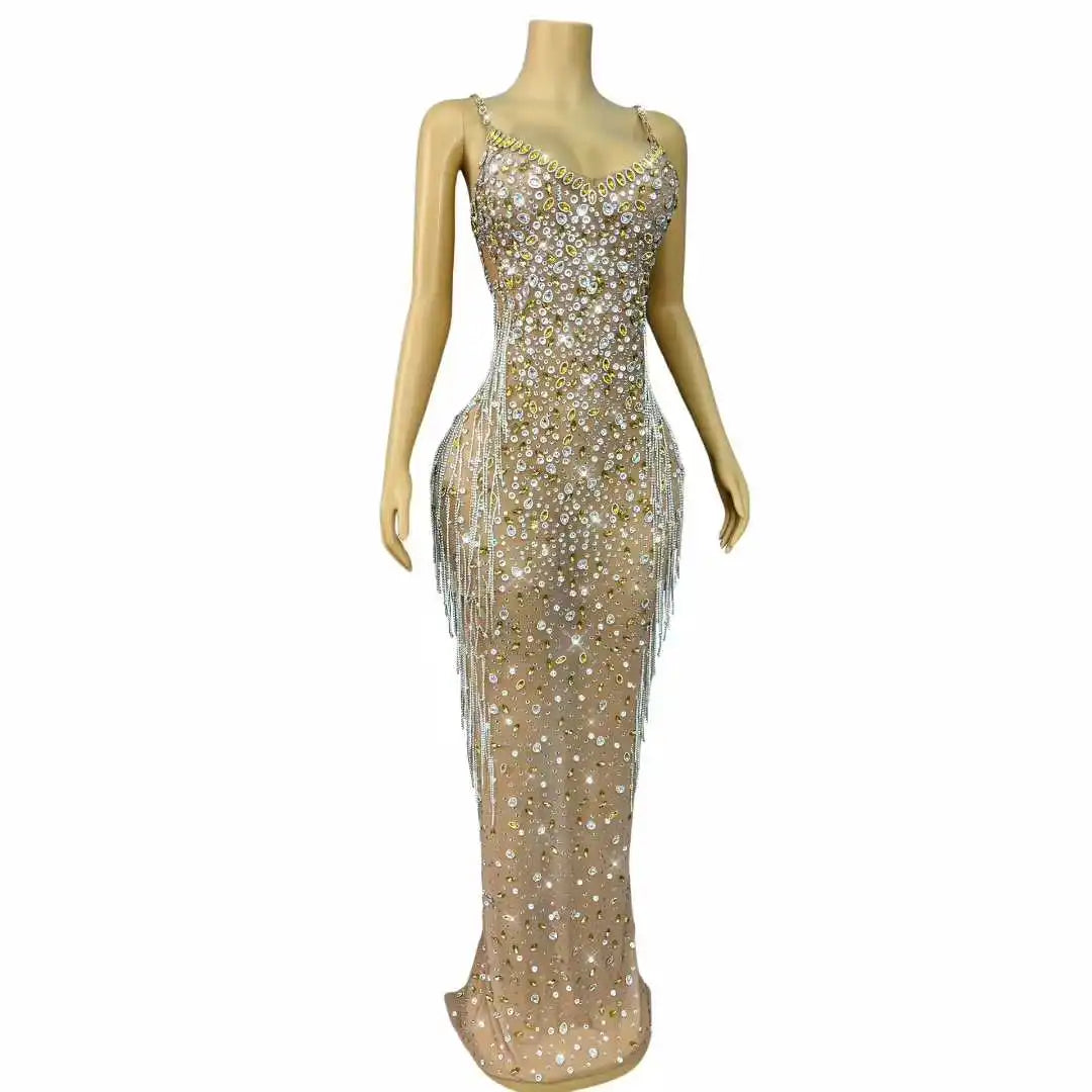 Sexy Flashing Rhinestines Crystals Chains Nude Mesh Suspenders Dress Women Party Celebrate Evening Red Carpet Gowns Stage Wear