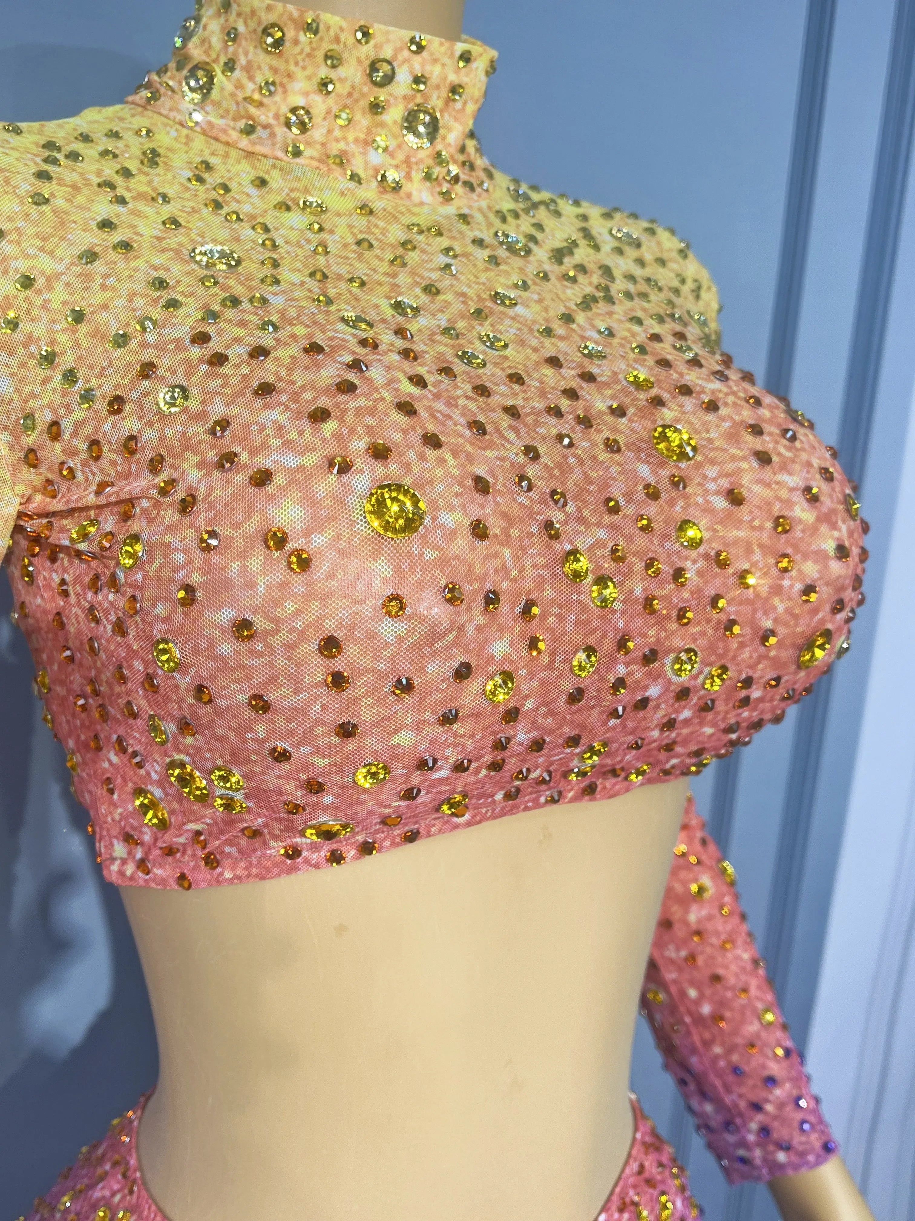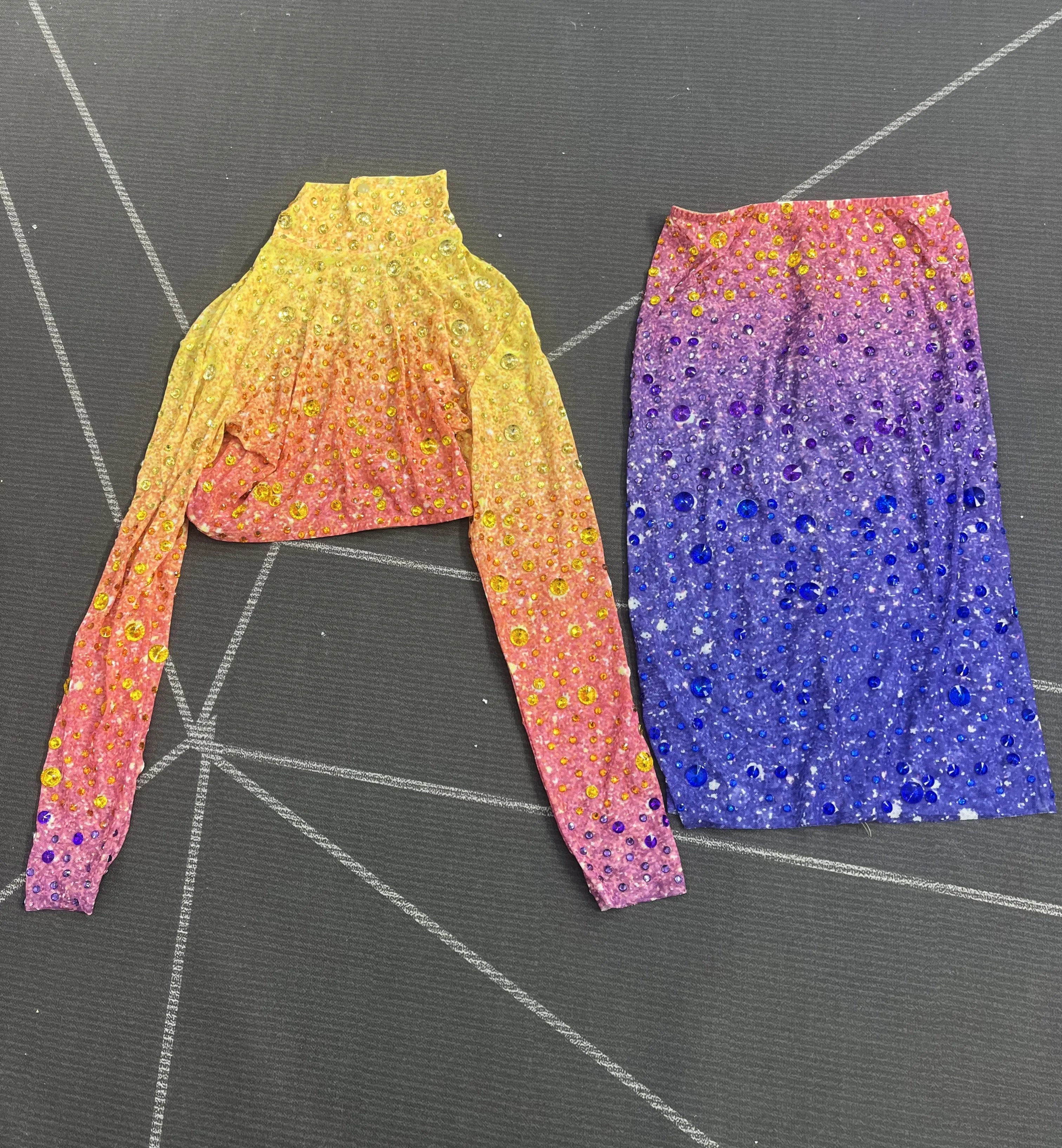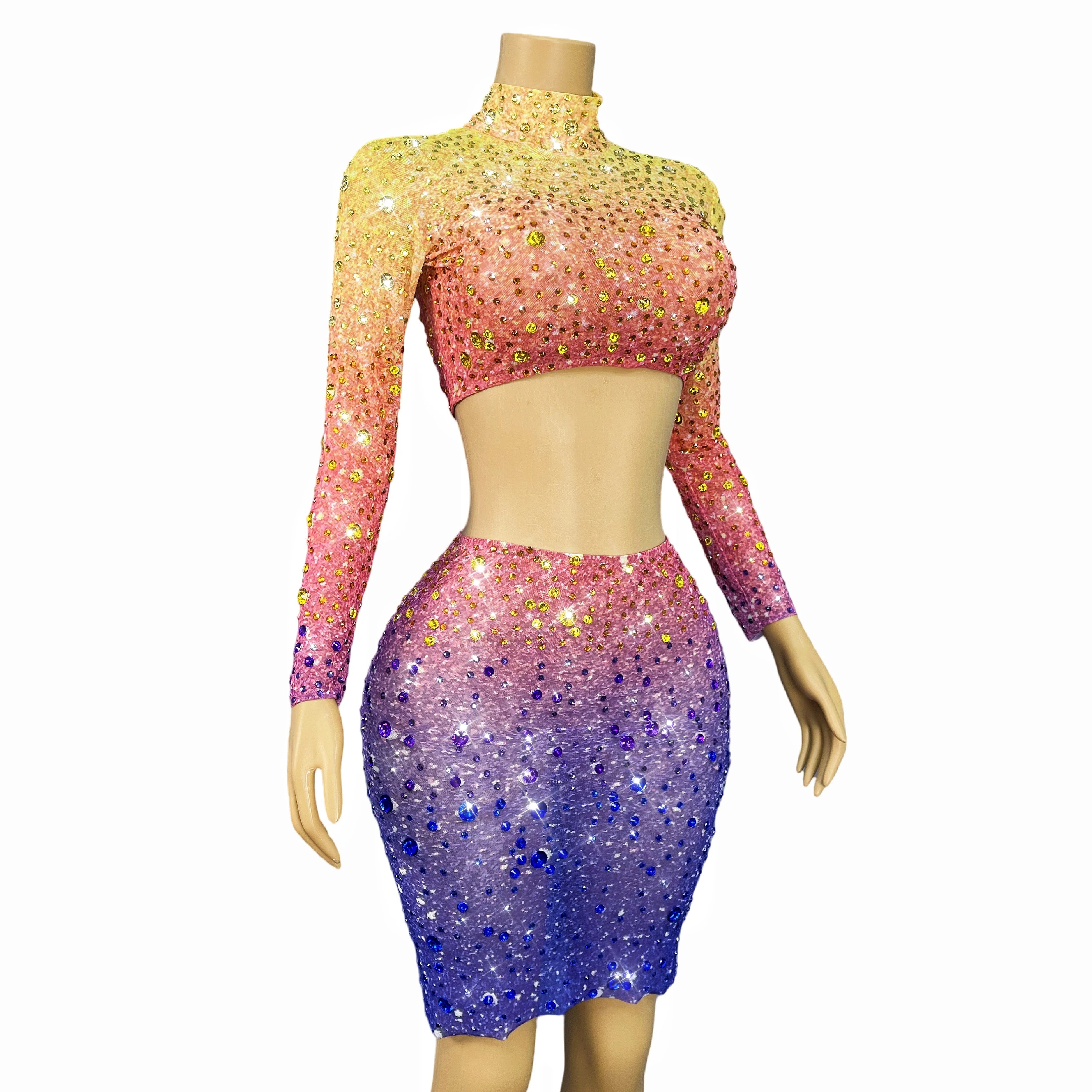 Shine from every angle in this Sexy Gradient Color Sparkly Rhinestones Top & Skirt Set — a performance-ready two-piece designed for birthday celebrations, photoshoots, stage appearances, and nightlife. Featuring a gradient rhinestone ombré, hollow waist detail, and a dramatic thigh split, this coordinated set blends sultry silhouette with high-impact sparkle.