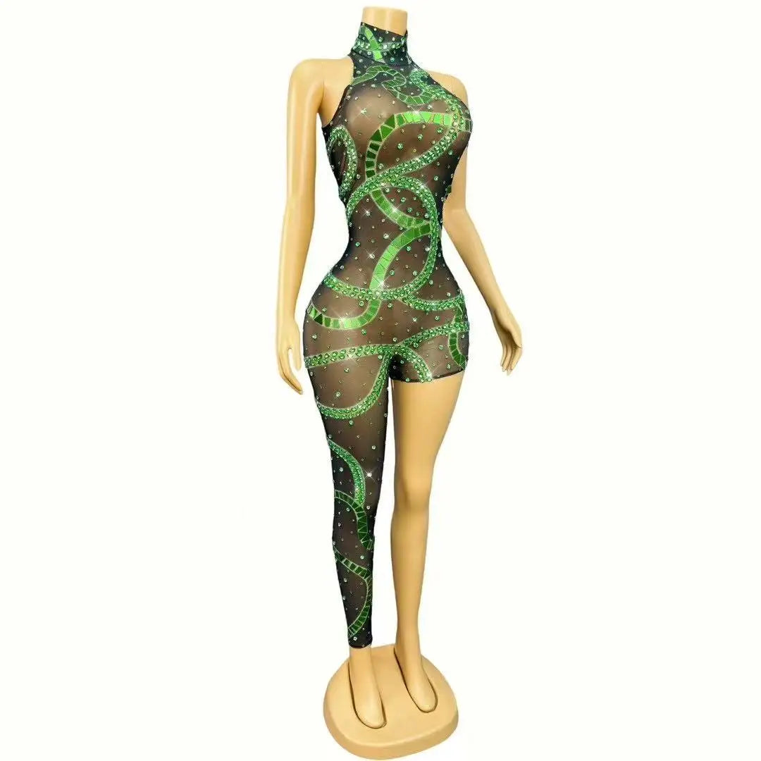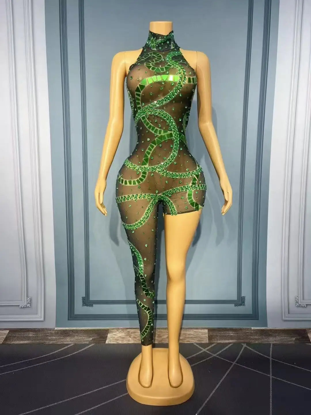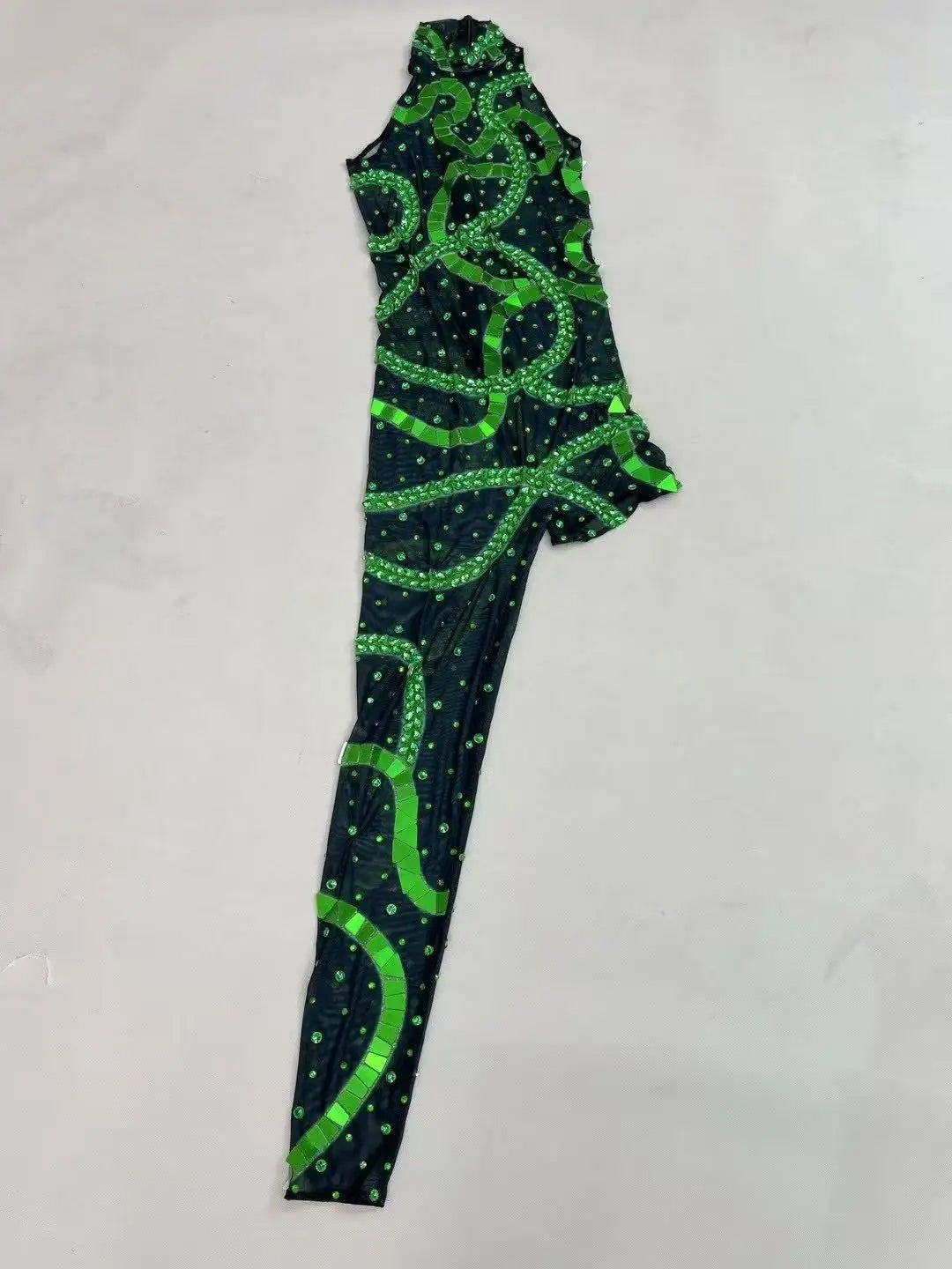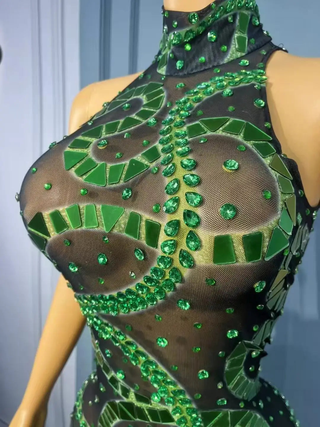 A high‑impact, couture-inspired mesh bodysuit featuring irregular rhinestone and mirror placements for an artful, reflective flash. Designed for singers, dancers, performers, and party looks, this piece uses asymmetric geometry and mixed reflective elements to create dynamic sparkle under stage lights and camera flashes.