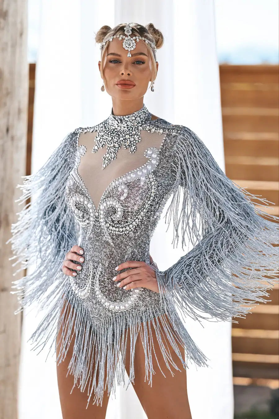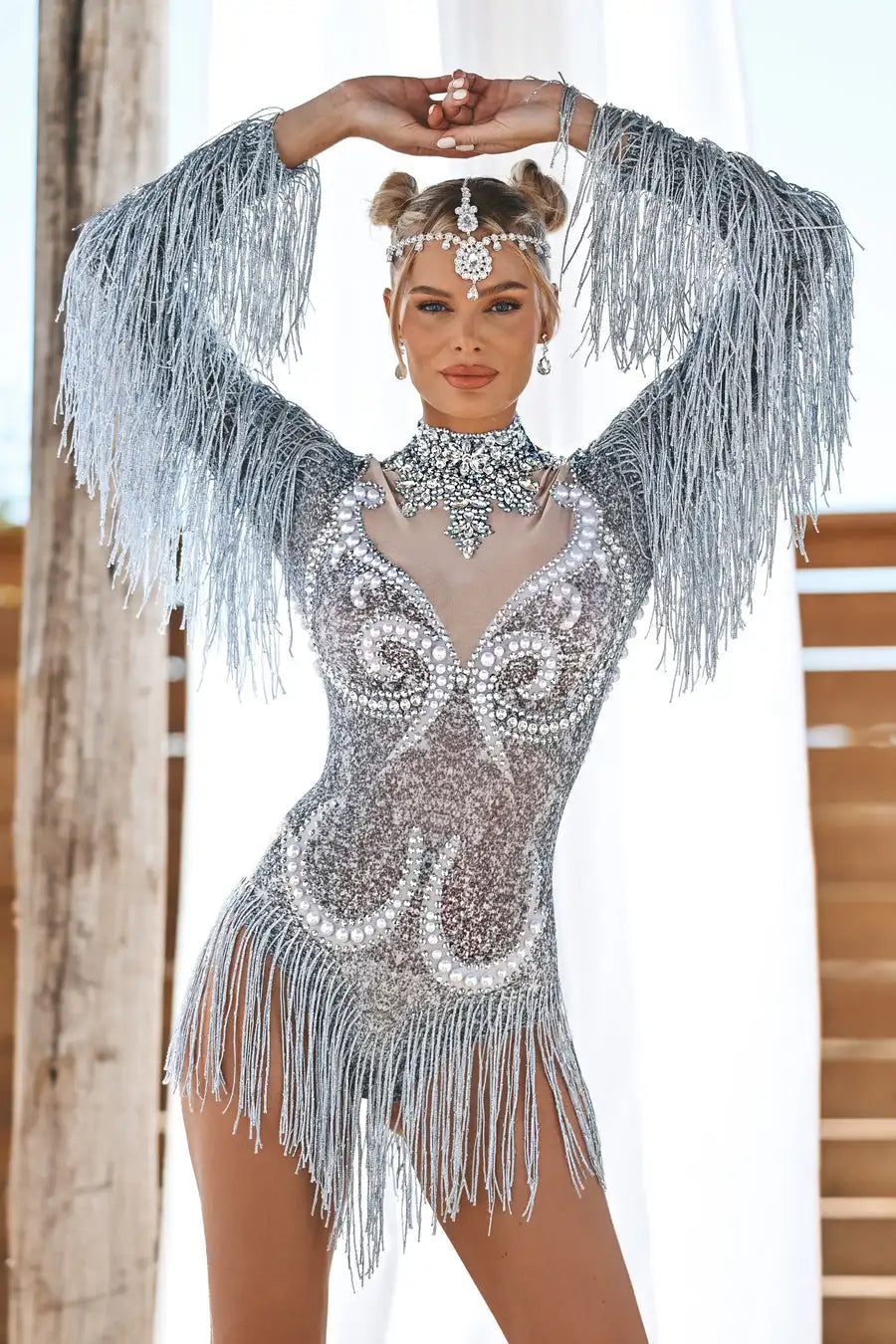 Turn heads in our Sexy Long Sleeves Tassel Pearls One-Piece Short Jumpsuit! This stunning women's dancewear is designed for strip shows and stage performances, combining elegance and allure. Adorned with beautiful rhinestones and playful tassels, this bodysuit highlights your curves while allowing for freedom of movement. Elevate your performance and make a lasting impression with this captivating outfit that exudes confidence and sophistication!