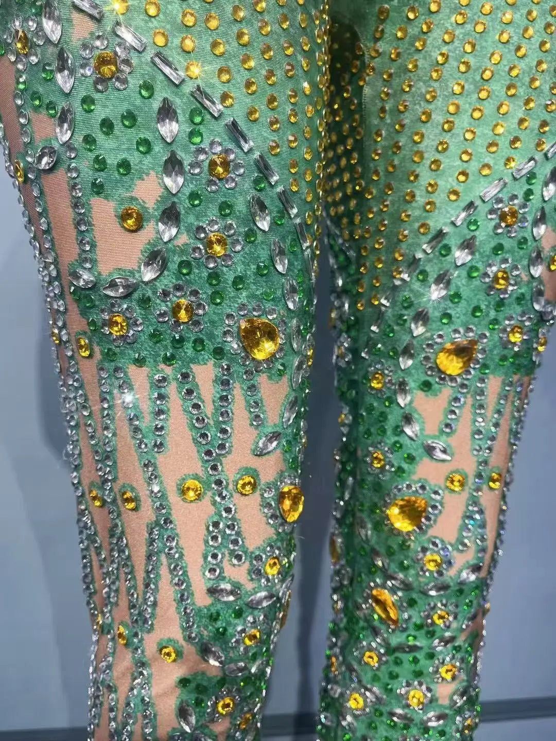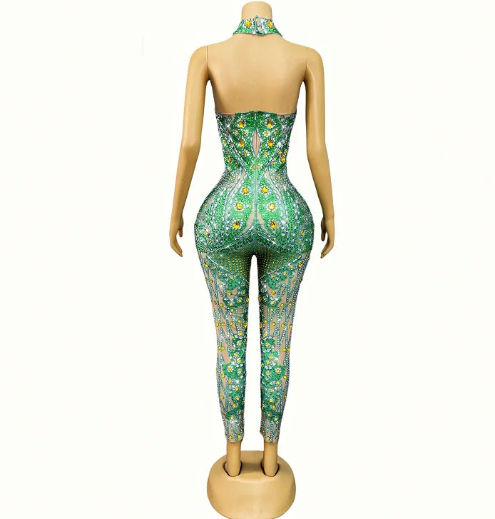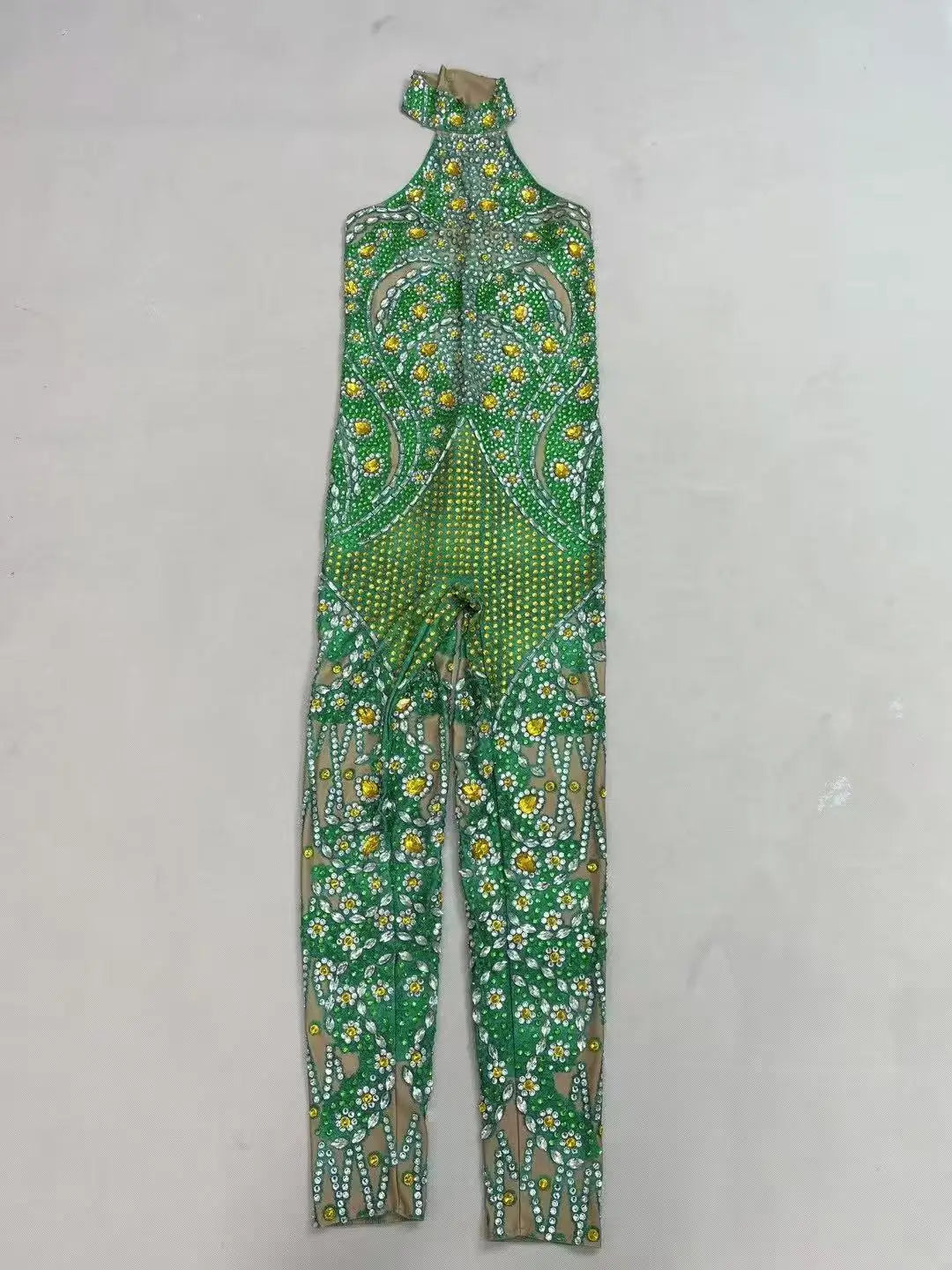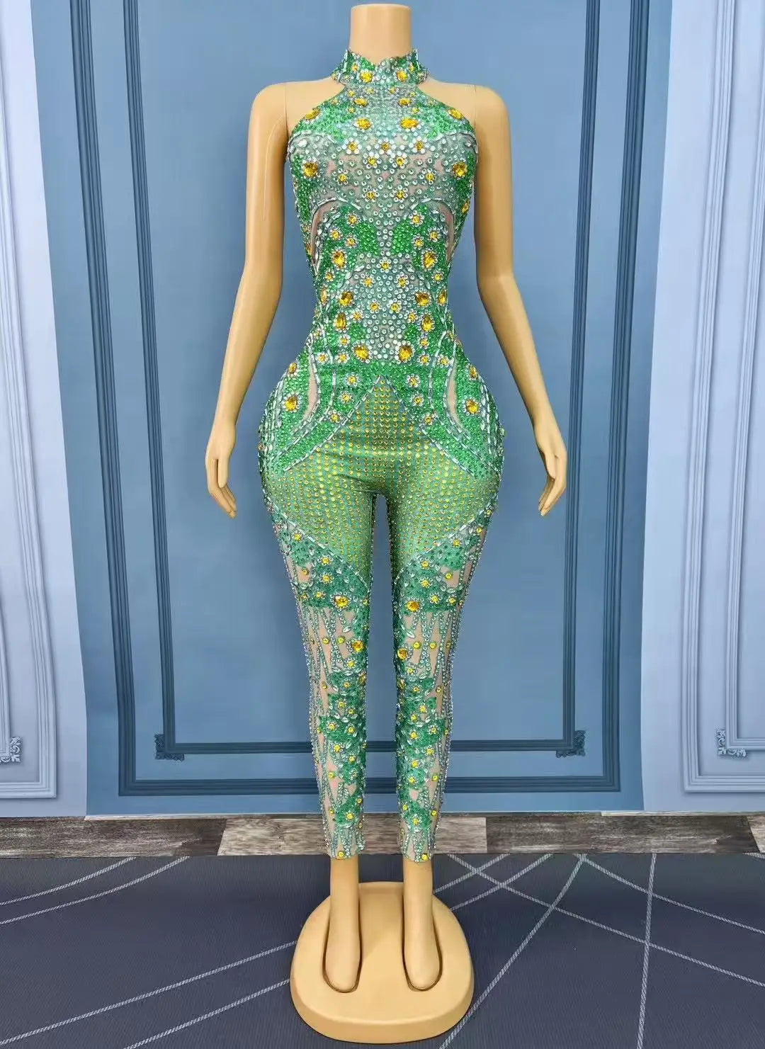 - Step into show-stopping glamour with this Luxury Sparkly Rhinestone Jumpsuit. Tailored from a stretch performance base and lavishly embellished with hand‑set rhinestones and micro crystals, the piece sculpts the silhouette while catching every light. Functional performance details—reinforced seams, breathable lining, secure closures, and optional internal support—make it stage‑ready for singers and dancers. Variants include long sleeves, plunging V, high-neck, flared legs, or fitted tapered legs for different performance aesthetics.