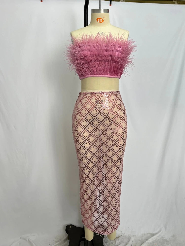 Step into the spotlight with this sexy and luxurious two-piece set for women that exudes glamour and style. The set features a strapless top adorned with shimmering sequins and feather detailing, paired with a bodycon skirt featuring sequins and mesh splice in a striking white and black color scheme. The off-shoulder design adds a touch of allure and sophistication to the ensemble, making it perfect for special occasions, cocktail parties, or glamorous events. The combination of sequins, feathers, and mesh creates a high-fashion look that will make you the center of attention. Make a statement with this chic and stylish outfit that exudes elegance and confidence, ensuring you shine bright and stand out in any fashionable setting.