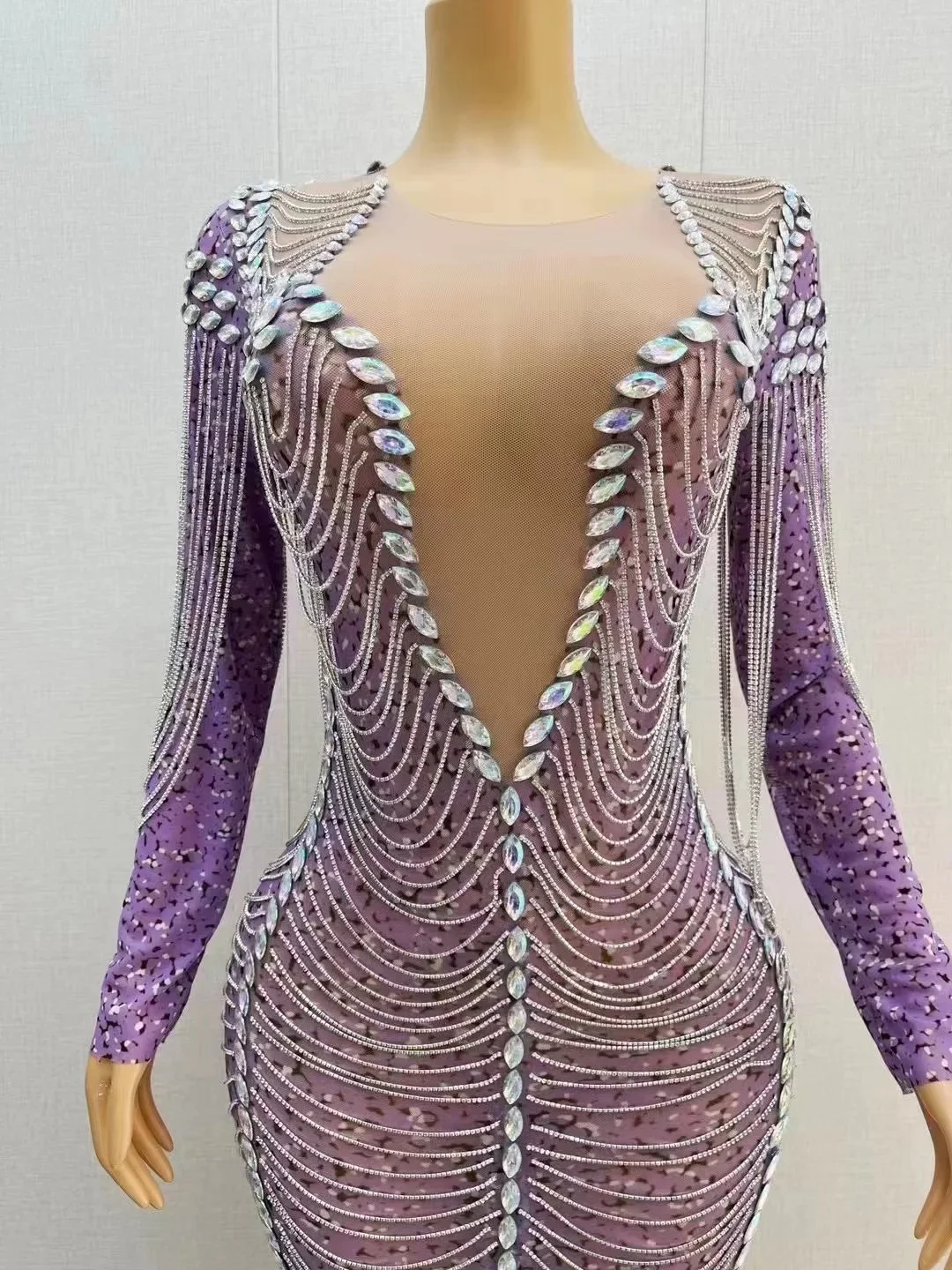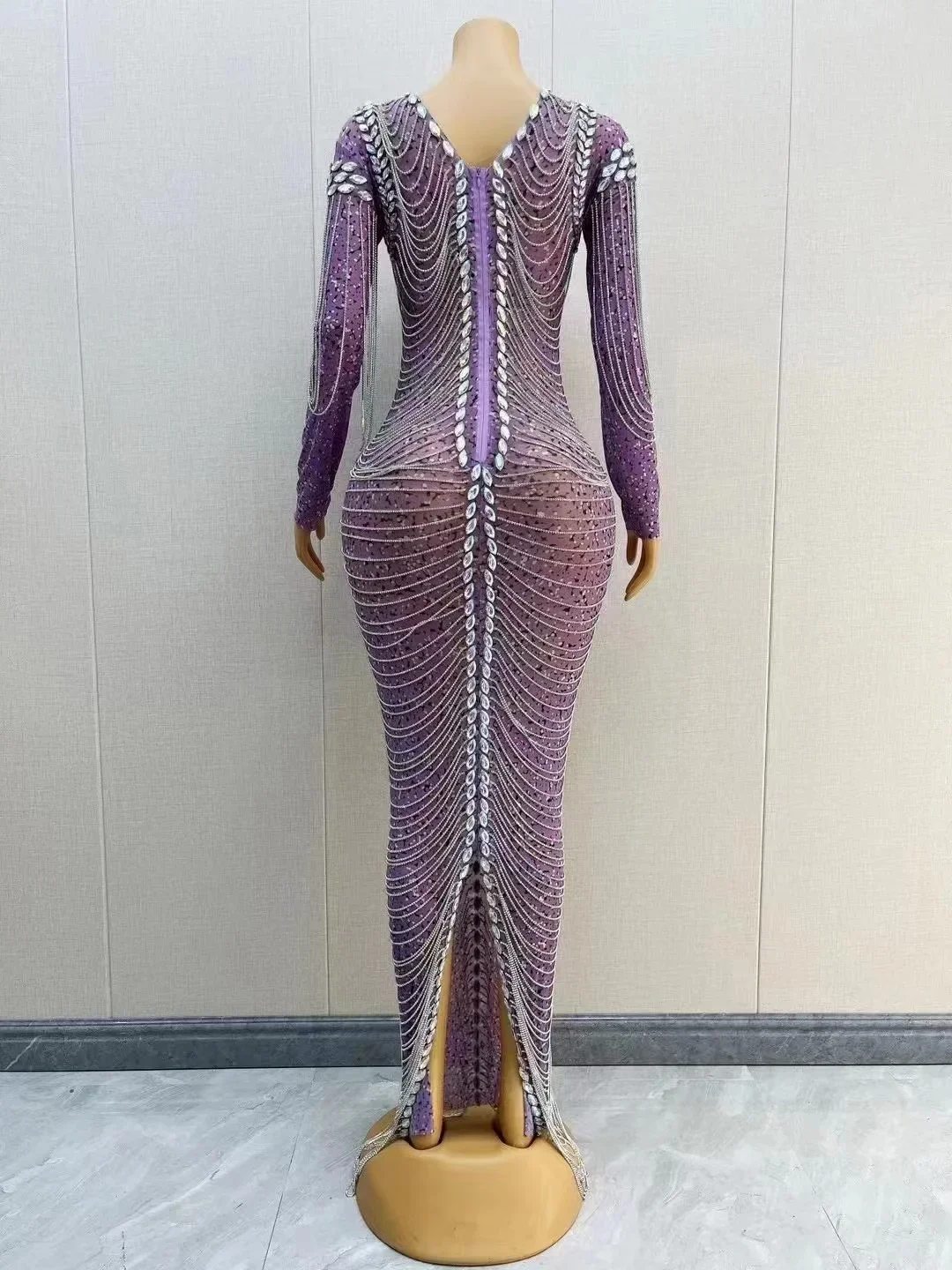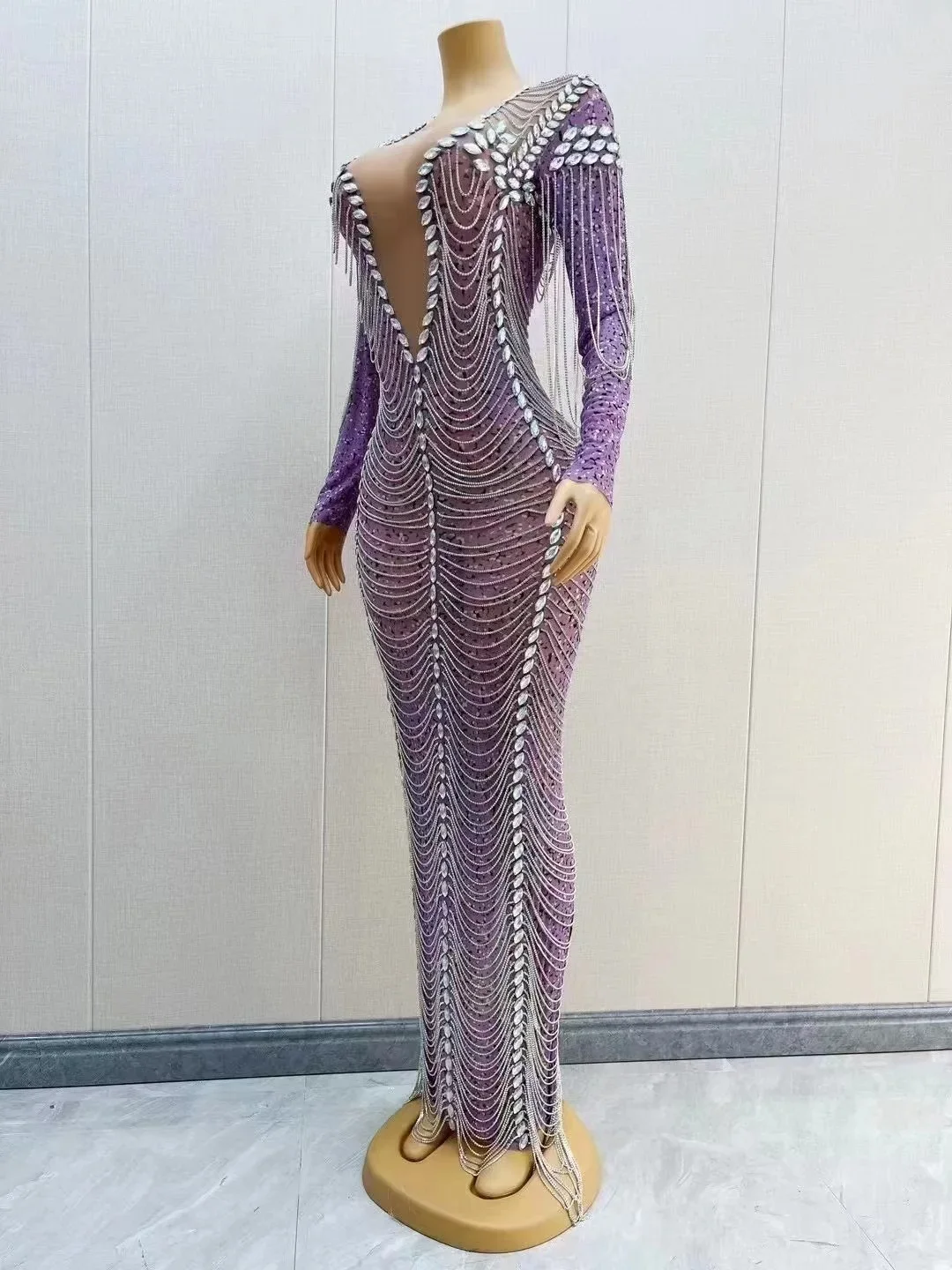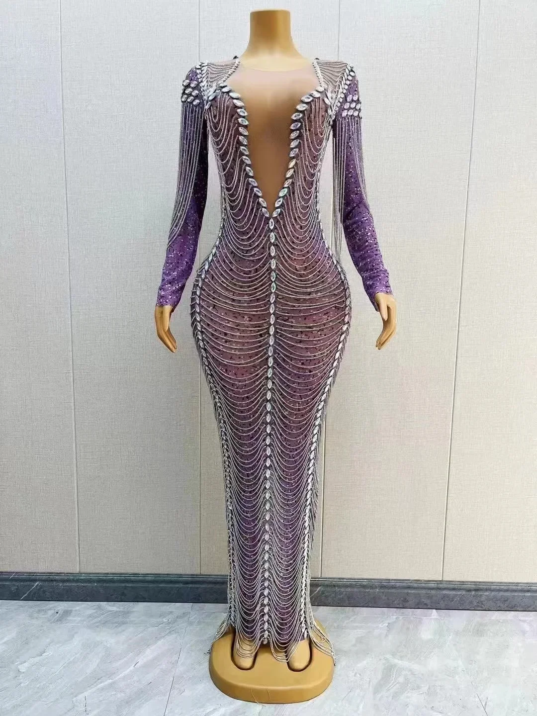 Sexy Maxi Dress Evening Party Performance Costume Sparkly Rhinestones Chain Women Long Sleeve Bar Singer Stage Wear