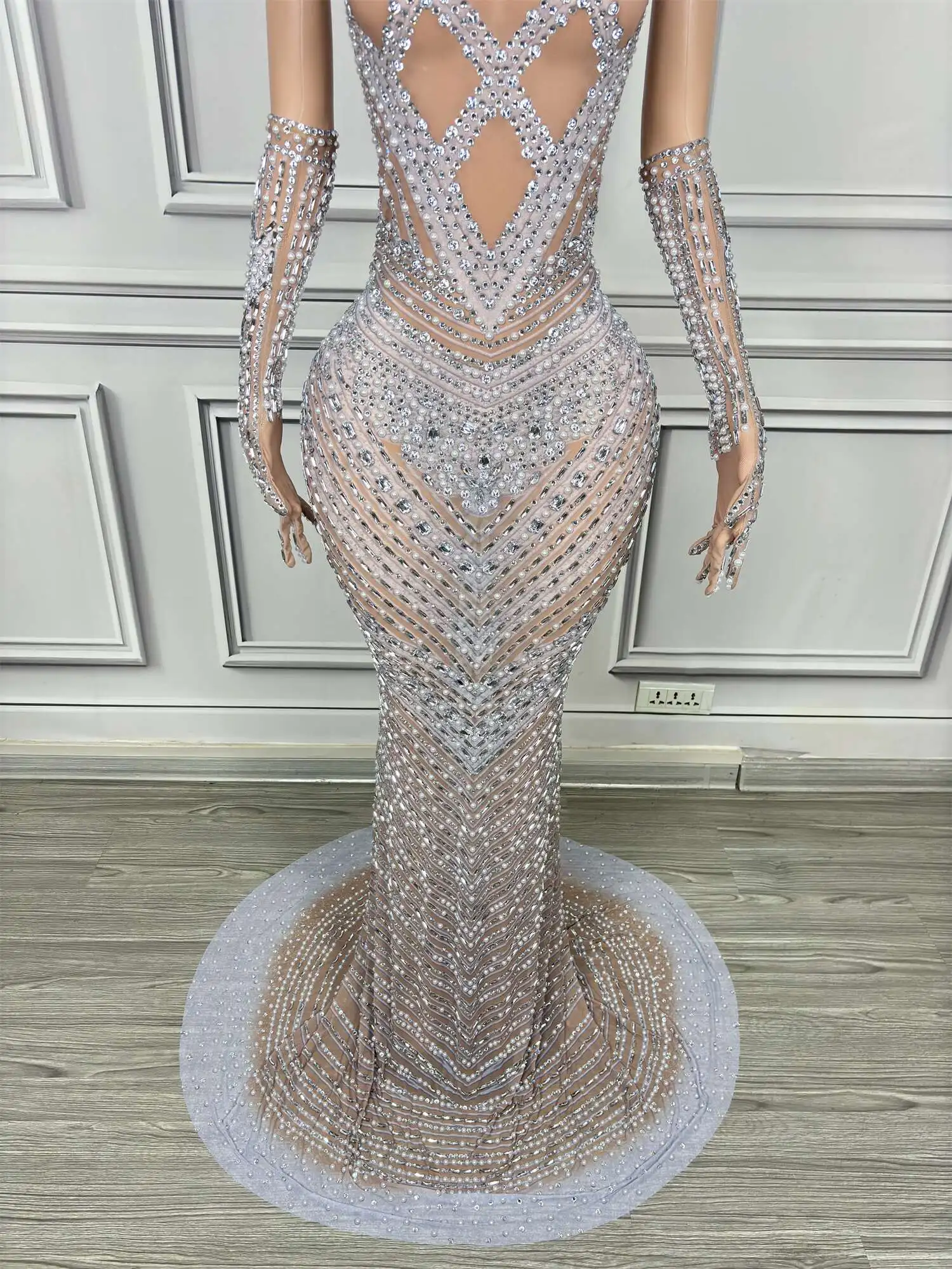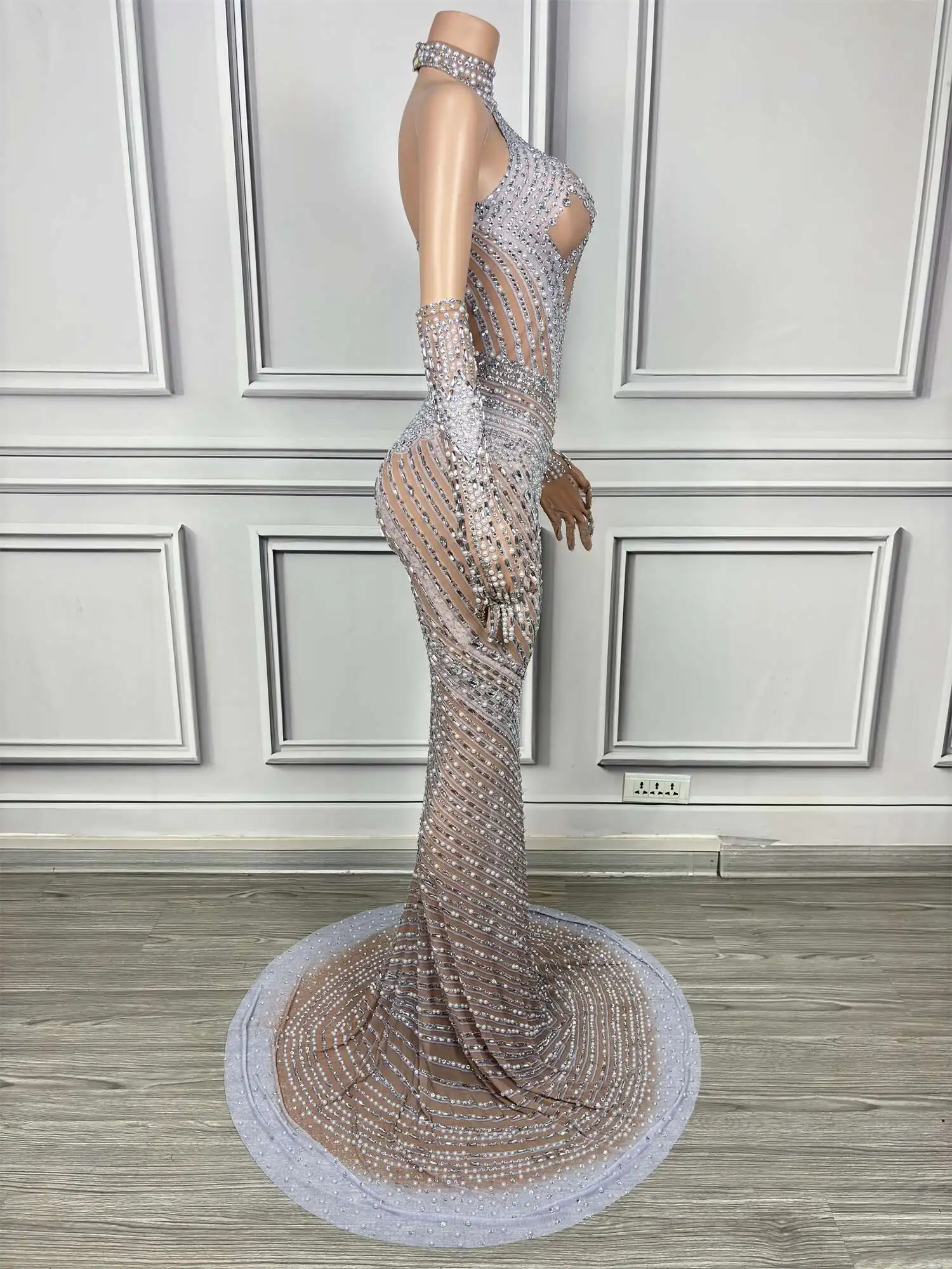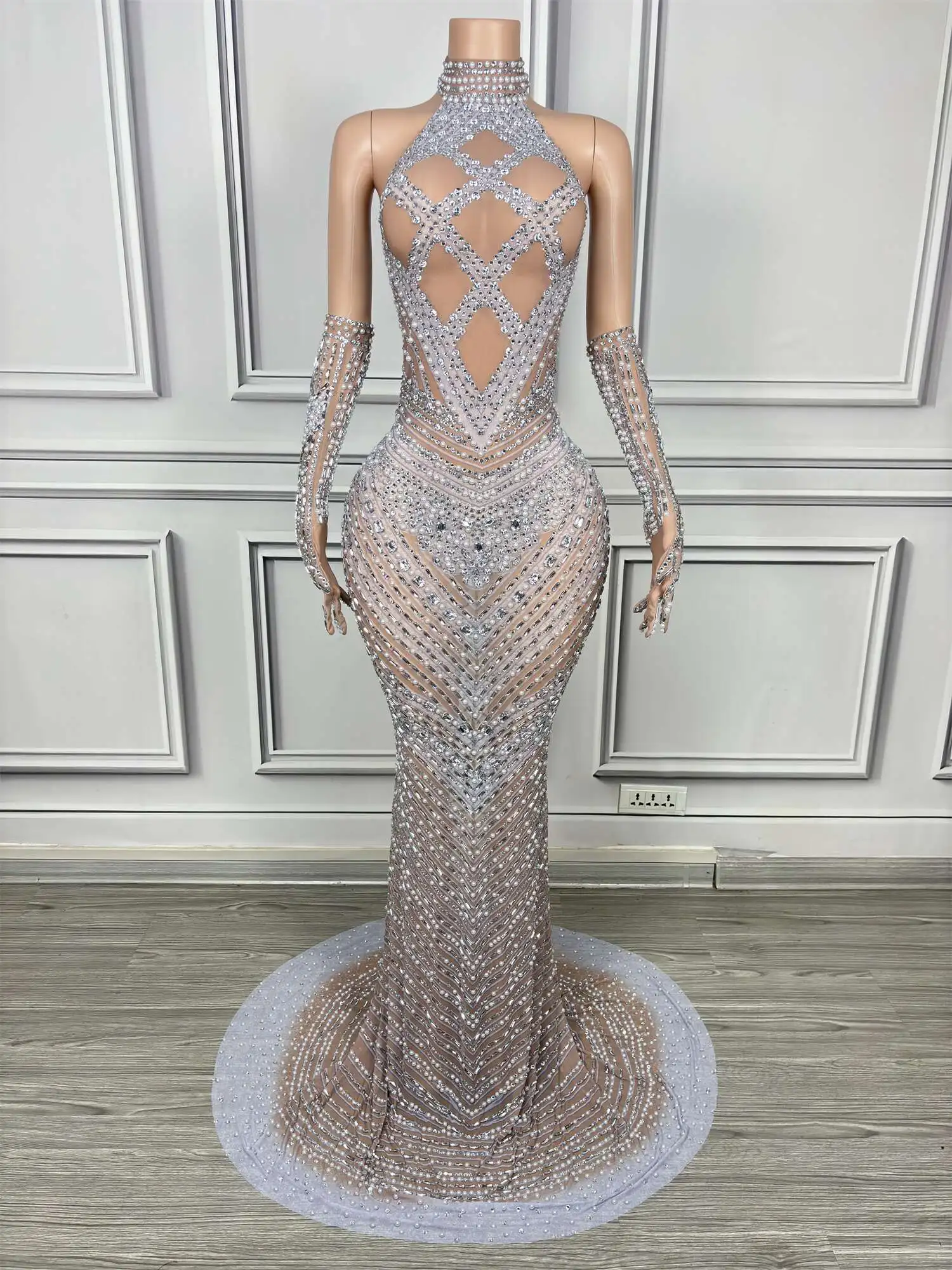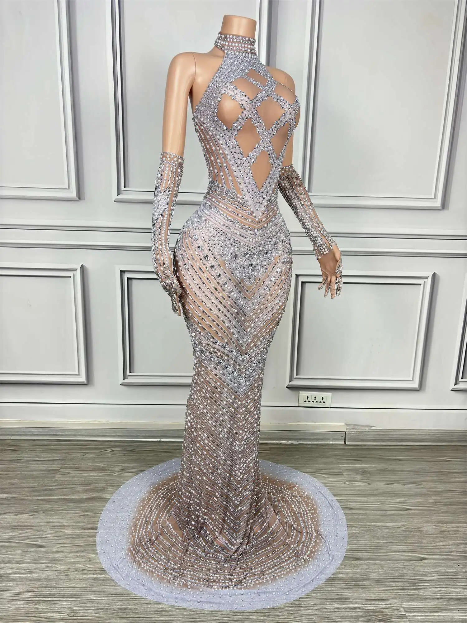 Sexy Mermaid Style Fitted Women Prom Formal Gowns Luxury Sparkly Silver Diamonds Black Girls Long Prom Dresses 2024 Renyugongzhu