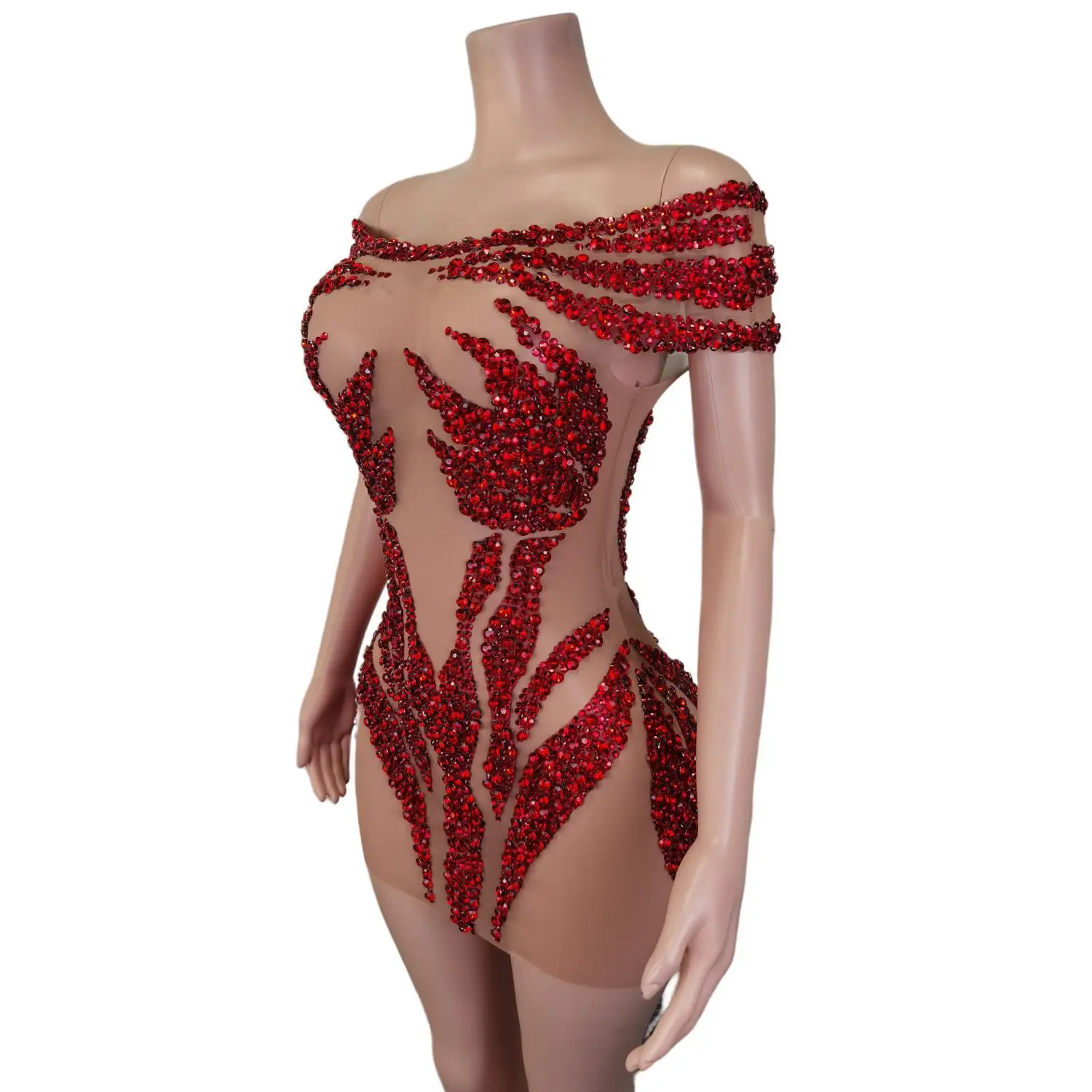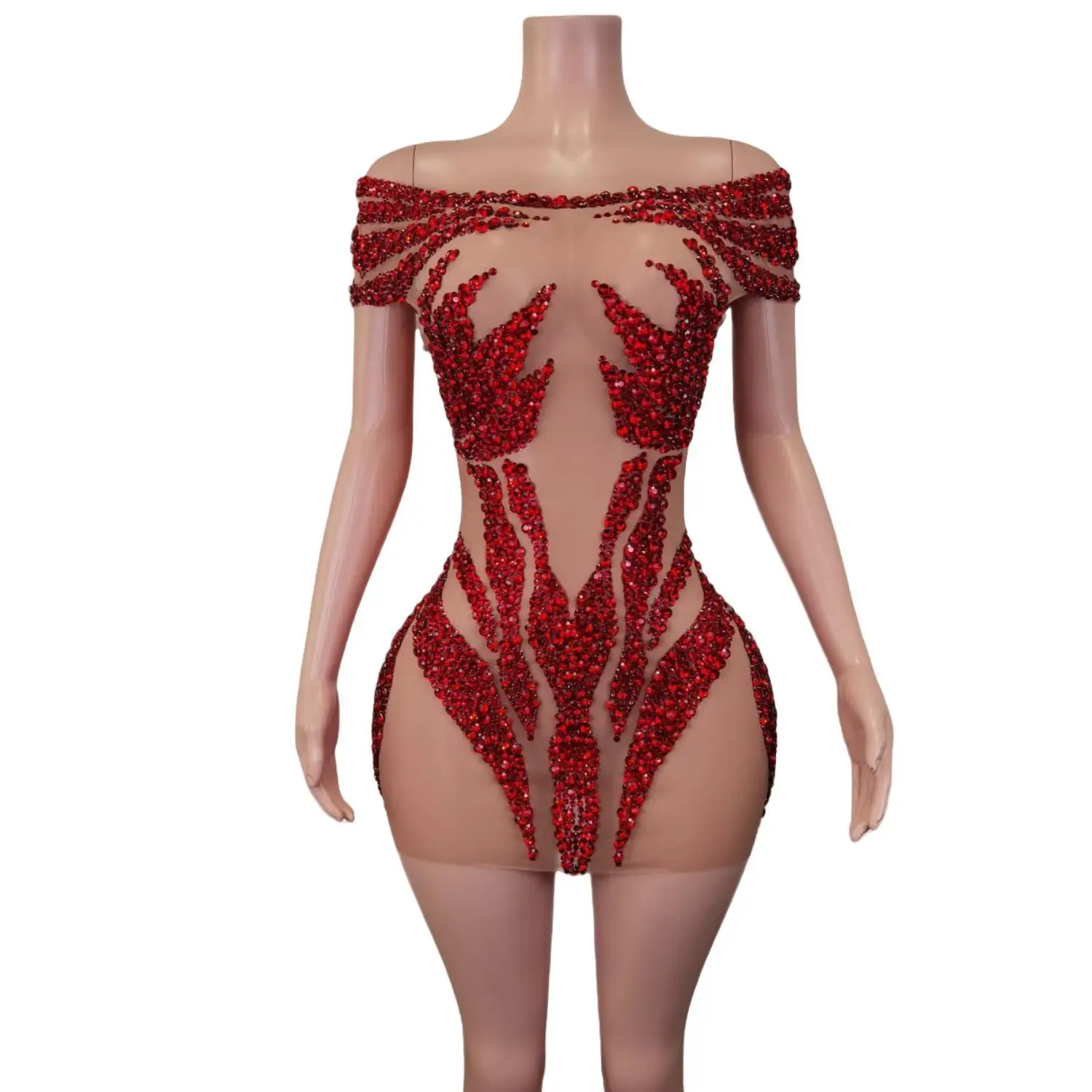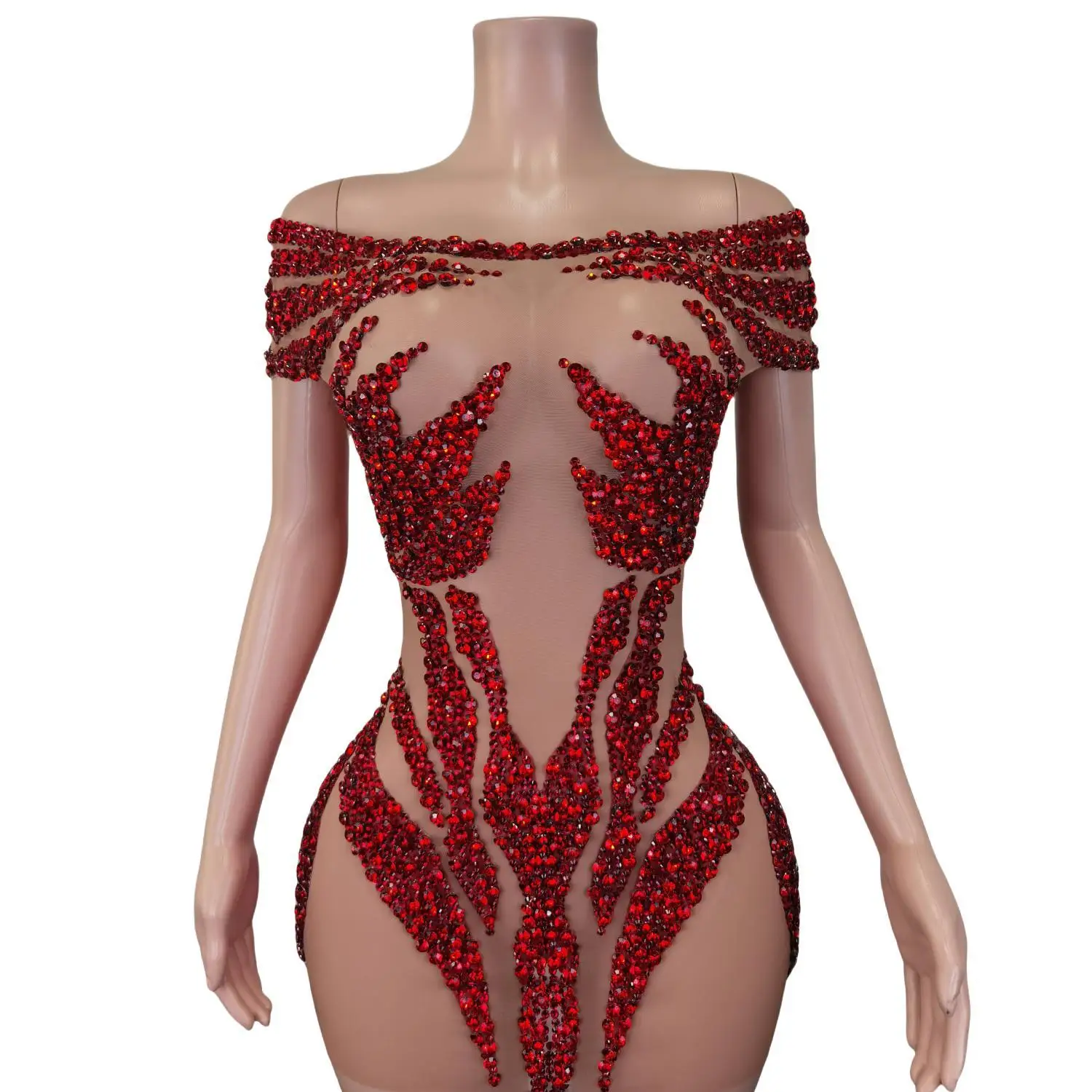 Sexy Mesh Party Celebrate Birthday Off Shoulder Dress Sparkly Rhinestones Dress Women Photo Shoot Wear Stage Costumes Xuelian