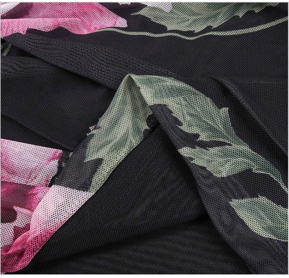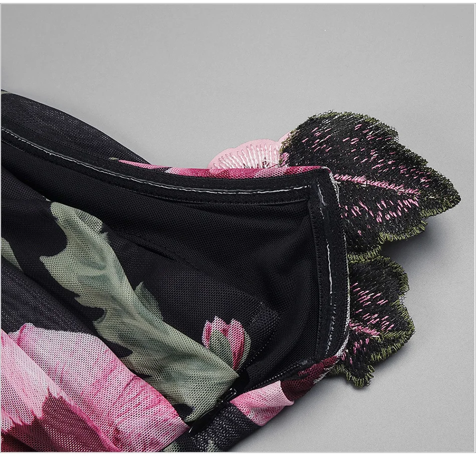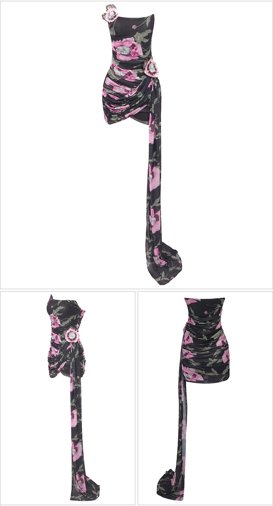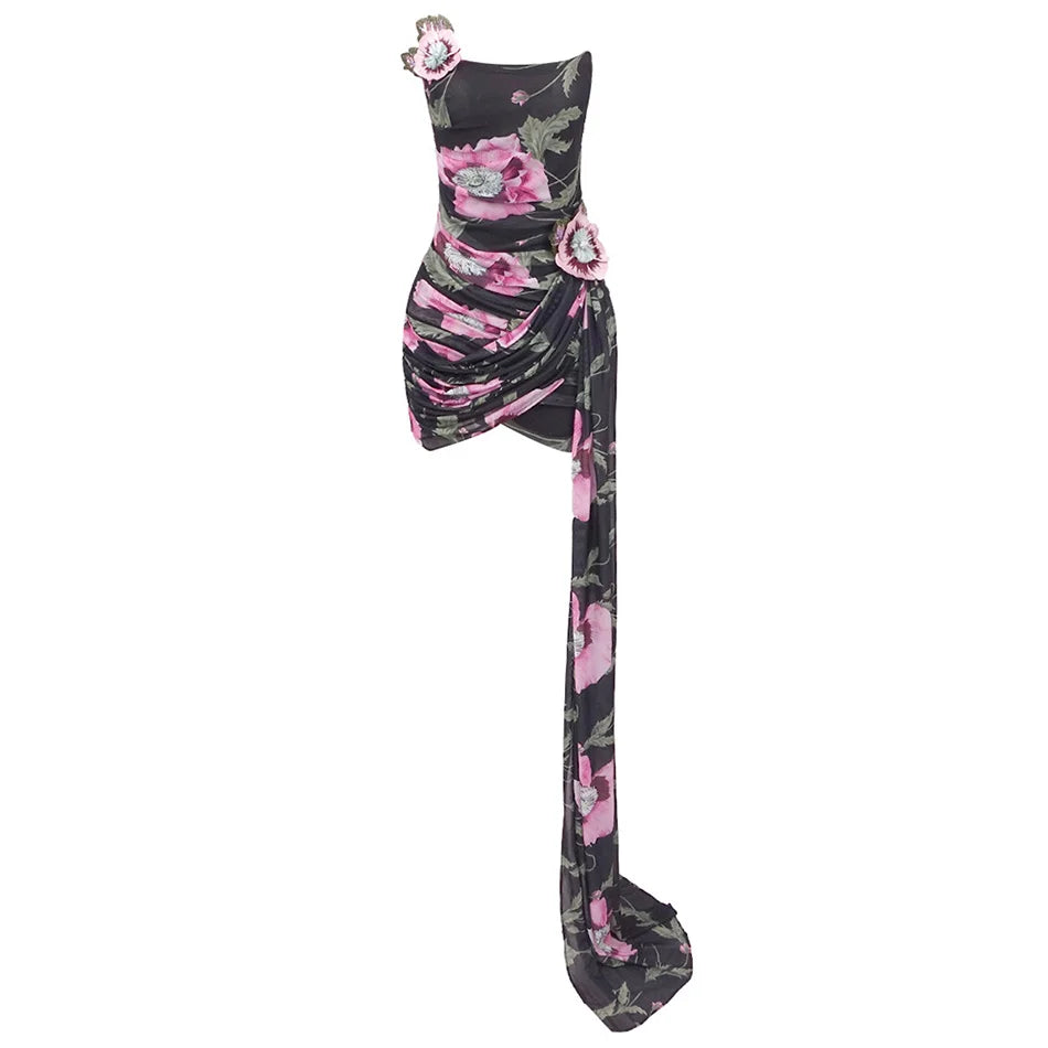 Sexy Mesh Printed Strapless Embroidered Flower Pleated Irregular Ribbon Mini Bodycon Party Dress