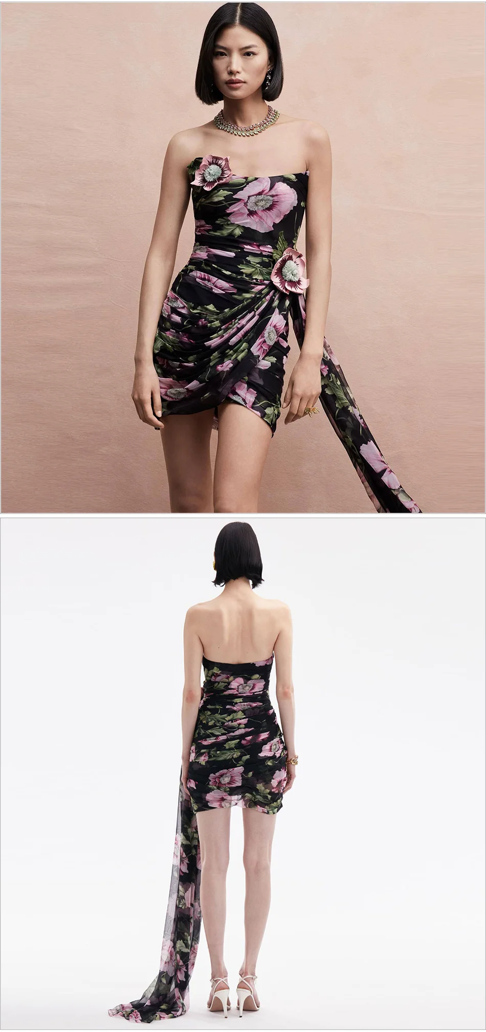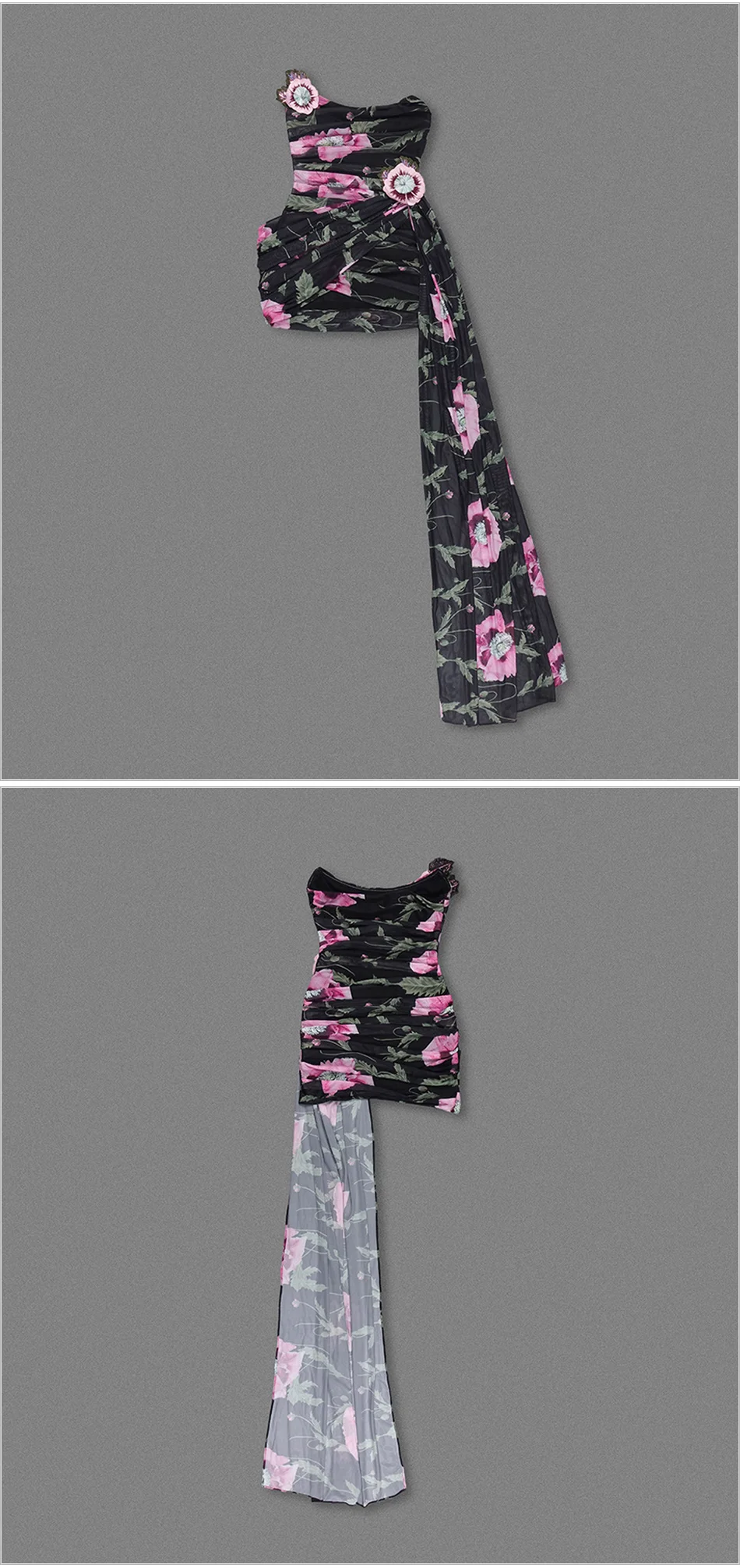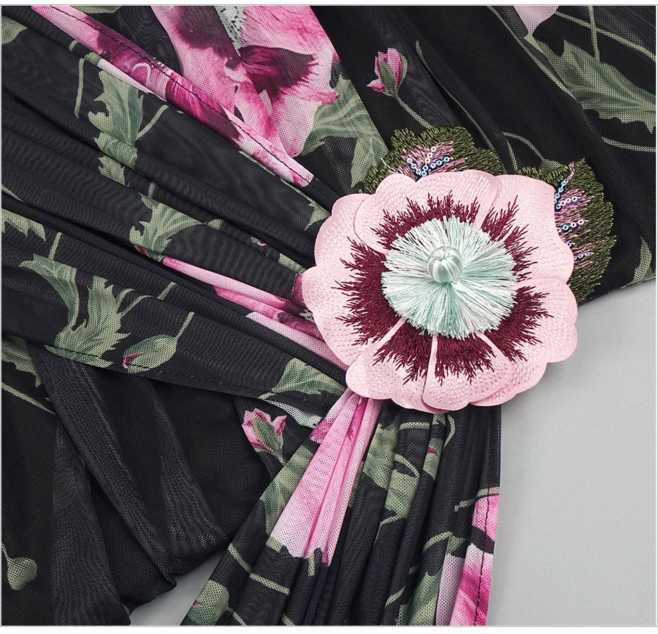 Sexy Mesh Printed Strapless Embroidered Flower Pleated Irregular Ribbon Mini Bodycon Party Dress