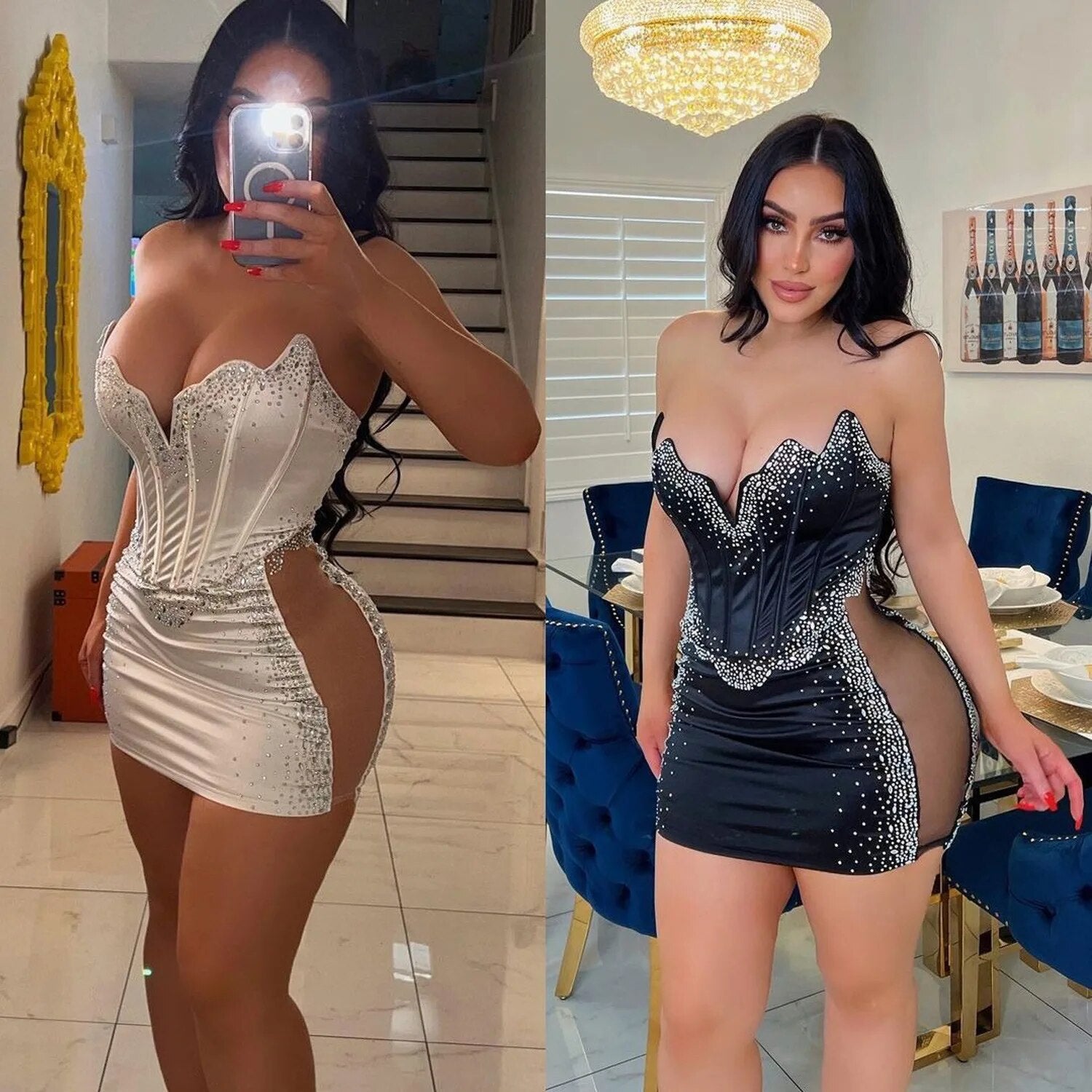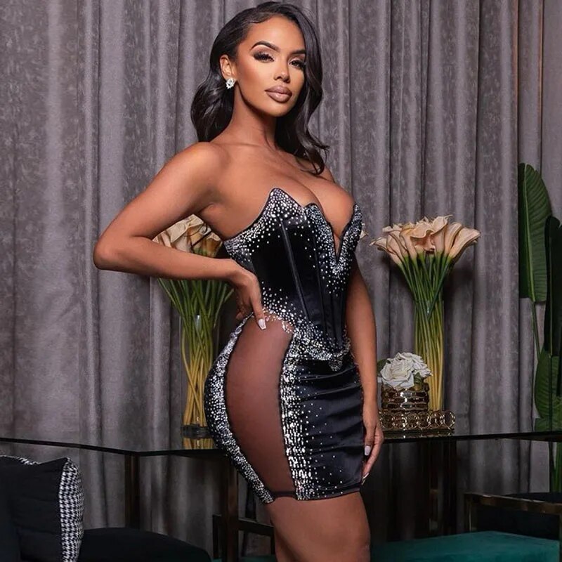 Sexy Mesh Rhinestone Short Prom Corset Dresses V Neck See Through Night Club Outfits Party Evening Bodycon Diamond Mini Dress
