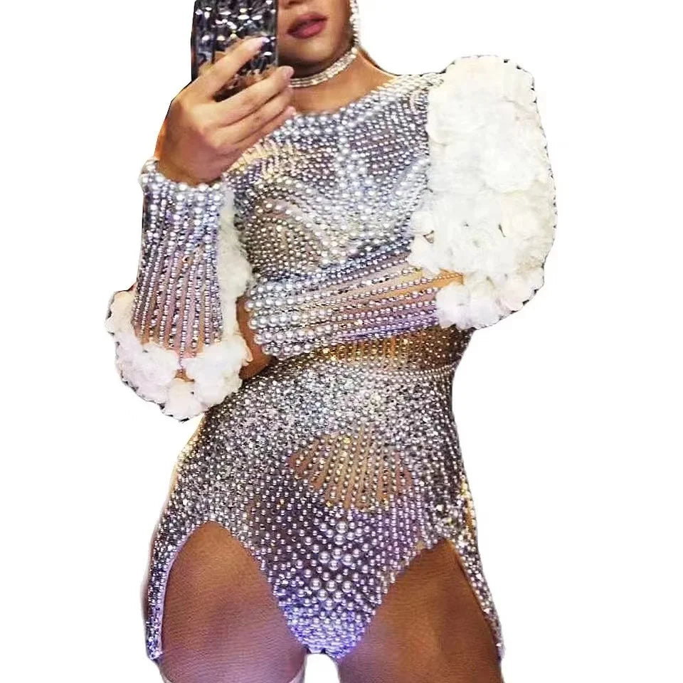 Elevate your stage presence with our stunning Women's Performance Leotard, adorned with exquisite super pearls and sparkling rhinestones. This eye-catching outfit features a beautiful floral design, perfect for singers and performers looking to make a statement. Crafted from high-quality stretch fabric, it ensures a comfortable fit while allowing for freedom of movement. Ideal for stage wear, this leotard combines elegance and flair, making it a must-have for any performer.