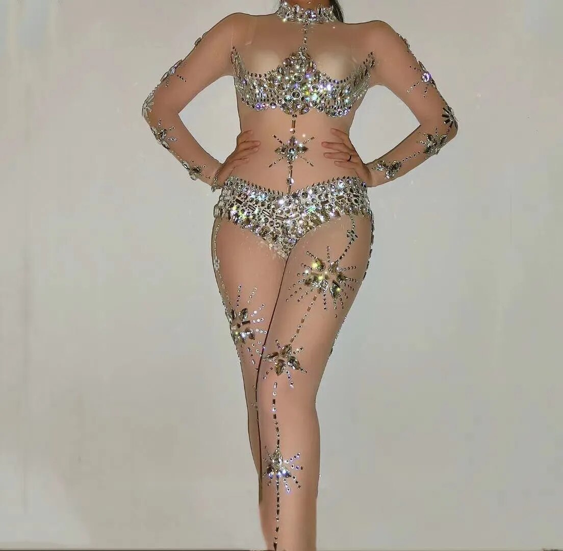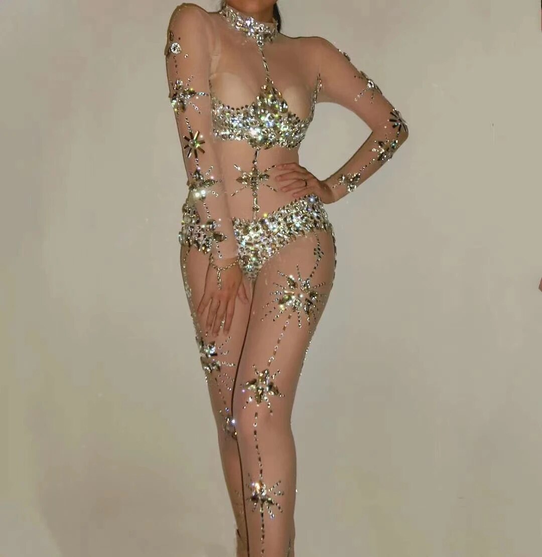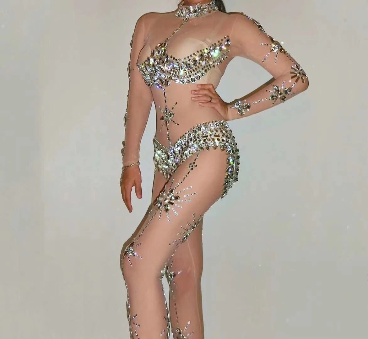 Sexy Perspective Crystal Jumpsuit Women Stretch Rhinestone Rompers Transparent Party Bodysuit Nightclub Singer Dancer Stage Wear