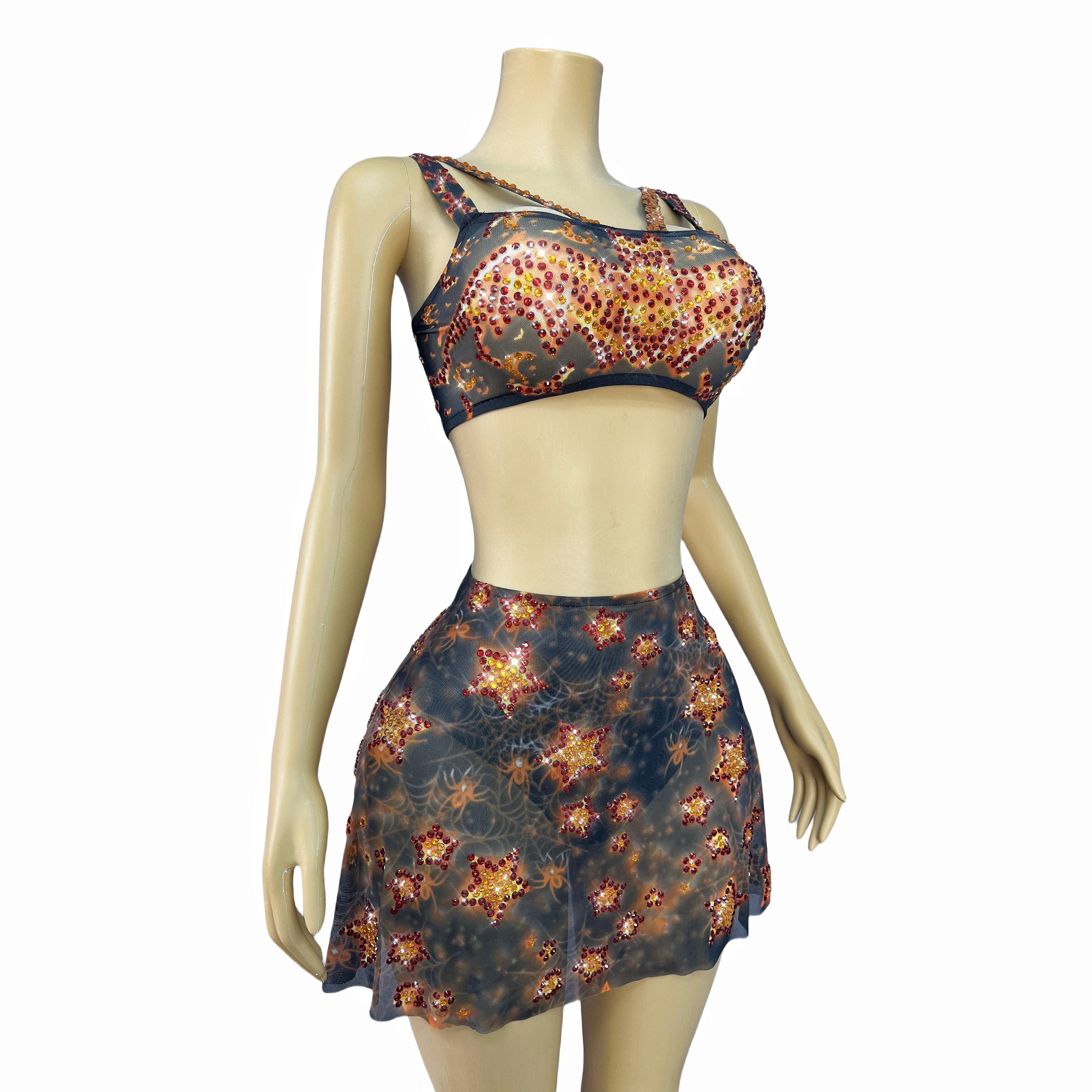 Sexy Printing Halloween Twinkling Rhinestones Top Skirt Split Dress Set Birthday Party Show Outfit Stage Performance Costume