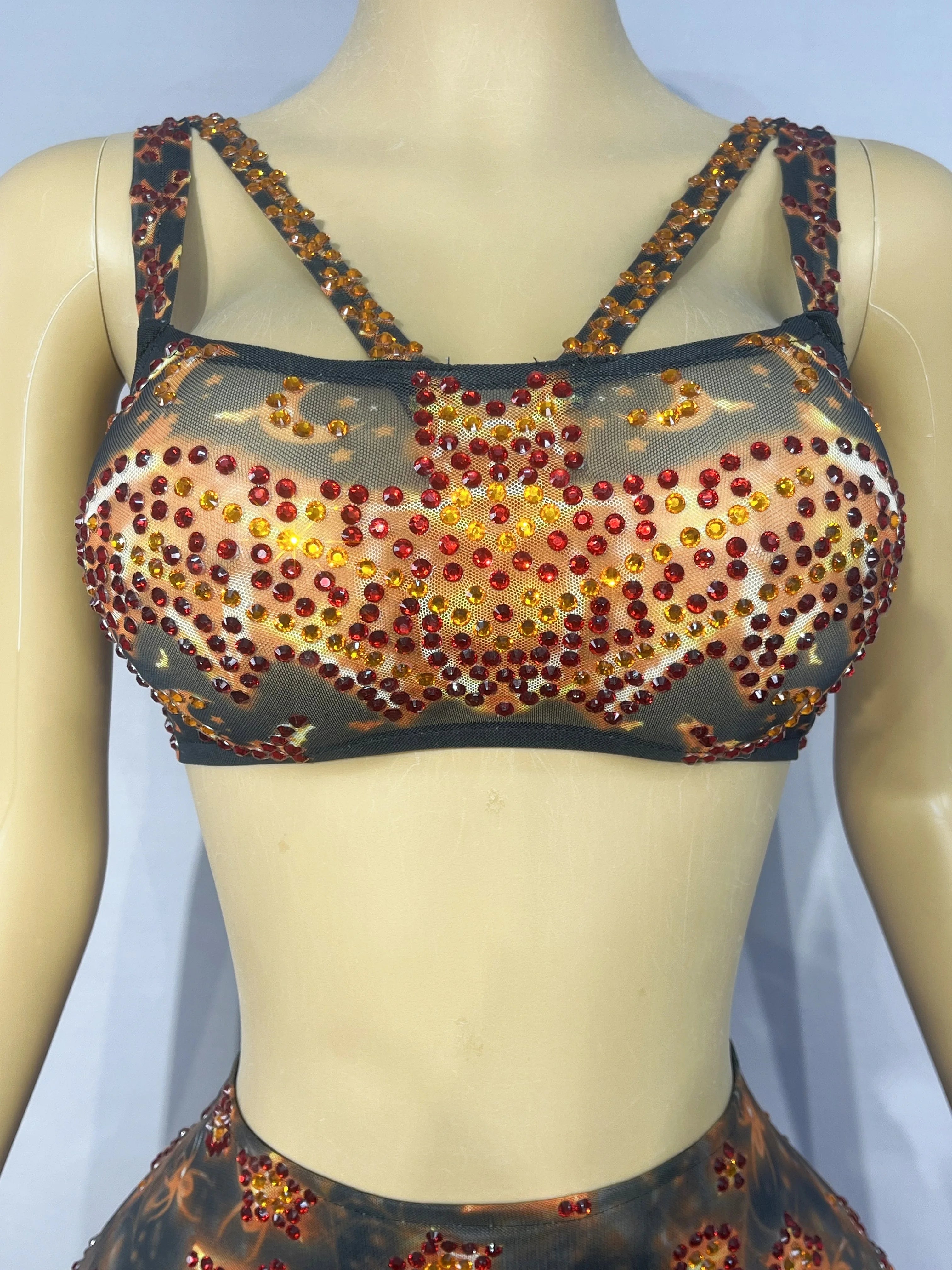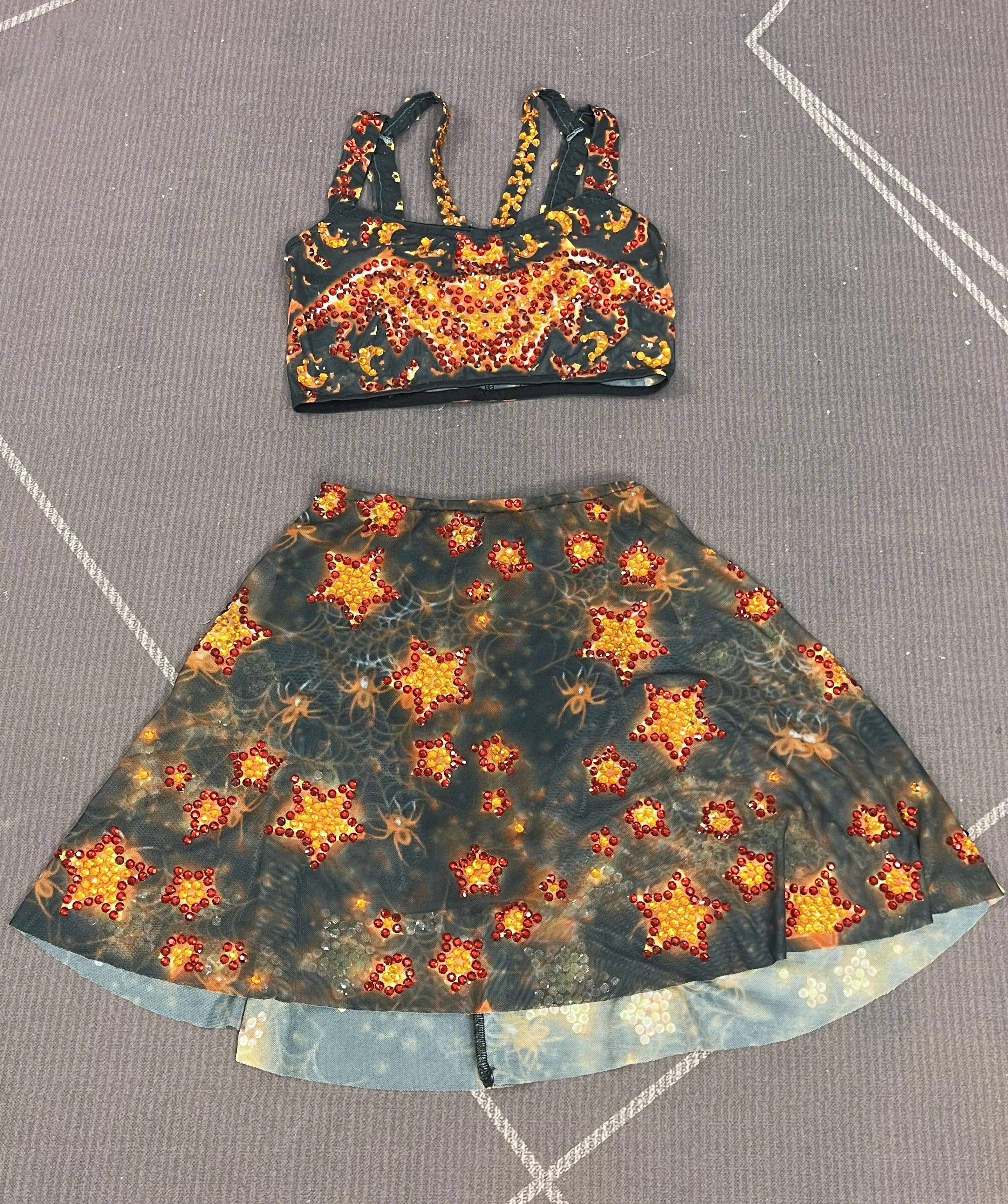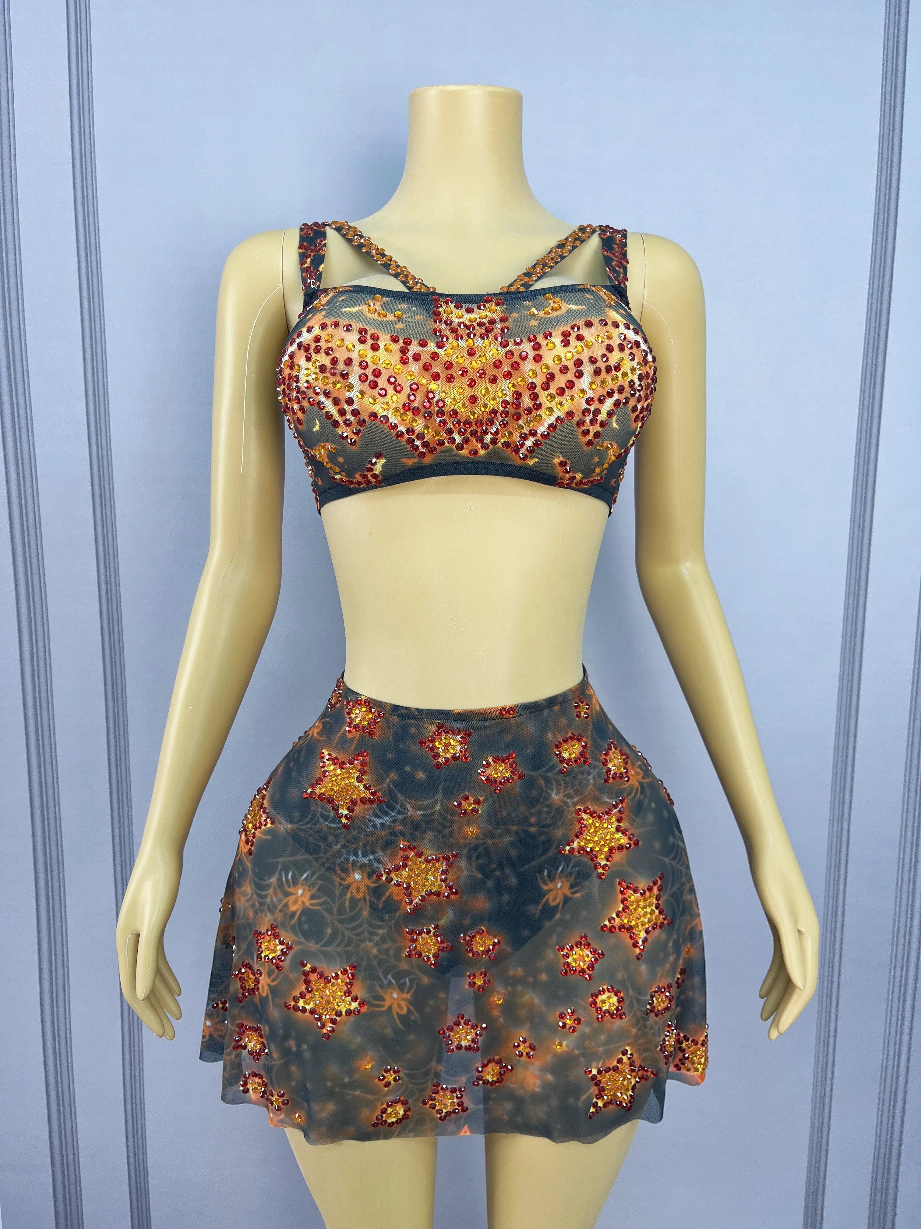 Stand out this Halloween with a sultry, show‑ready set: the Sexy Printing Halloween Twinkling Rhinestones Top & Skirt Split Dress Set—designed for birthday parties, performances, photoshoots, and stage appearances. This two‑piece costume blends bold seasonal prints with hand‑applied rhinestones and a dramatic split to create a sexy, camera‑ready look that reads both costume and couture.