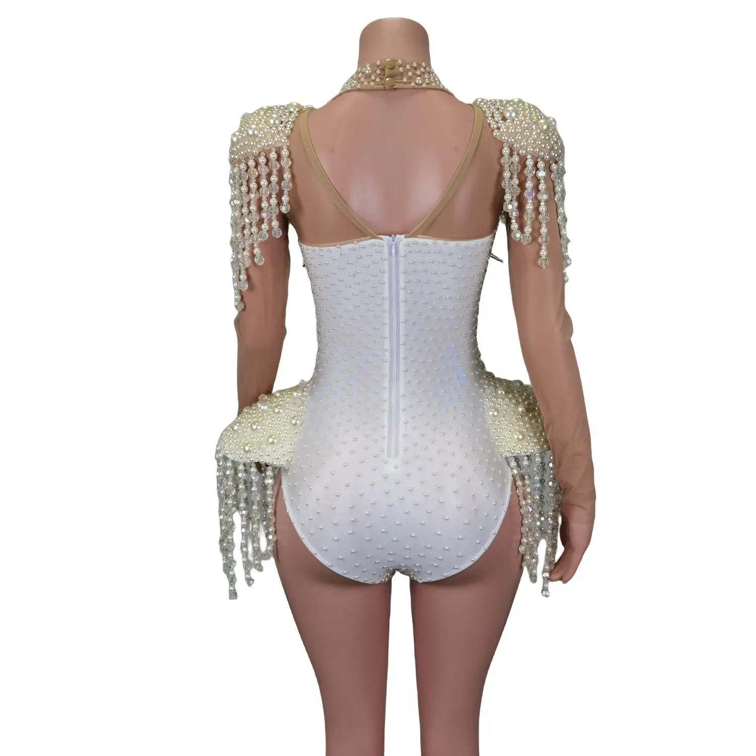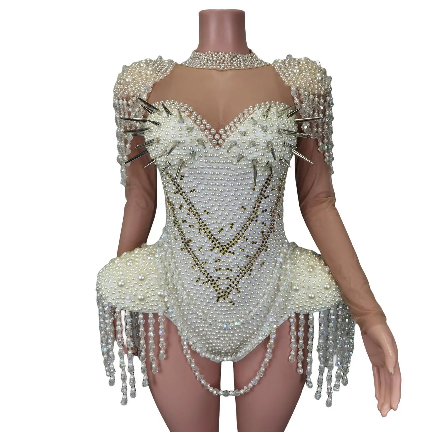 This Sexy Punk Rivets White Pearls Tassel Stage Performance Jumpsuit is a bold and edgy choice for stage performances, exotic dancewear, or any special event. The combination of punk rivets, white pearls, and tassel detailing creates a unique and eye-catching look. Perfect for dancers and performers looking to make a statement, this rhinestone bodysuit exudes confidence and style. Stand out on stage and captivate your audience in this sexy and daring outfit designed to showcase your individuality and flair.