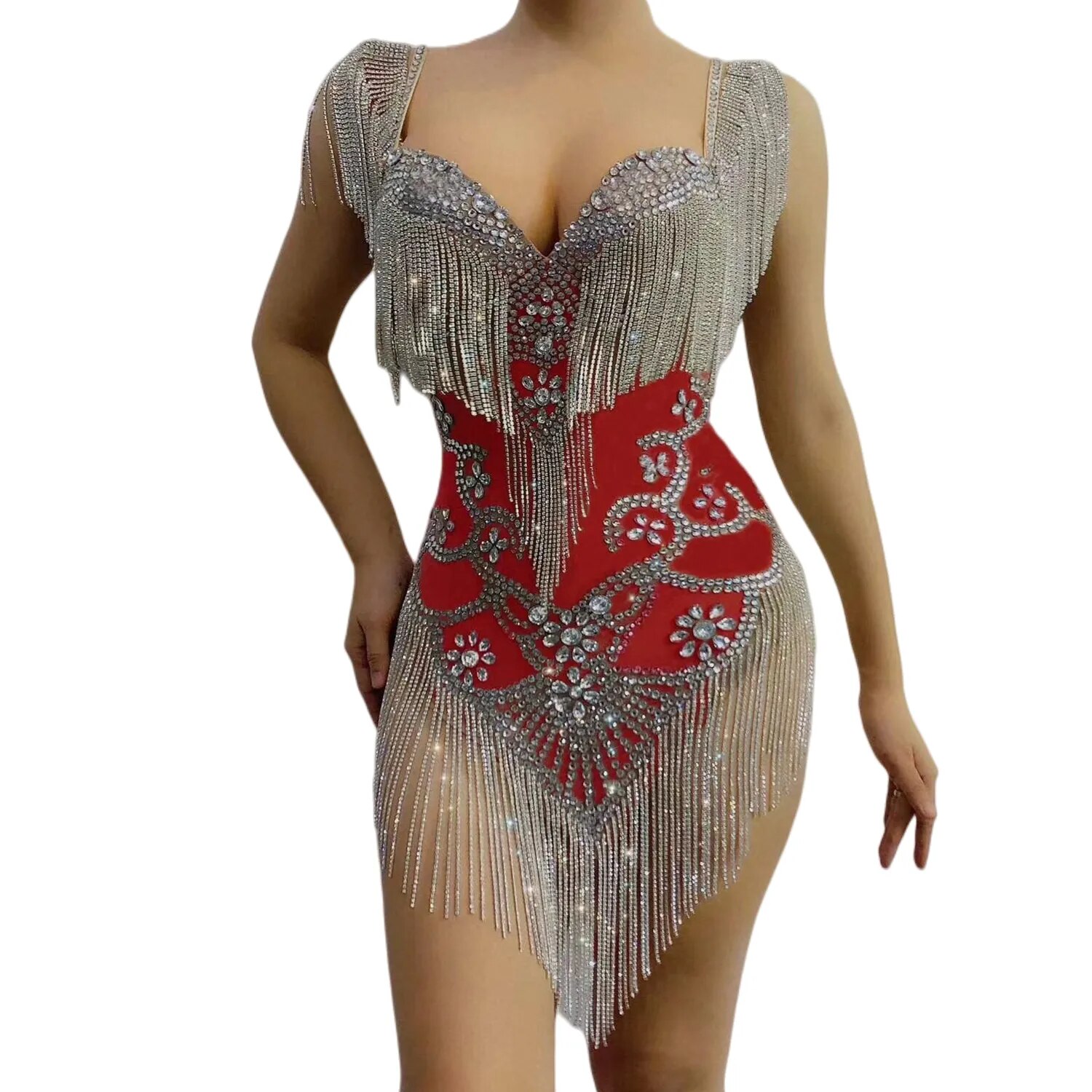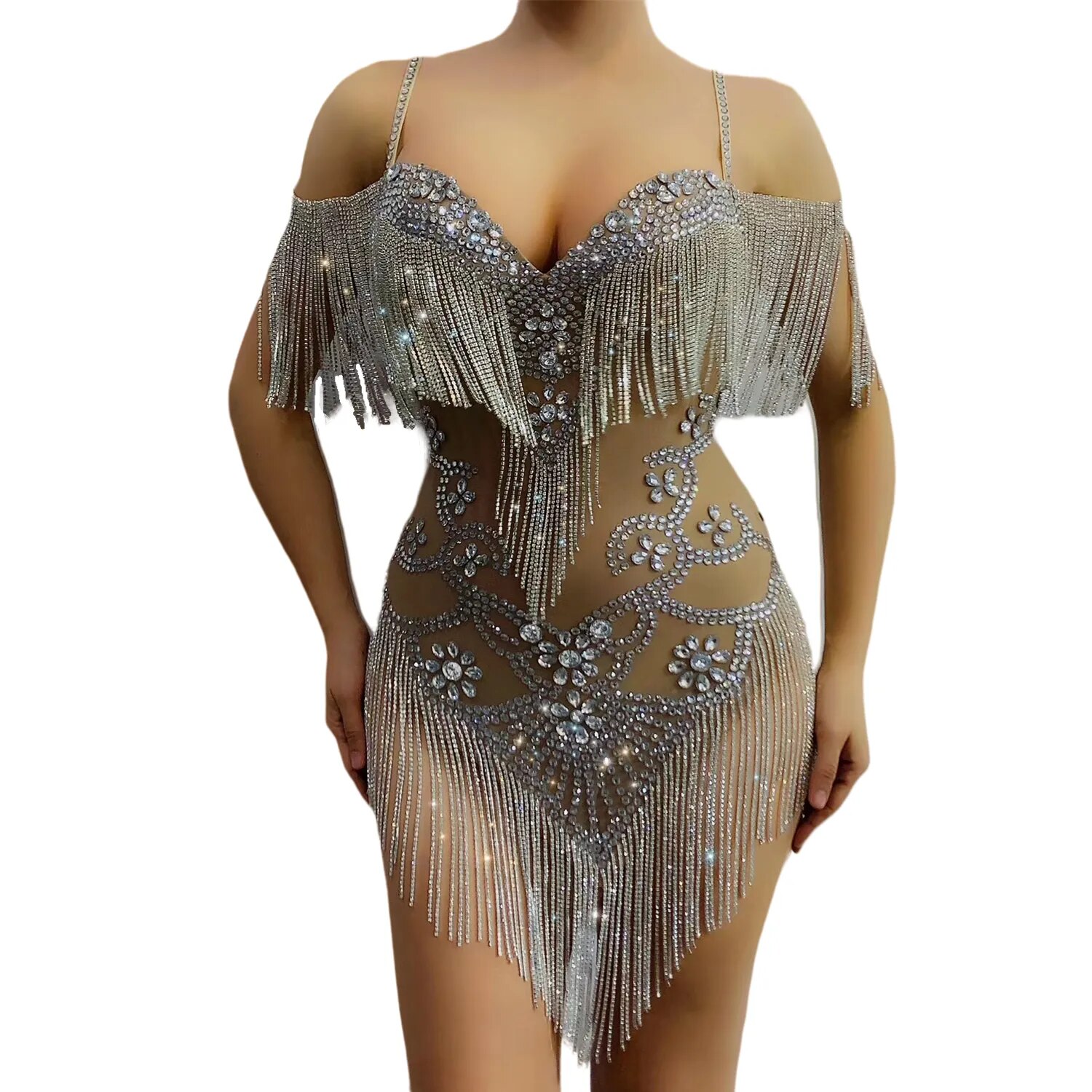Sexy Rhinestone Tassel Perspective Bodysuit Women Club Party Crystal Fringes Dress Latin Dance Stage Costumes DJ Singer Outfits