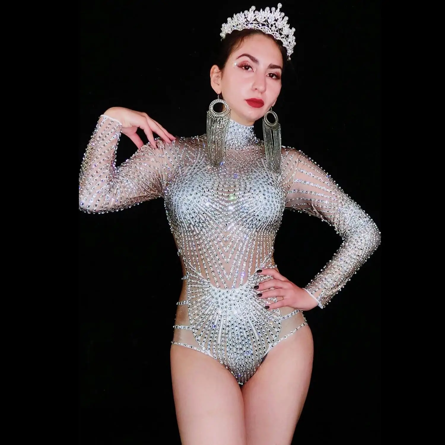 Sexy Rhinestones Sparkly Beads Bodysuit Women Stretch Outfit Nightclub Birthday DS Costume Female Singer Dance Leotard Wudu