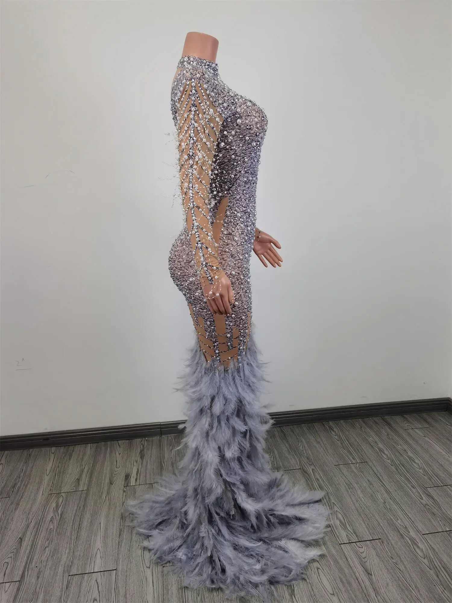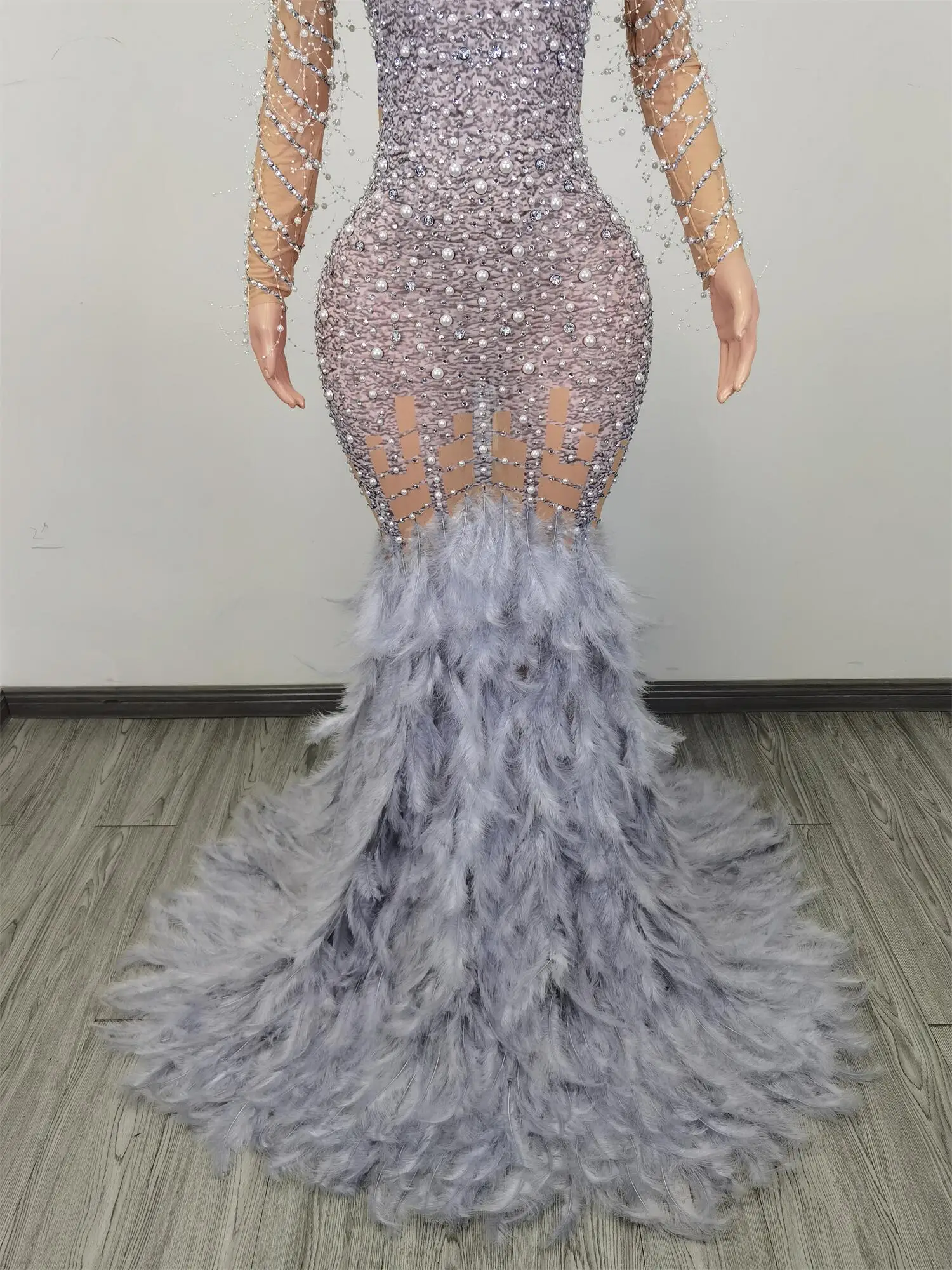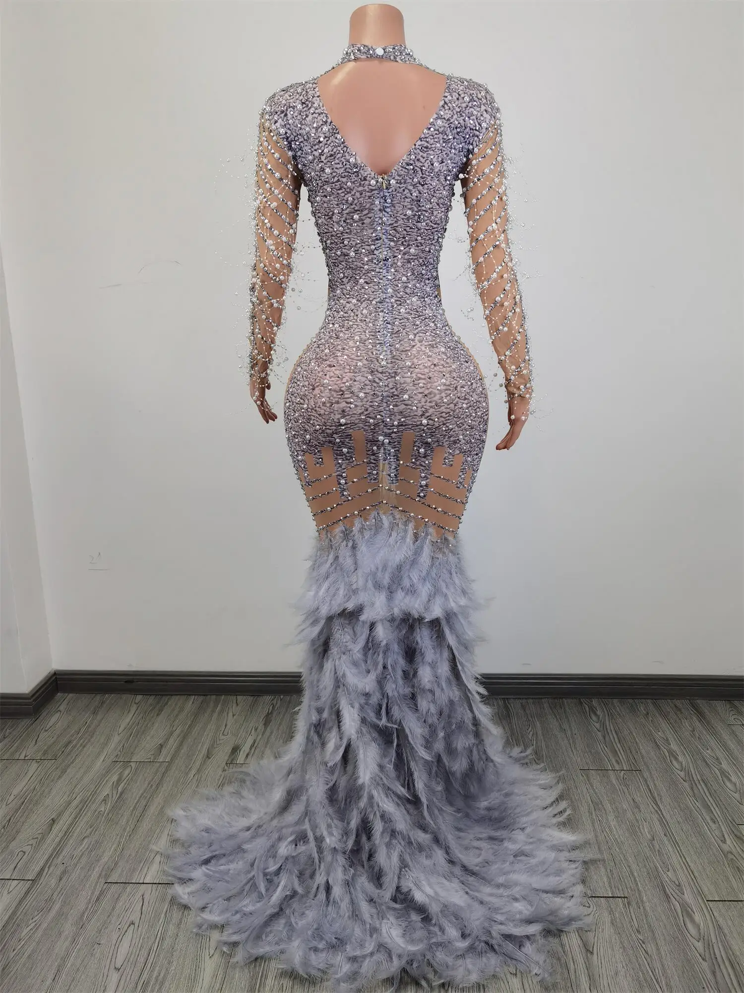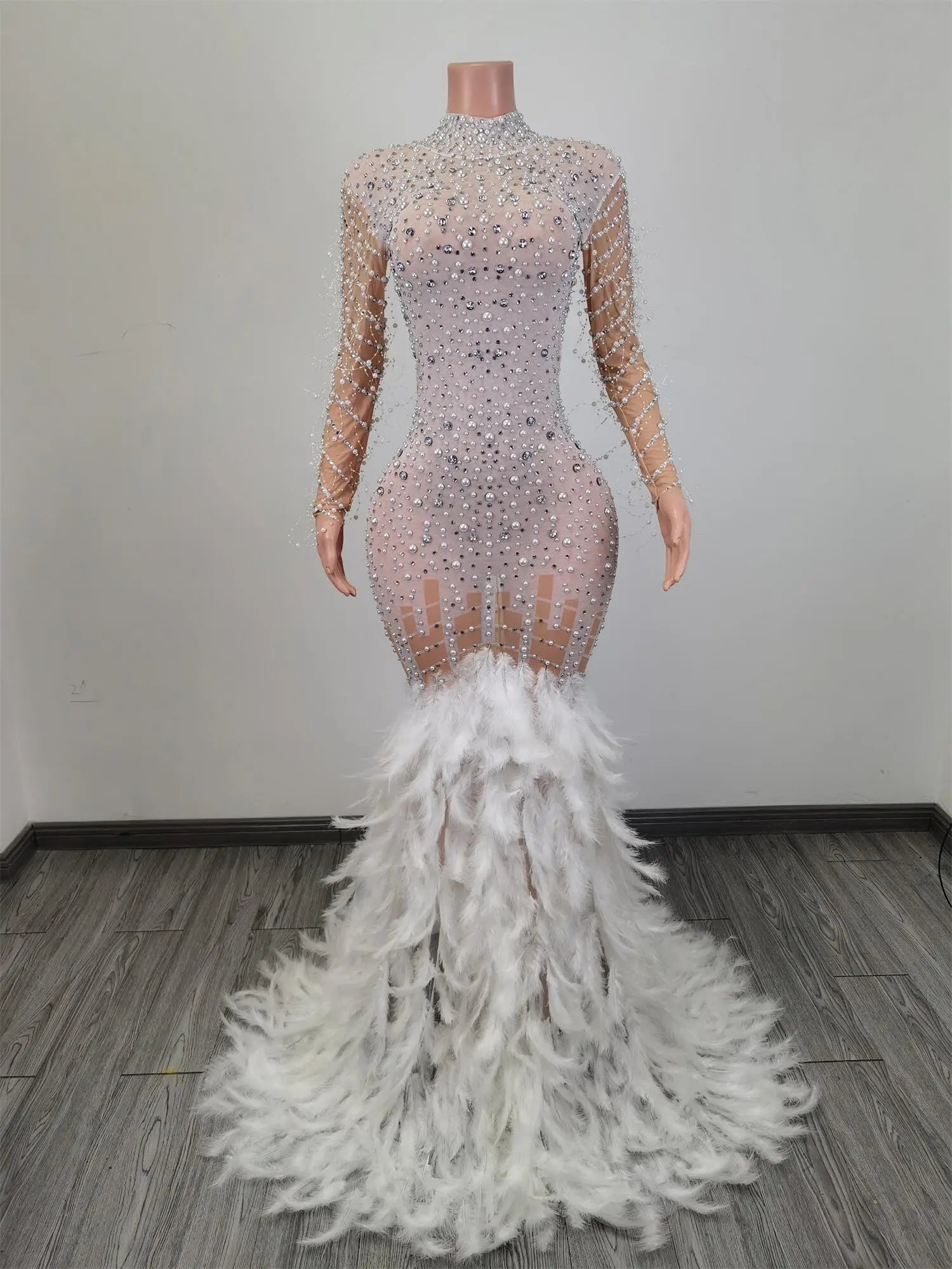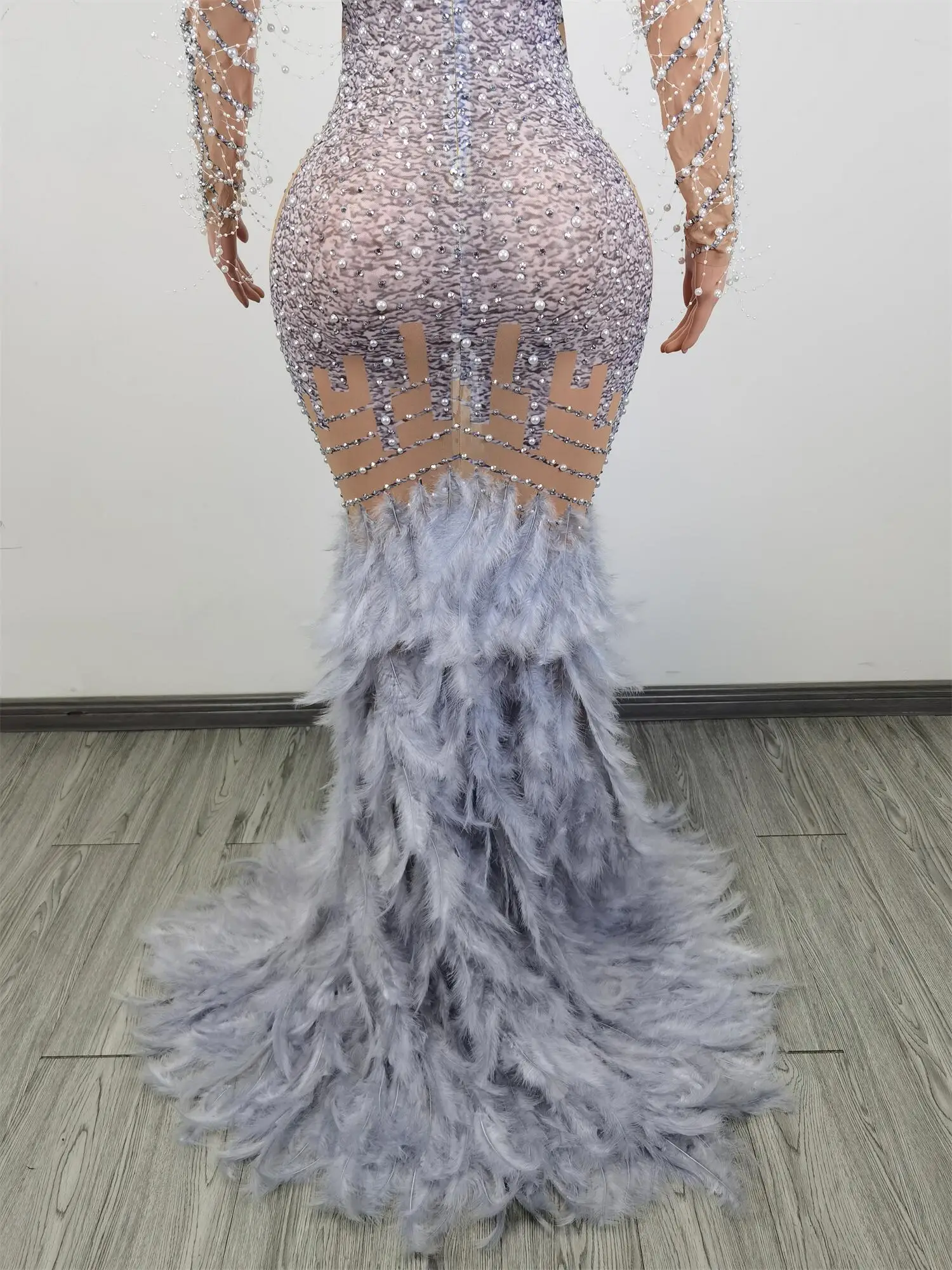 Sexy Rhinestones Transparent Long Feather Dress Birthday Celebrate Outfit Evening Women Dance Show Costume Dress Liantiyumao