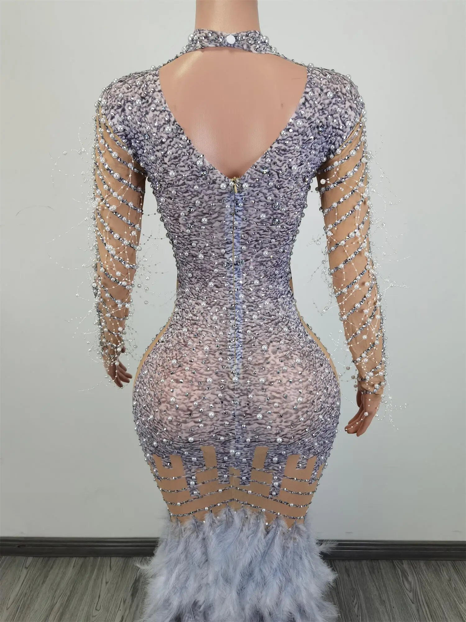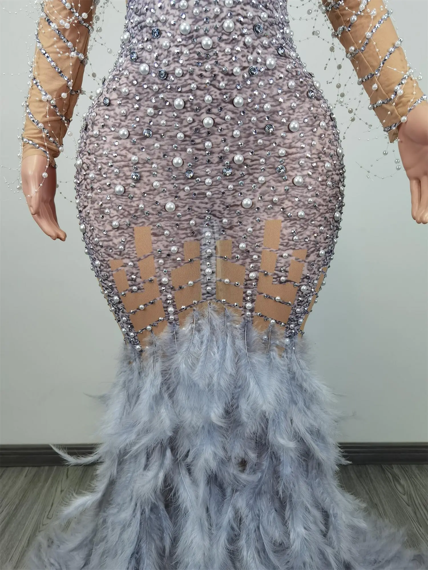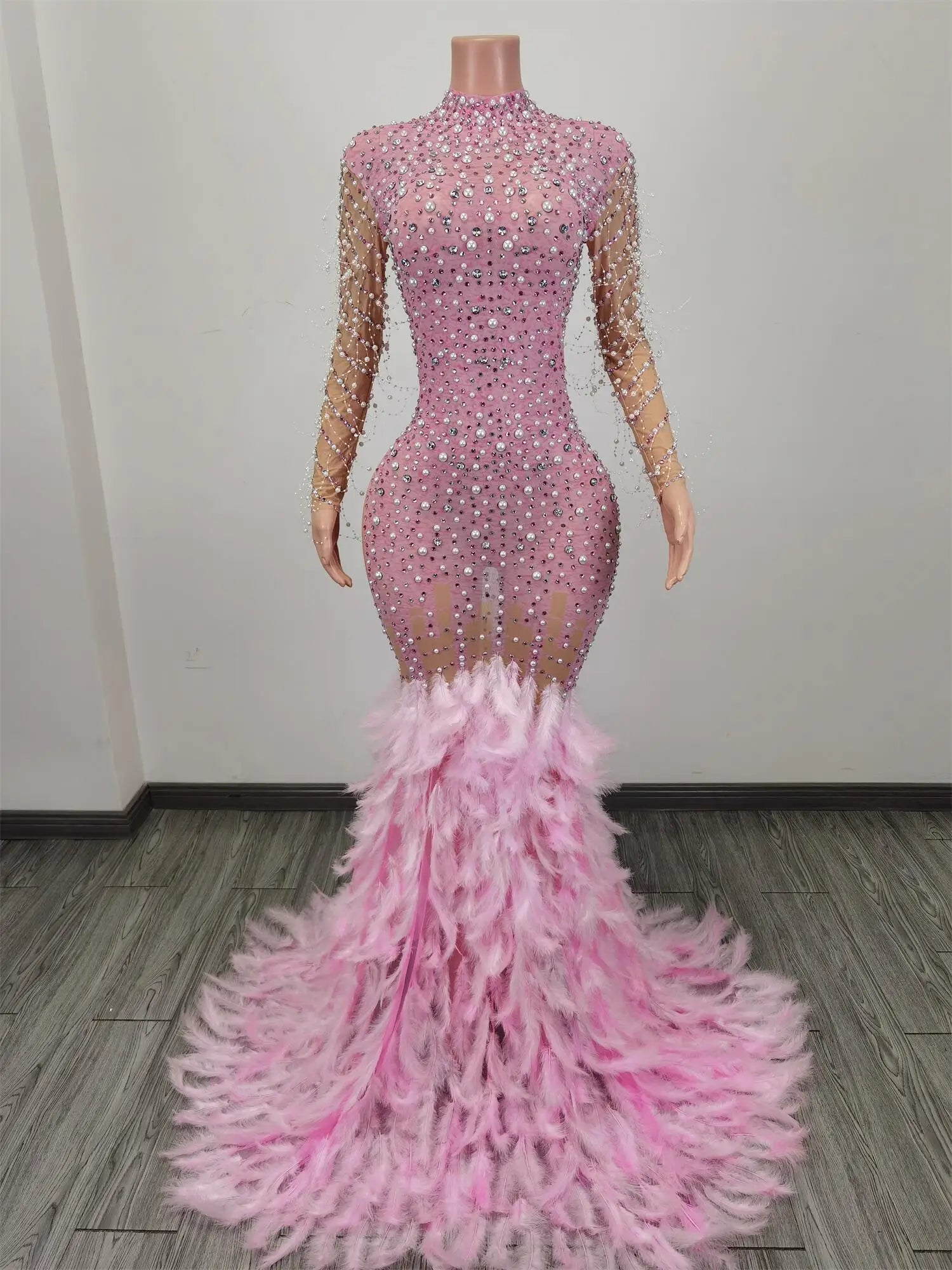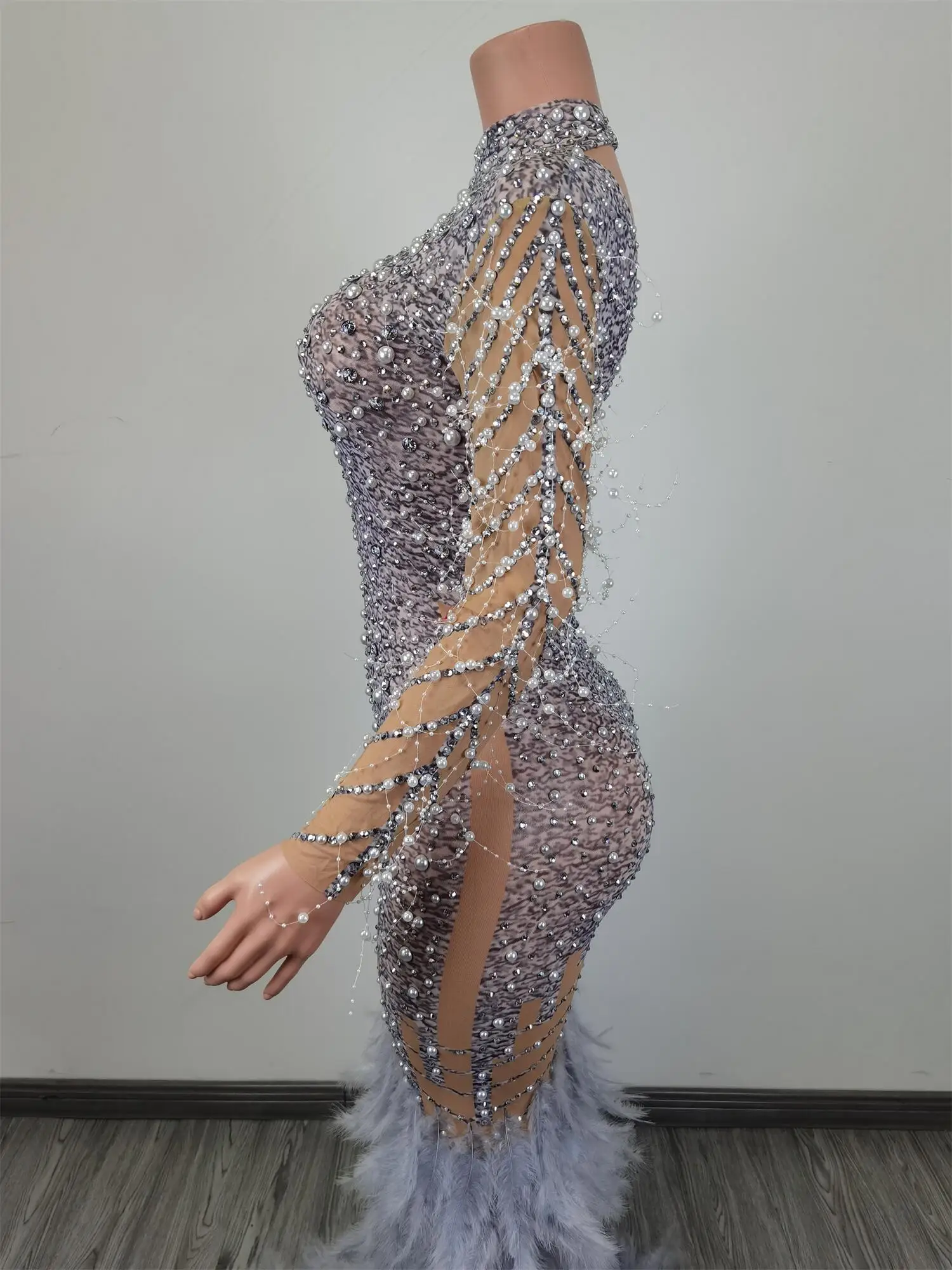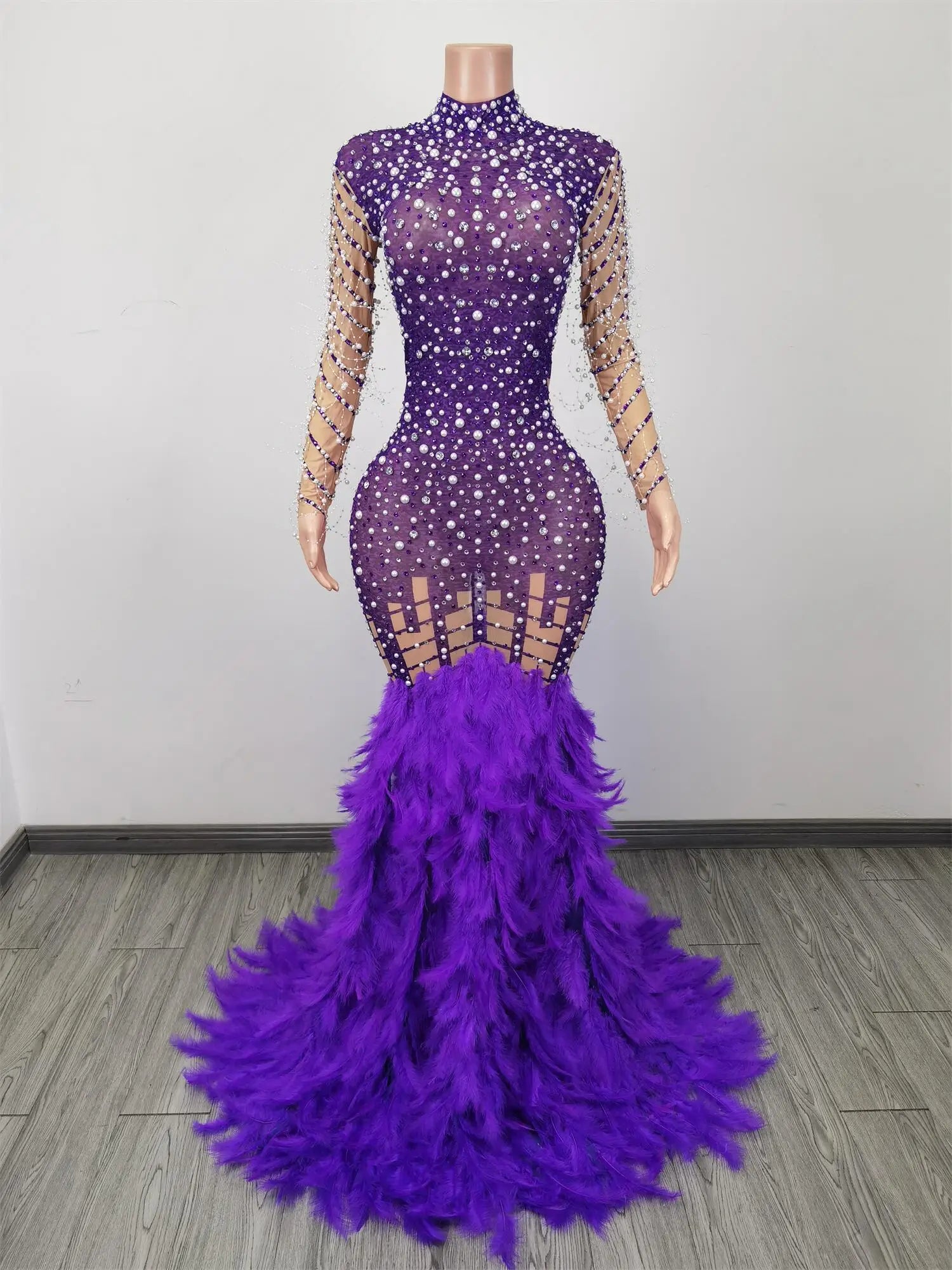 Sexy Rhinestones Transparent Long Feather Dress Birthday Celebrate Outfit Evening Women Dance Show Costume Dress Liantiyumao