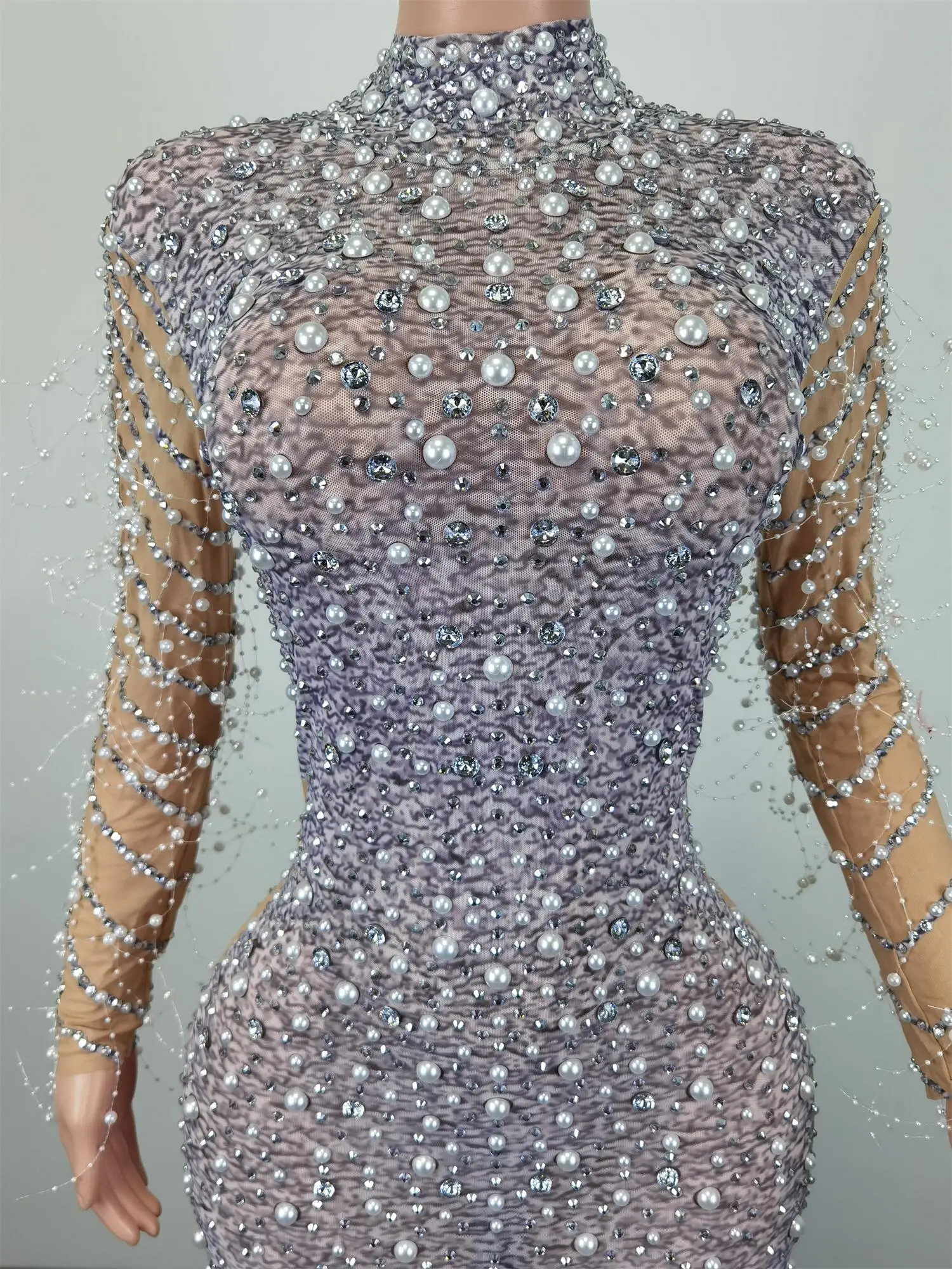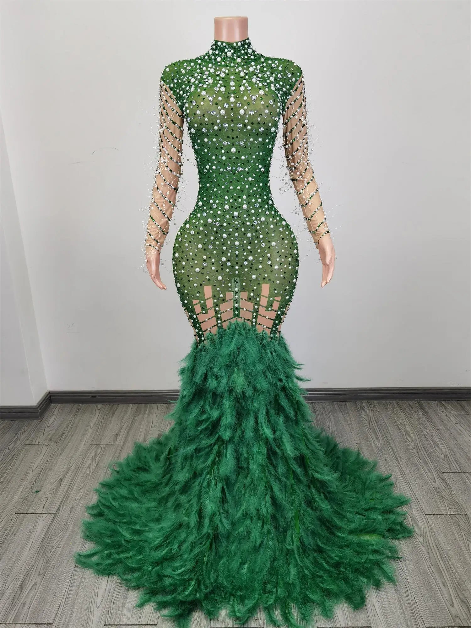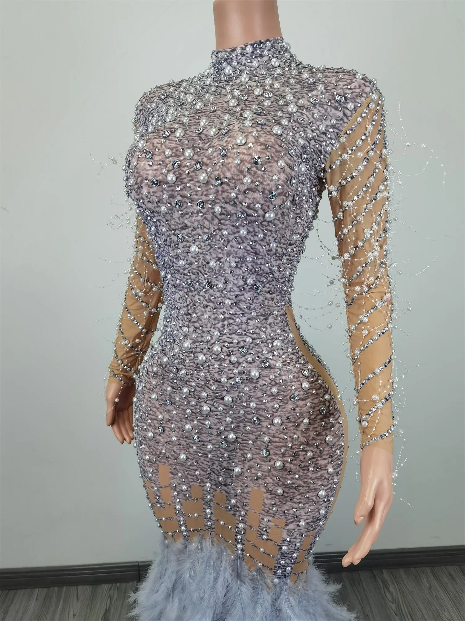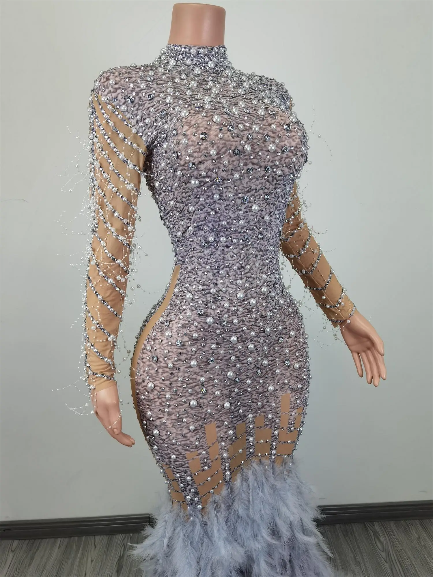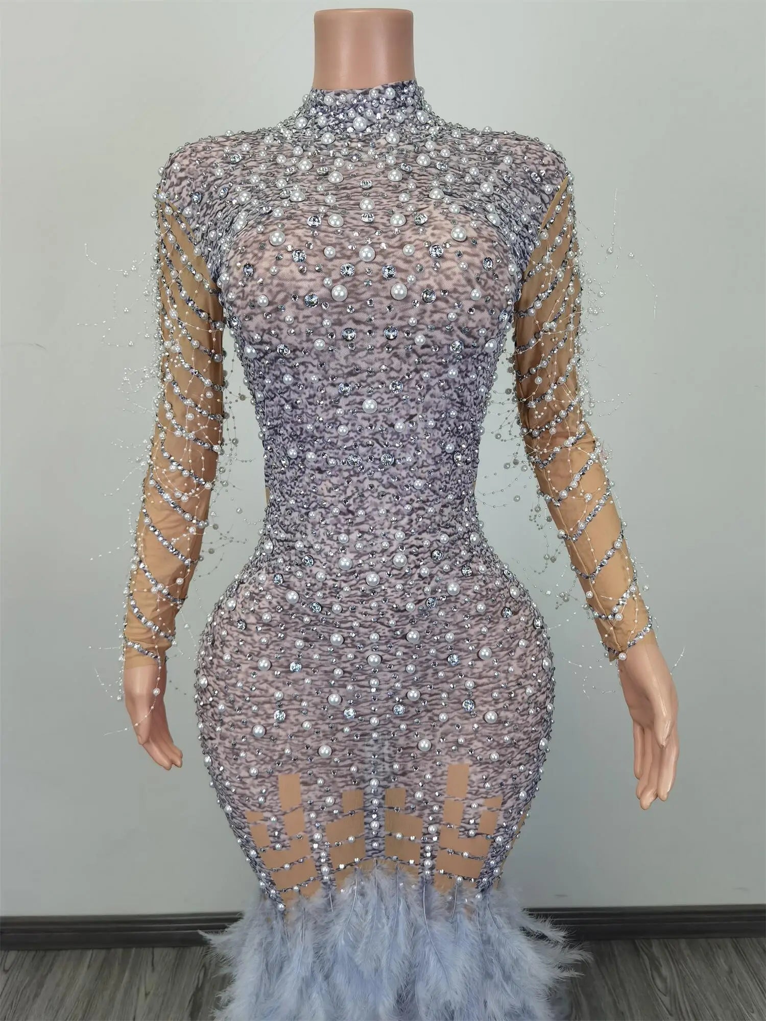 Sexy Rhinestones Transparent Long Feather Dress Birthday Celebrate Outfit Evening Women Dance Show Costume Dress Liantiyumao