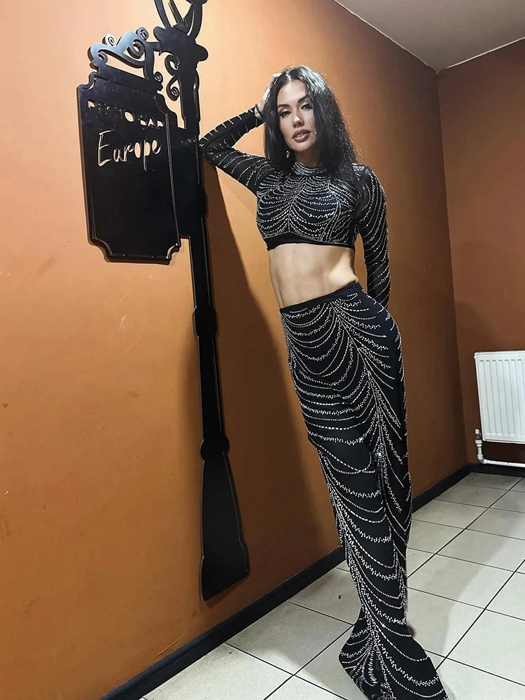 Make a bold and glamorous statement in this Sexy See-Through Mesh Diamonds Beading Top and High Waist Long Skirt Two-Piece Set! This stunning ensemble features a black shining crystal top with see-through mesh and intricate diamonds beading, paired with a high waist long skirt for an elegant and sophisticated look perfect for evening parties and special events. The sparkling crystals and beading add a touch of luxury and glamour, while the high waist skirt enhances your silhouette and exudes femininity. Turn heads and command attention with this chic and trendy set that combines style and elegance in a striking way. Embrace your confidence and showcase your impeccable fashion sense with this eye-catching two-piece set that is sure to make you the center of attraction at any evening party.