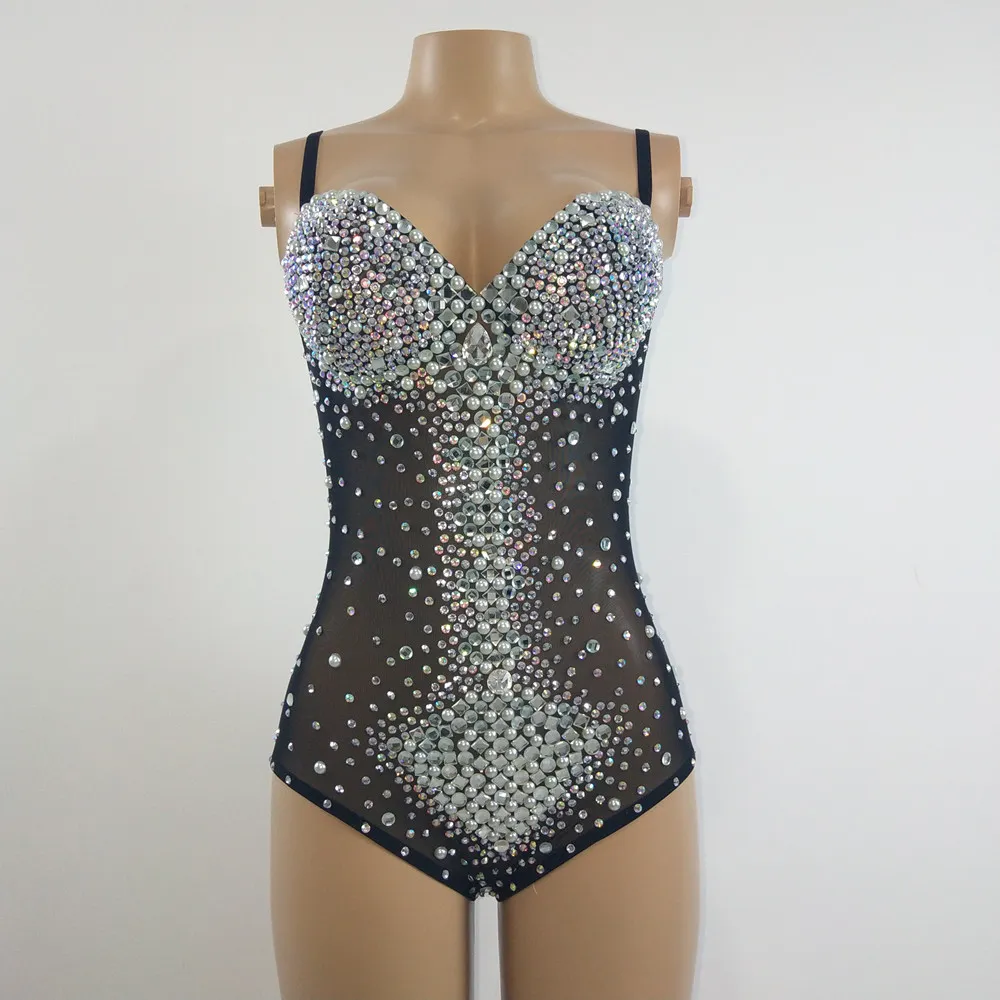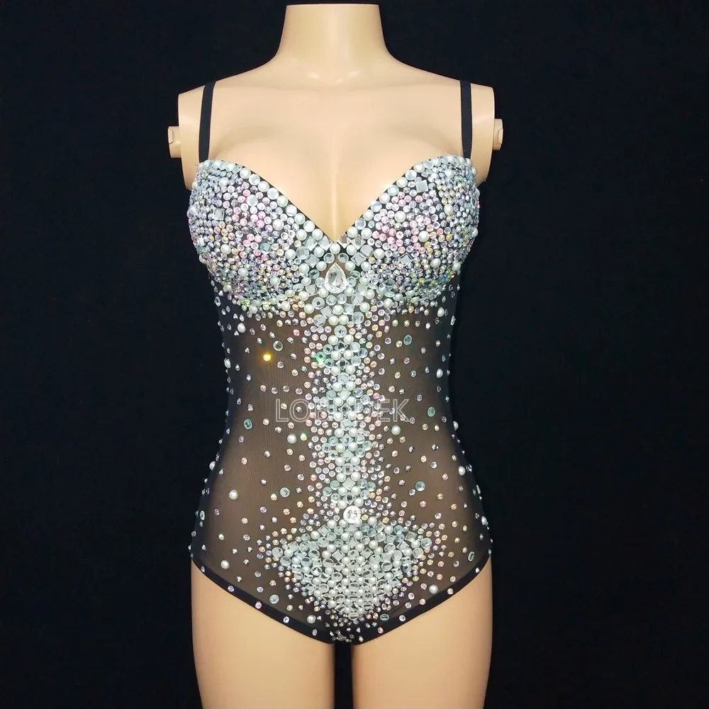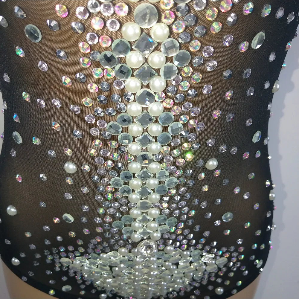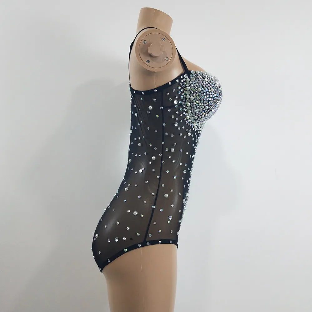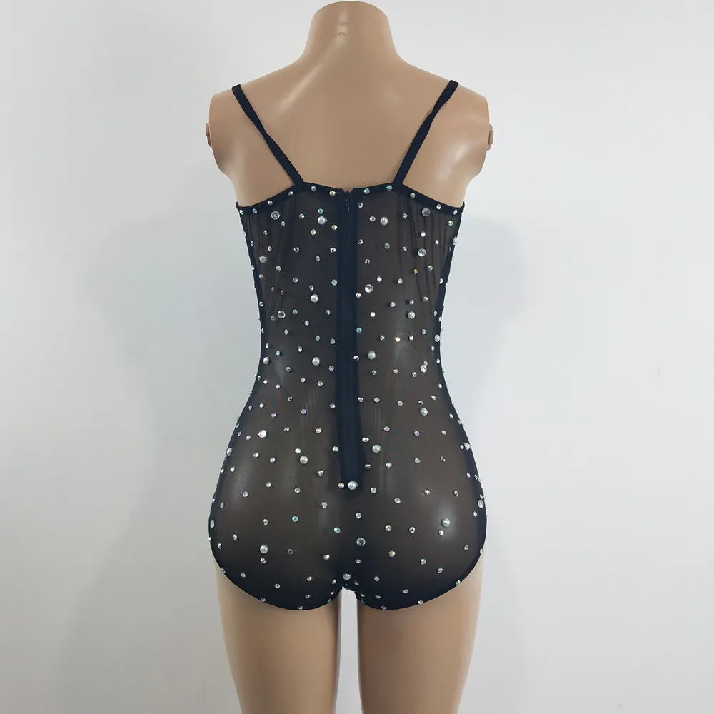 Sexy See Through V Neck Rhinestones Leotard Elastic Mesh Tights Bodysuit Nightclub Dancer Stage Performance Costume Photo Shoot