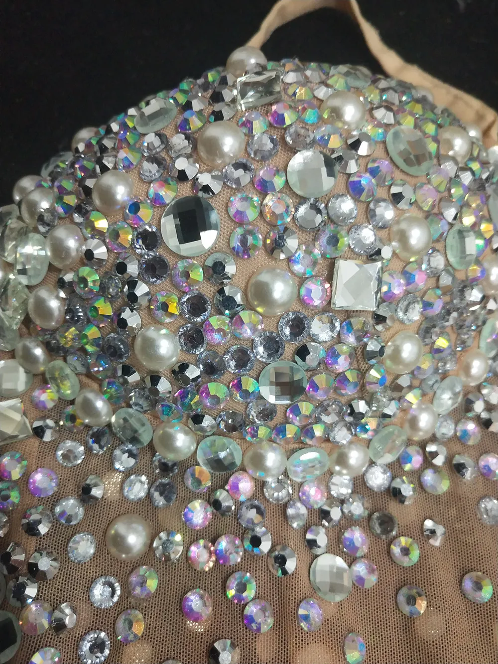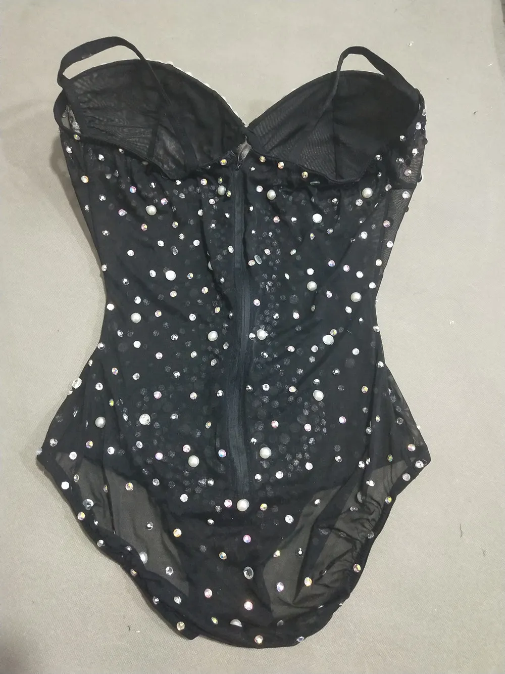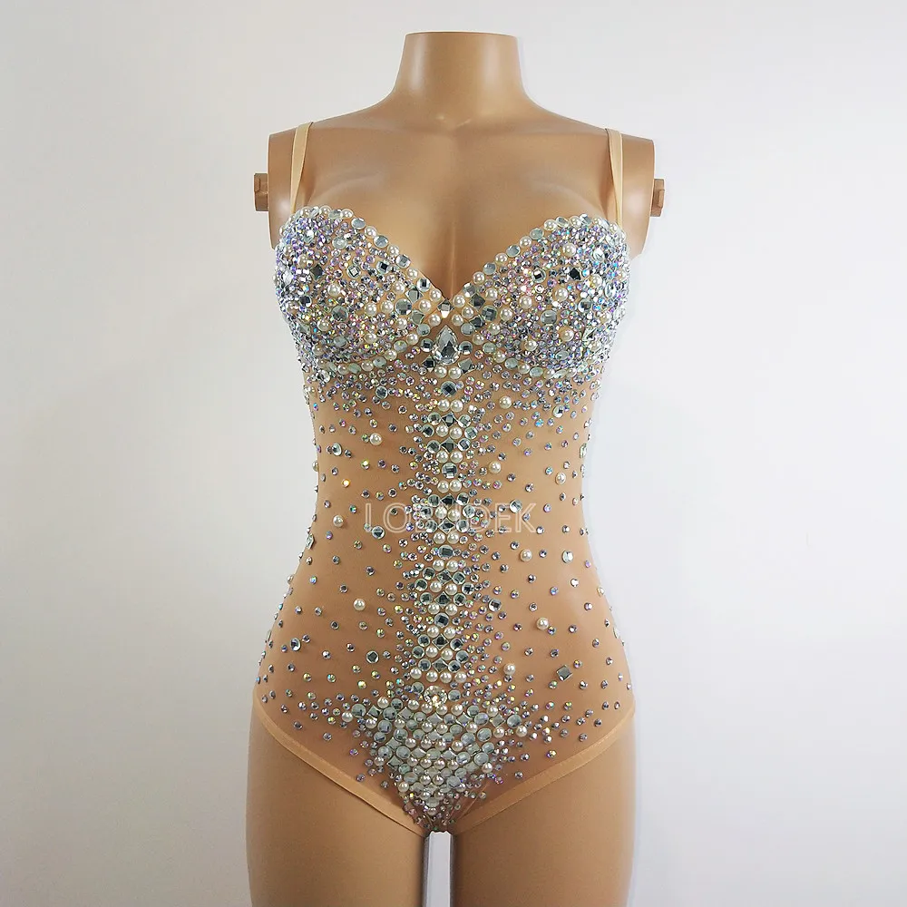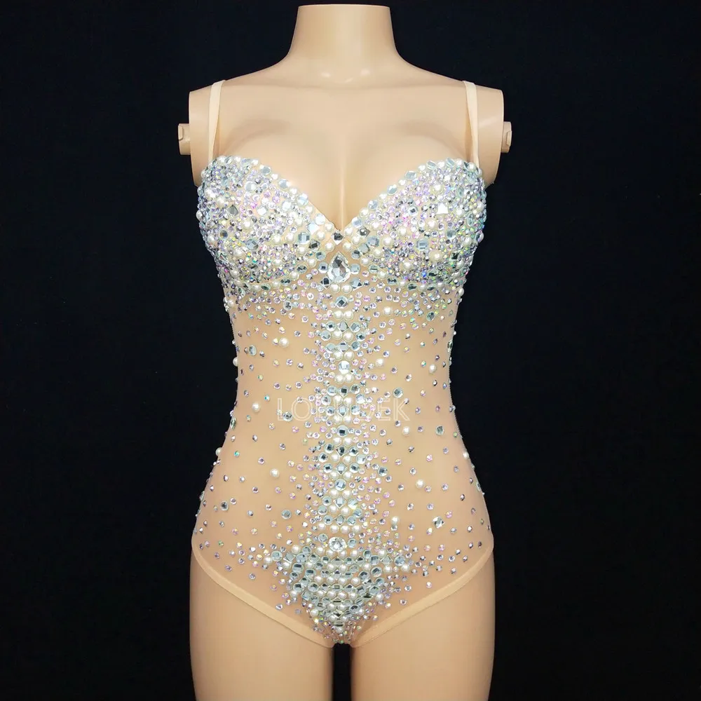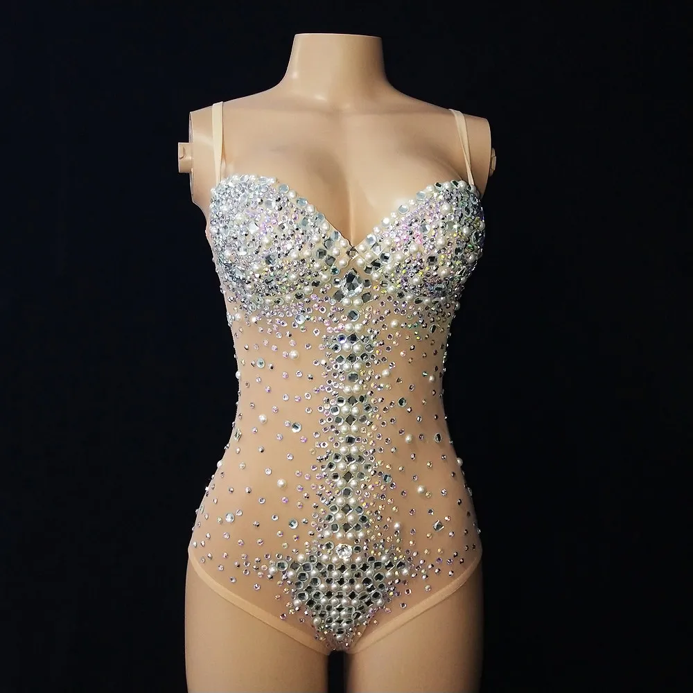 Sexy See Through V Neck Rhinestones Leotard Elastic Mesh Tights Bodysuit Nightclub Dancer Stage Performance Costume Photo Shoot