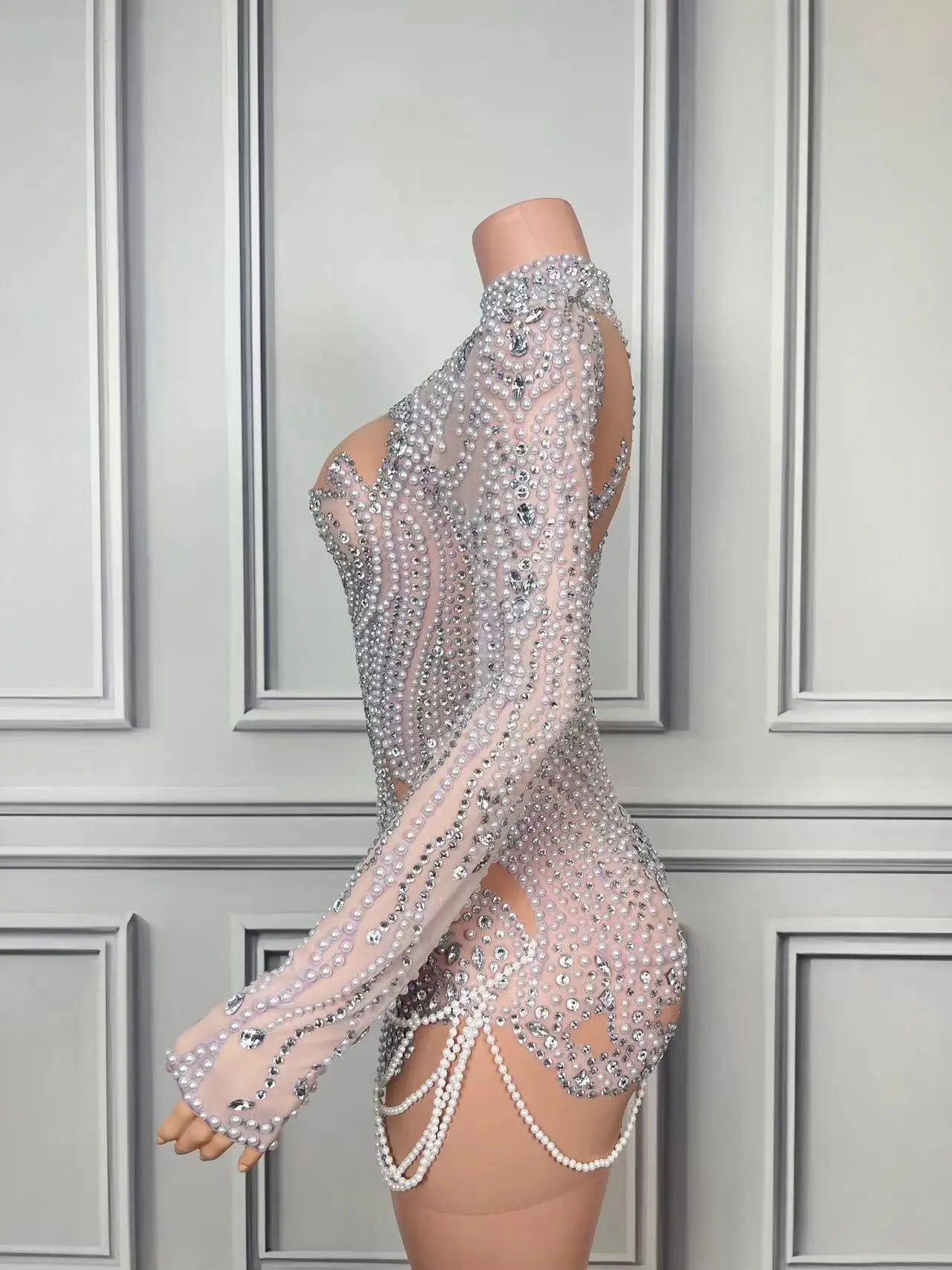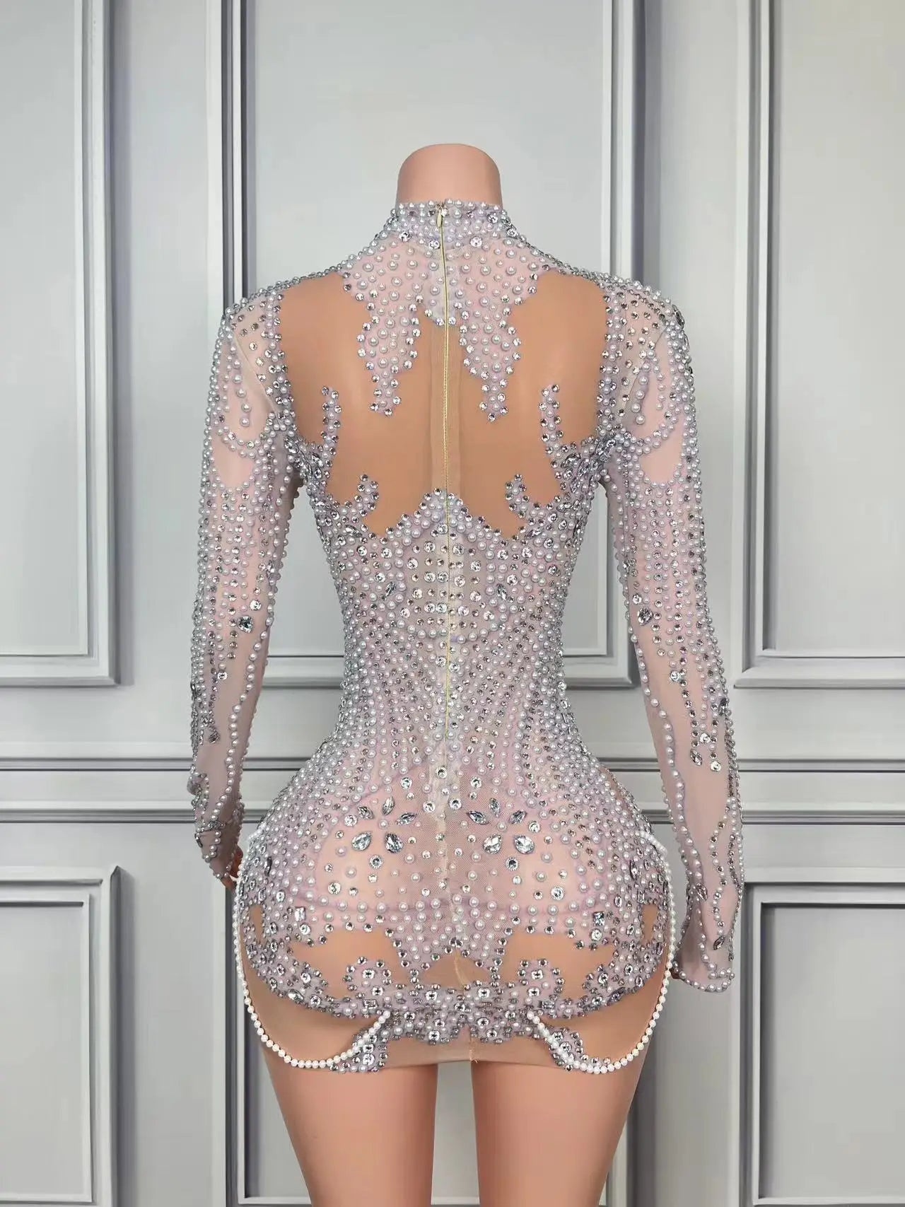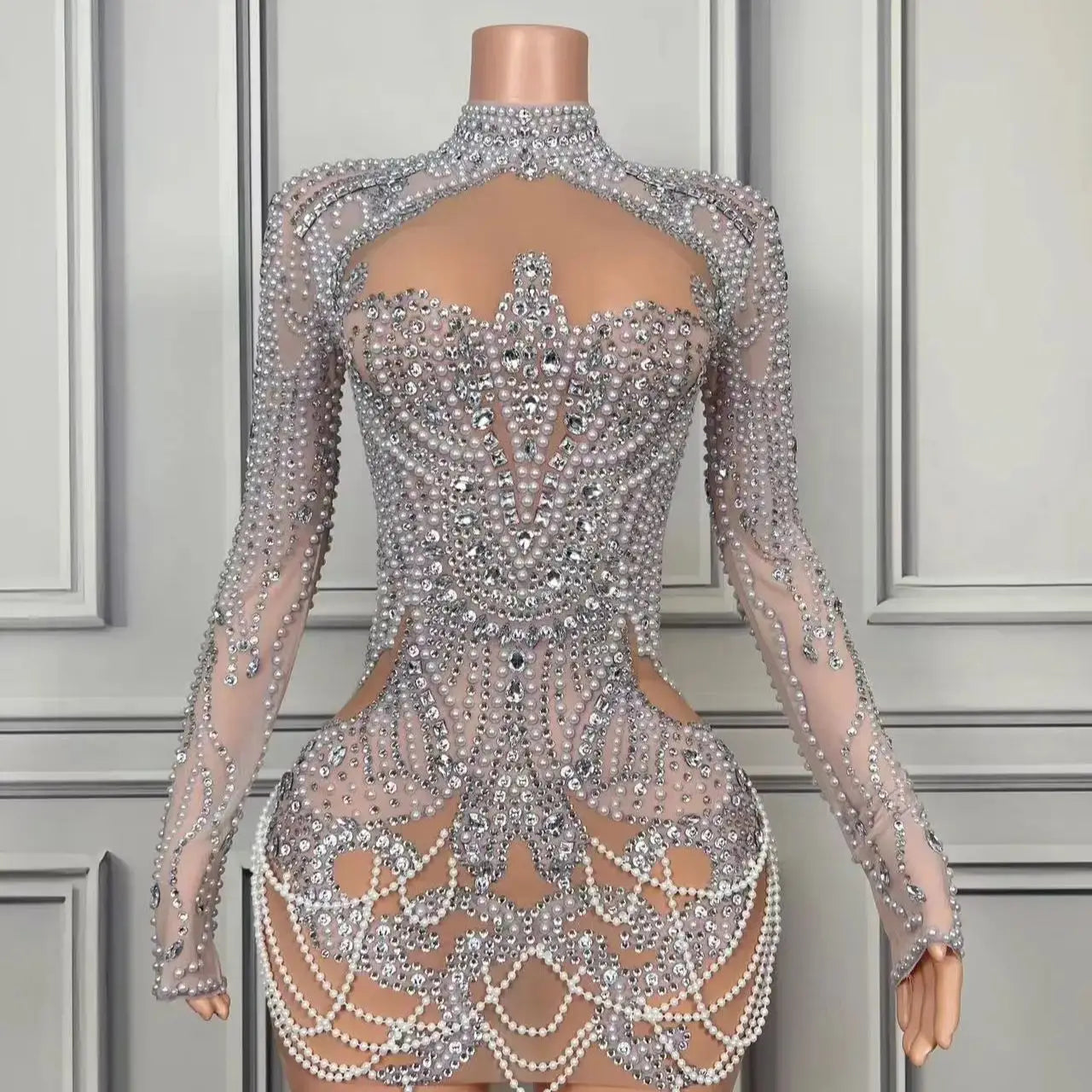 Sexy Sheath Mini Dress Flashing Luxury Rhinestones Pearl Birthday Evening Party Nightclub Singer Performance Costume Stage Wear