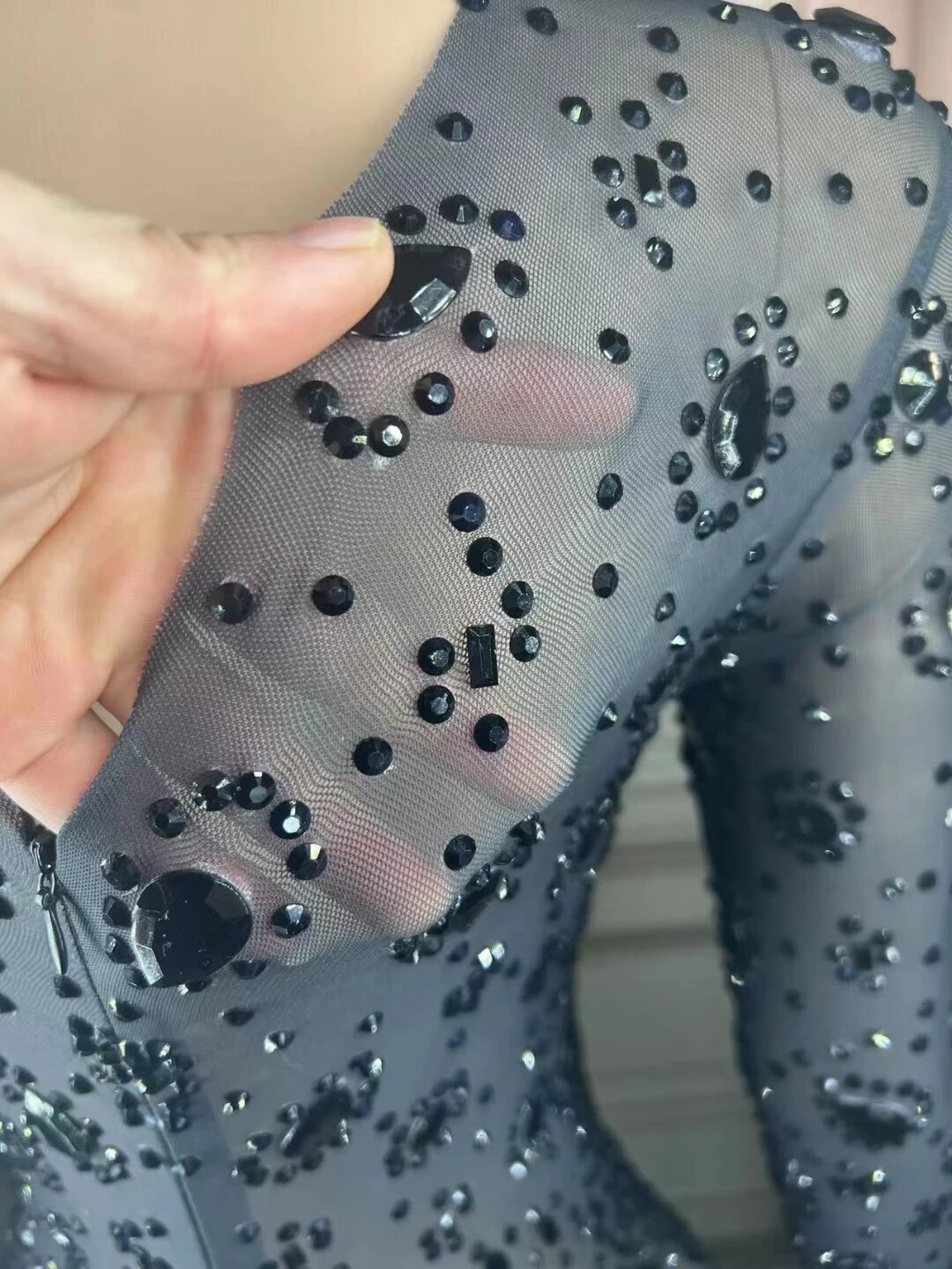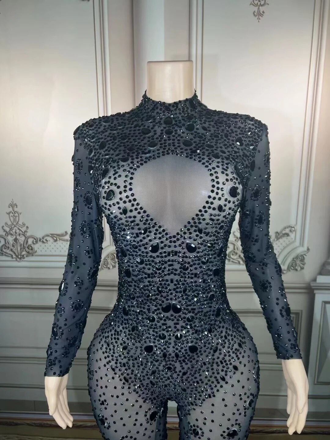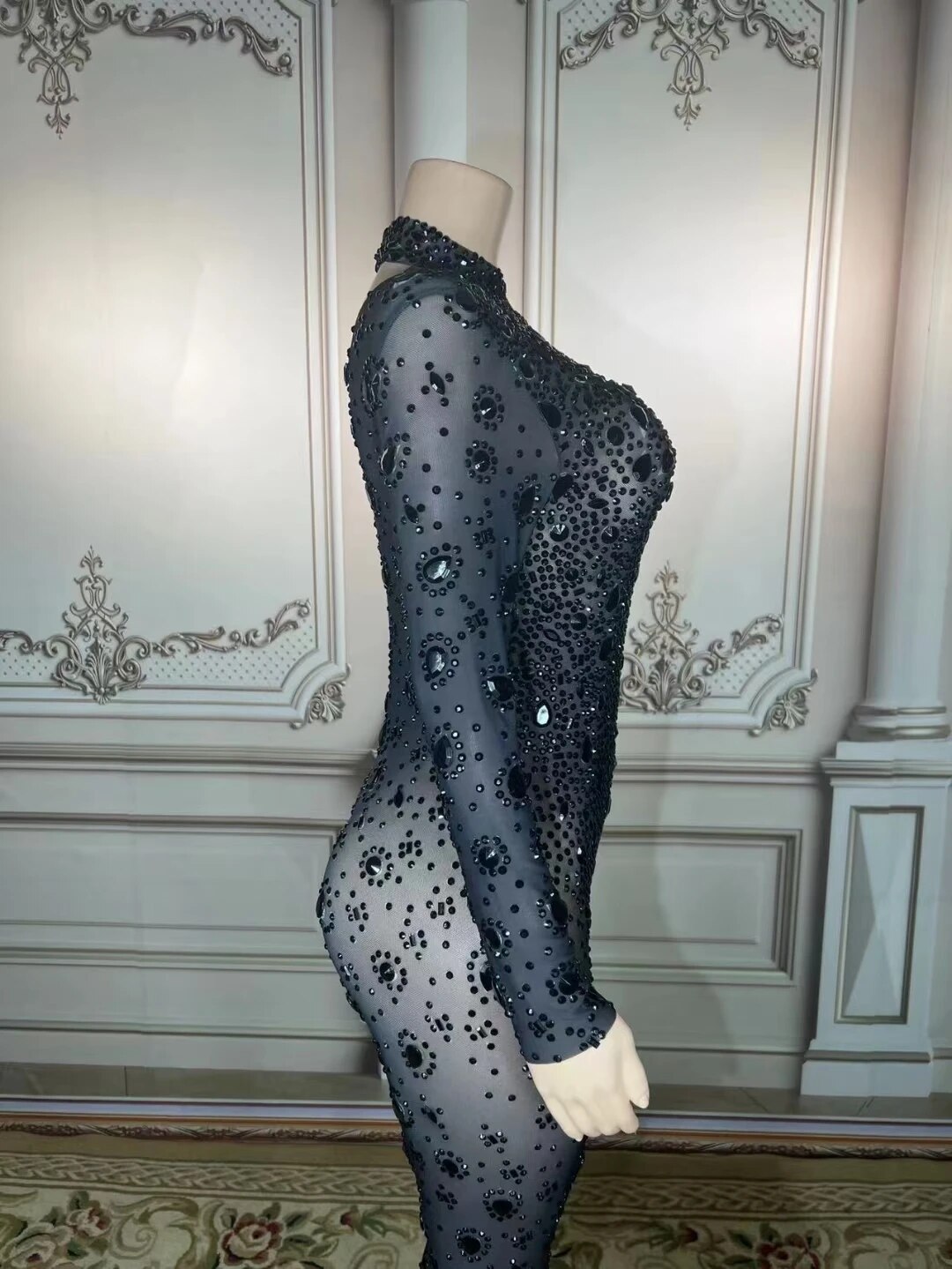 Sexy Shining Black Crystals Stones Bodysuit Costume Rhinestone Transparent Jumpsuit Birthday Wear Stretch Pole Dance Leggings