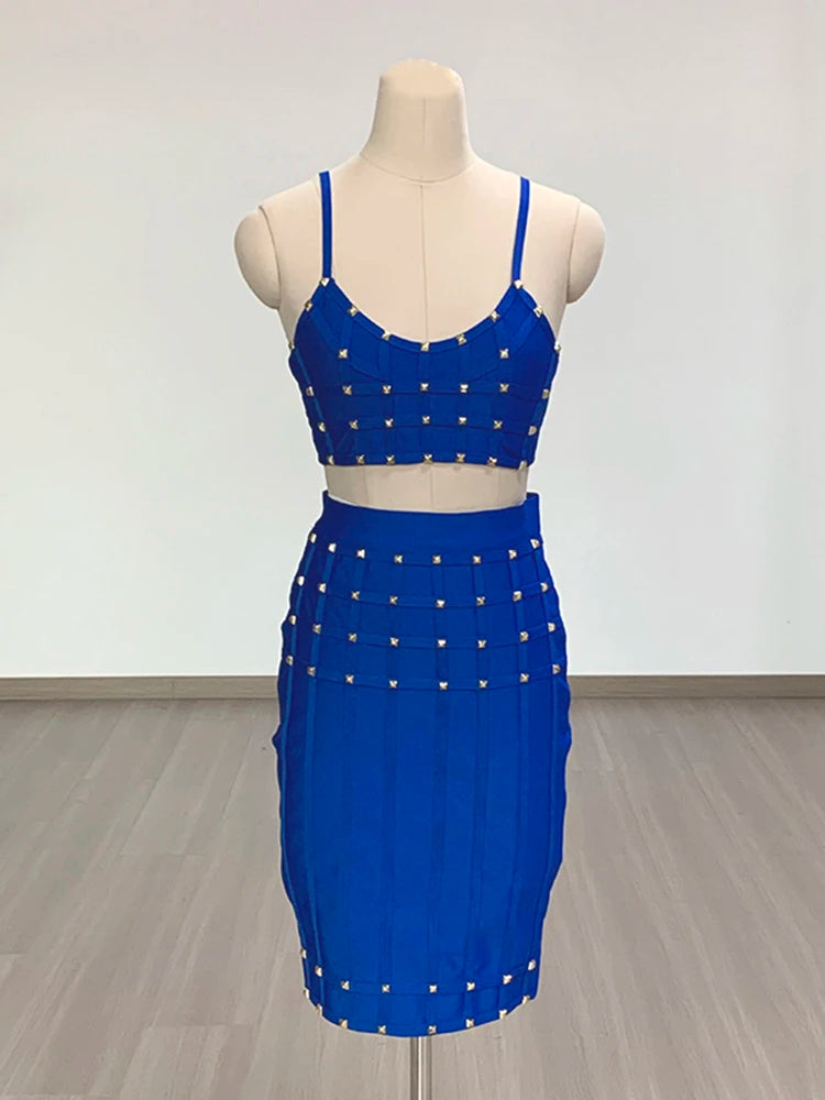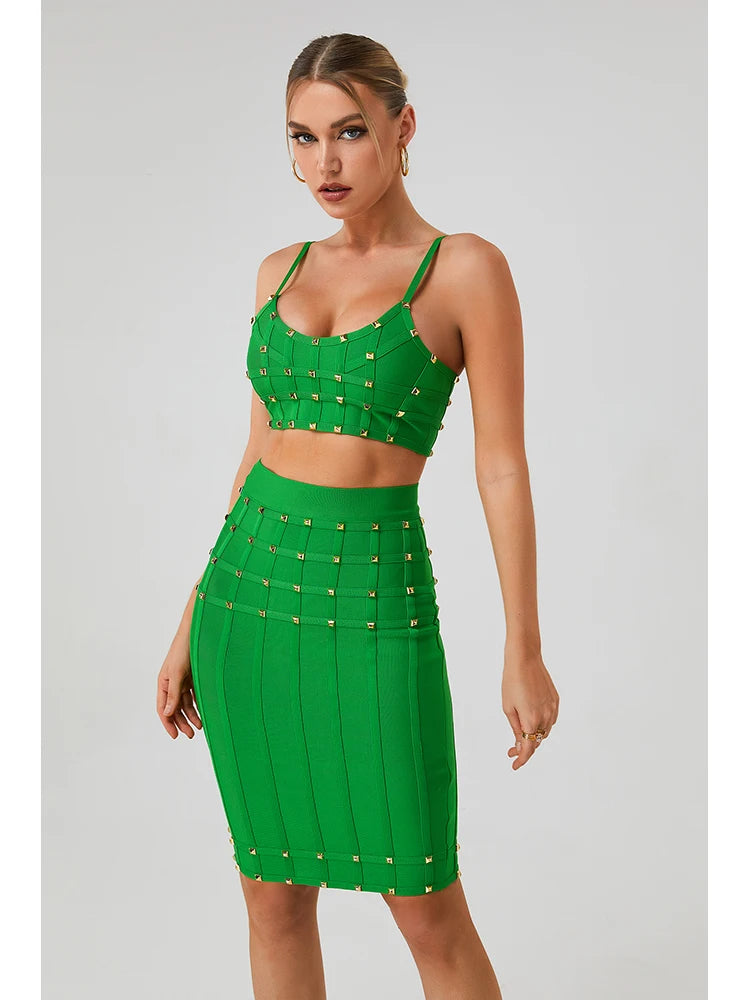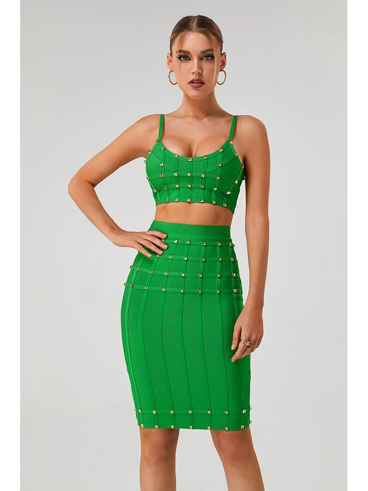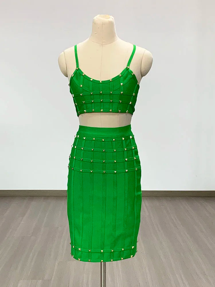 Elevate your evening look with this sexy two-piece set for women in a gorgeous green hue. The set includes a short sleeveless top paired with a rivet midi bandage skirt, perfect for elegant evening parties and special occasions. The combination of the chic top and bodycon skirt adds a touch of sophistication and glamour to your ensemble, making you stand out with style and grace. The elegant design and figure-flattering silhouette create a fashionable and eye-catching look that exudes confidence and allure. Make a statement at your next evening event with this stunning outfit that showcases your sense of style and sophistication, ensuring you turn heads and own the spotlight.