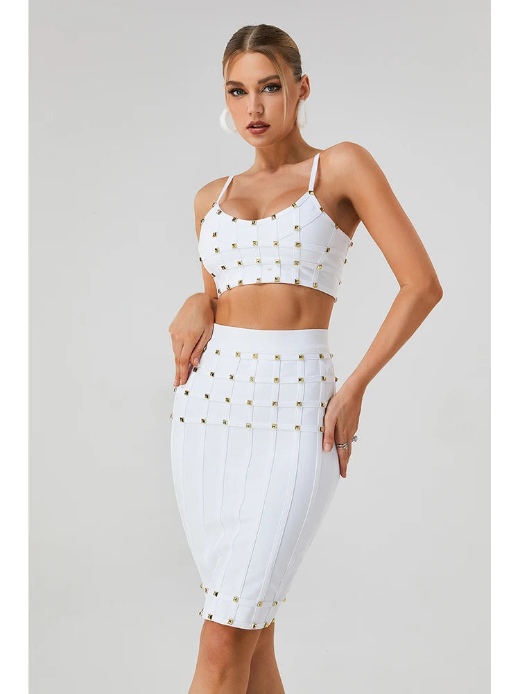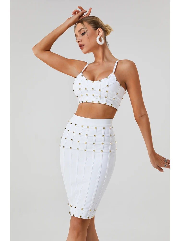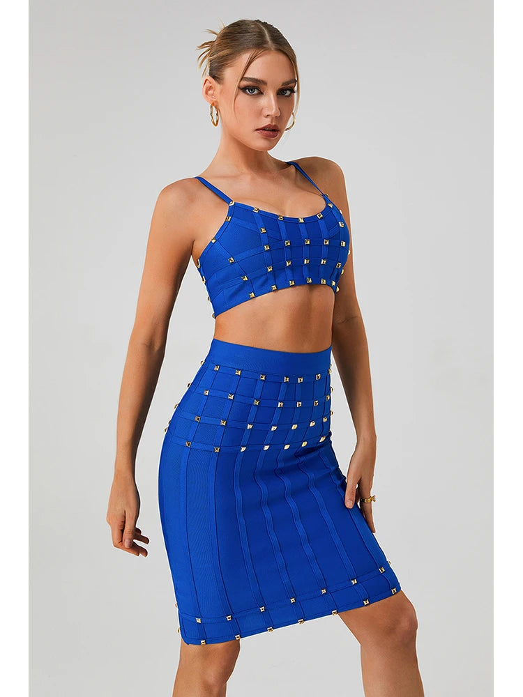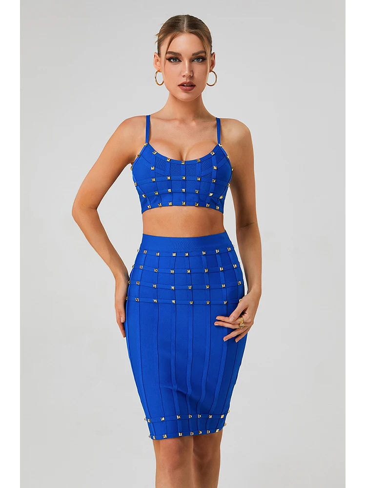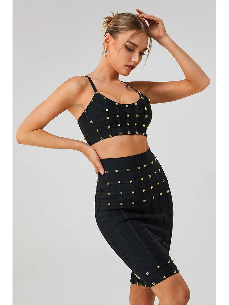 Elevate your evening look with this sexy two-piece set for women in a gorgeous green hue. The set includes a short sleeveless top paired with a rivet midi bandage skirt, perfect for elegant evening parties and special occasions. The combination of the chic top and bodycon skirt adds a touch of sophistication and glamour to your ensemble, making you stand out with style and grace. The elegant design and figure-flattering silhouette create a fashionable and eye-catching look that exudes confidence and allure. Make a statement at your next evening event with this stunning outfit that showcases your sense of style and sophistication, ensuring you turn heads and own the spotlight.