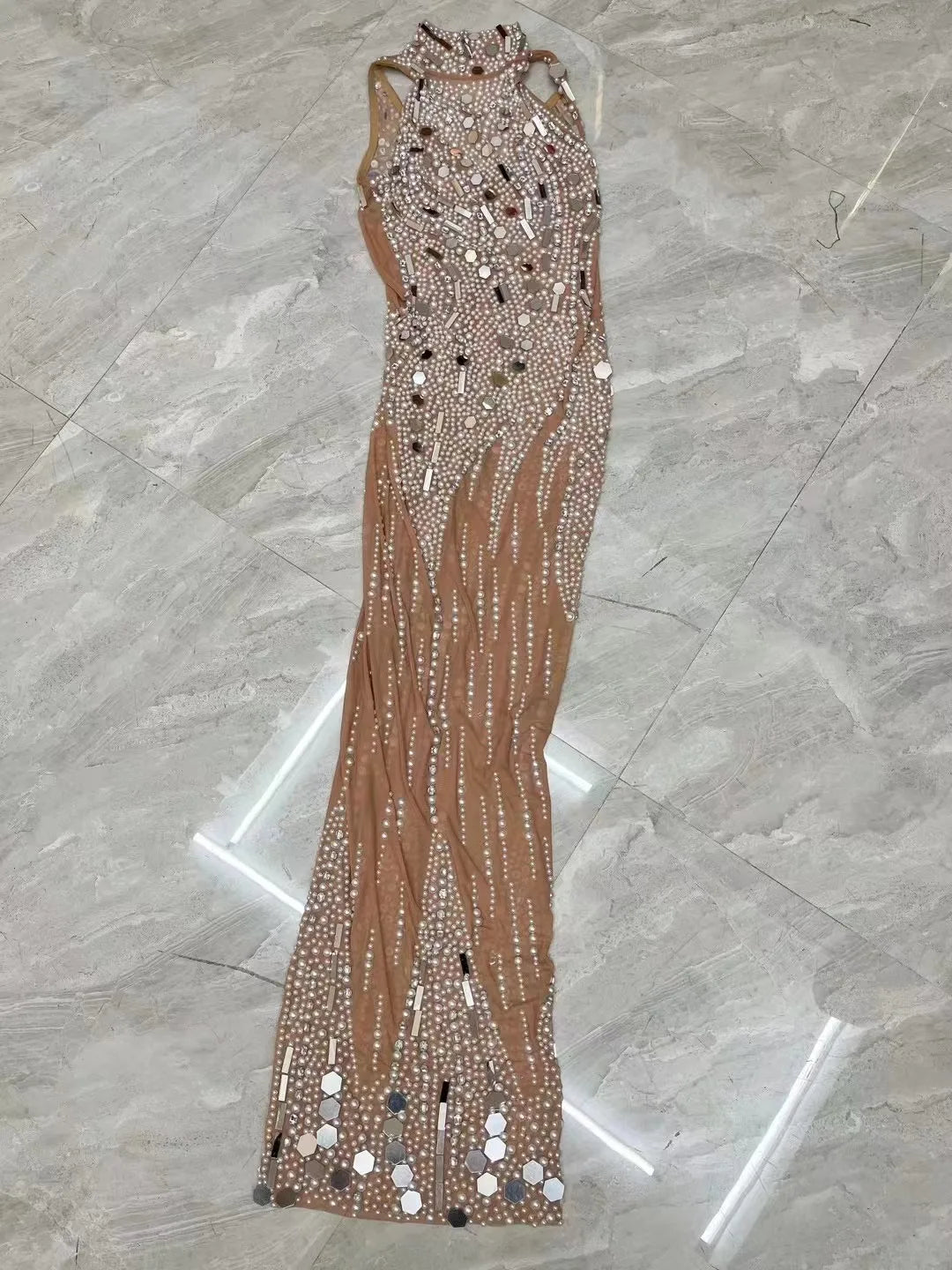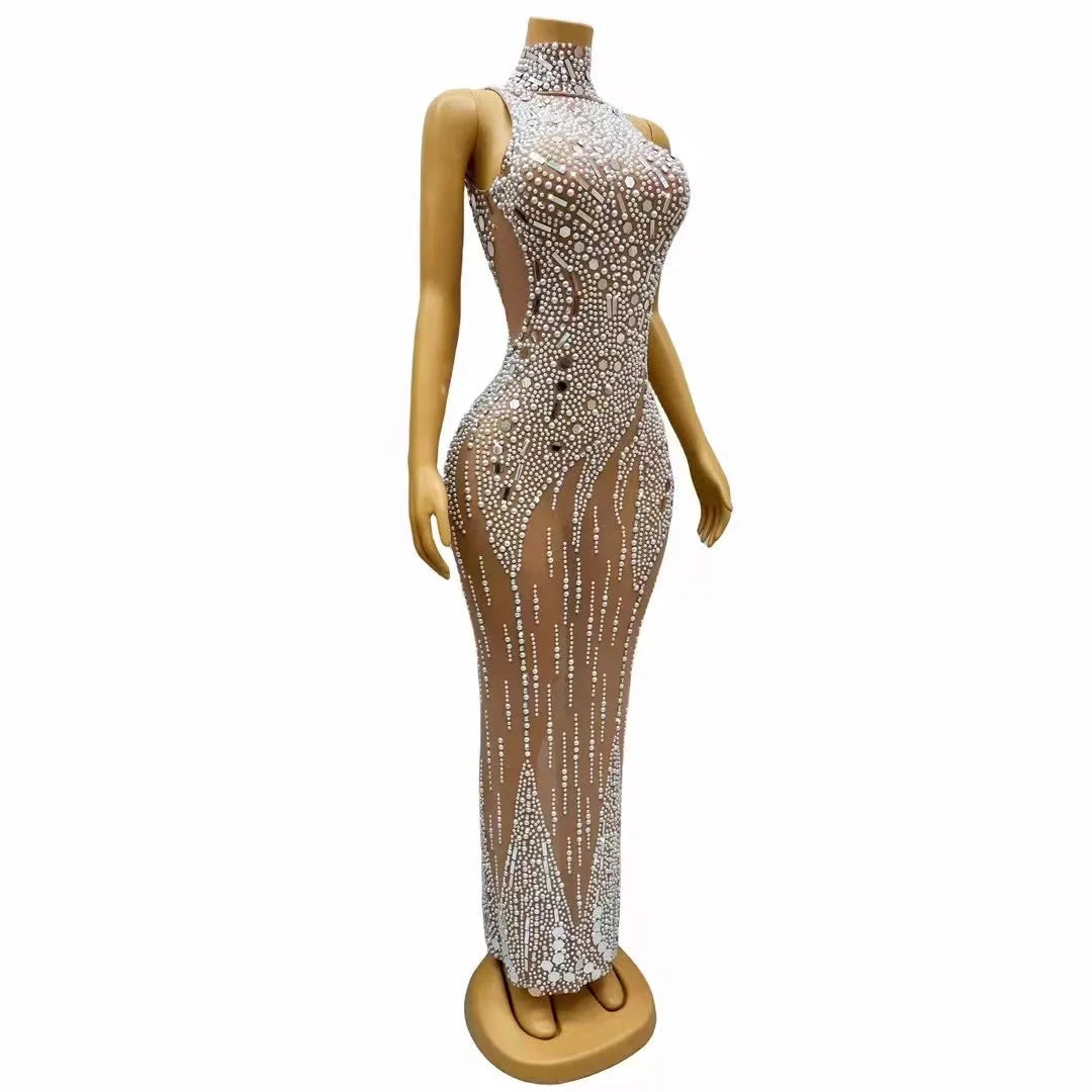 This sexy silver dress is adorned with mirrors, rhinestones, and pearls, making it perfect for evening celebrations, dance performances, birthdays, stretchy photoshoots, and costumes.