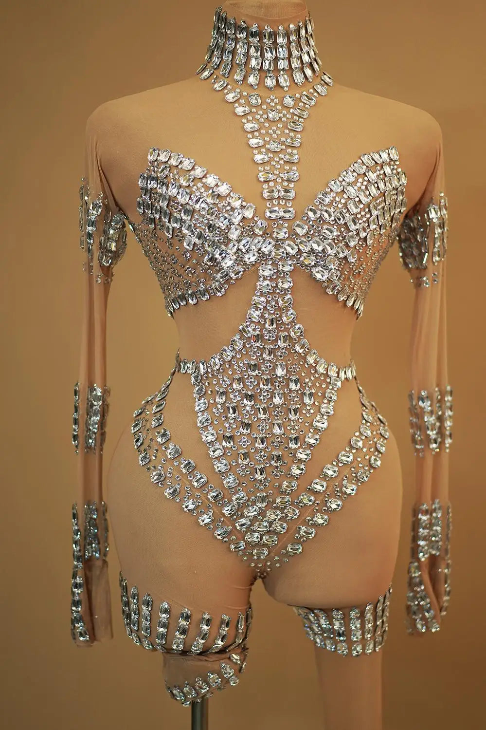 Sexy Silver Sparkly Diamonds Jumpsuit Women Performance Bodysuit Party Singer Dance Costume Jazz Dance Clothing