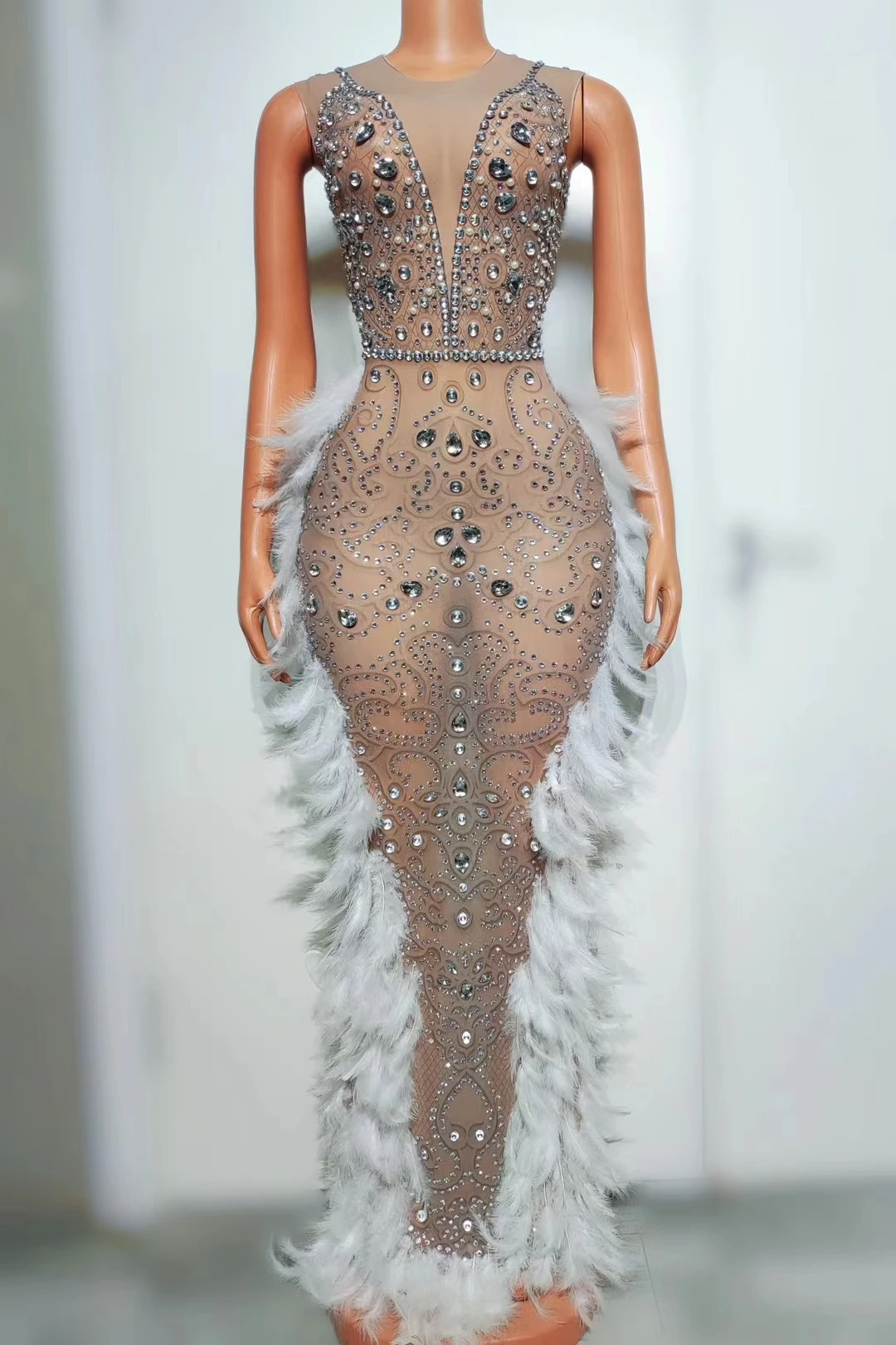 Sexy Sleeveless Mesh Perspective White Feather Prom Dress Design Feeling Diamond Tight Elastic Performance Clothing Huoju