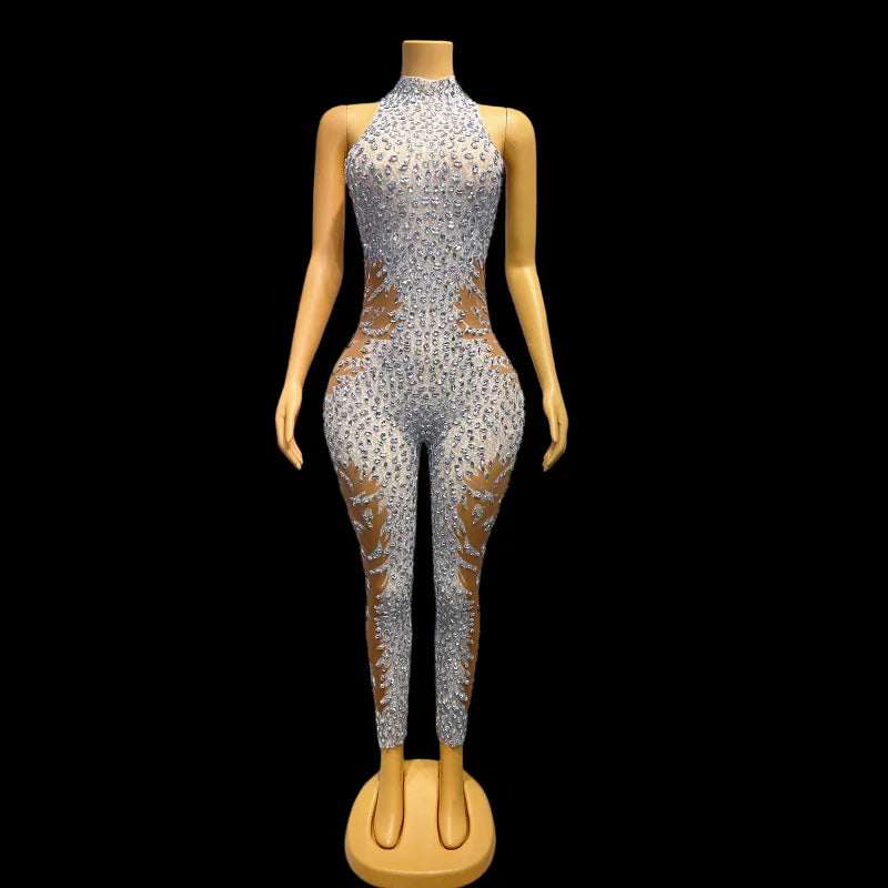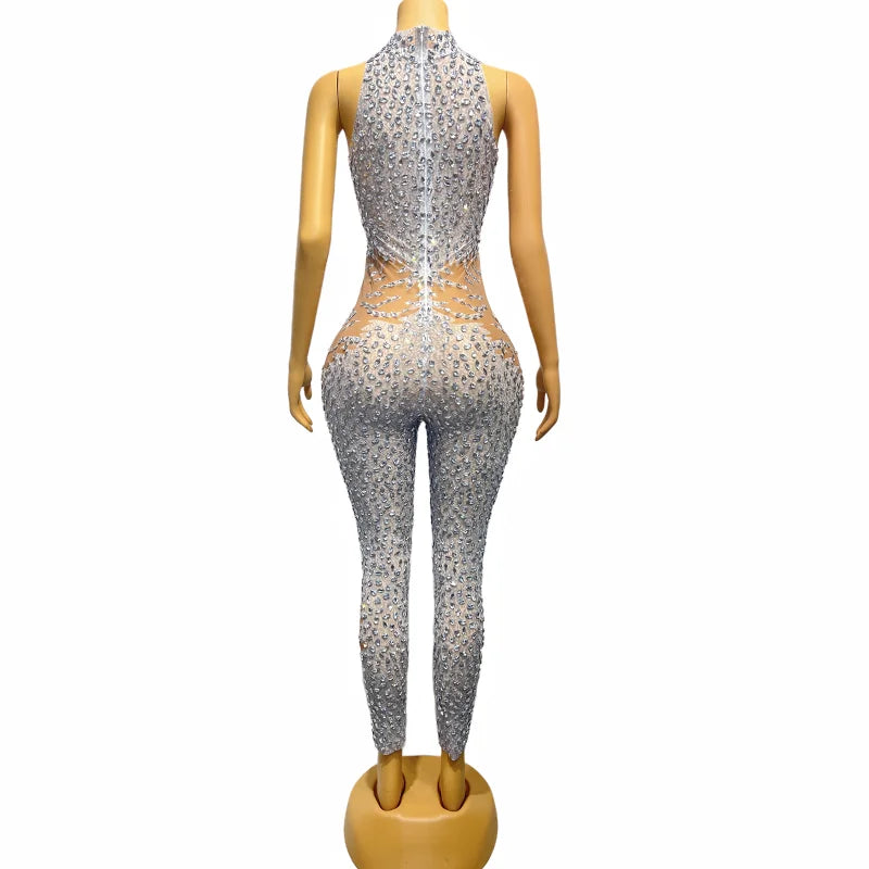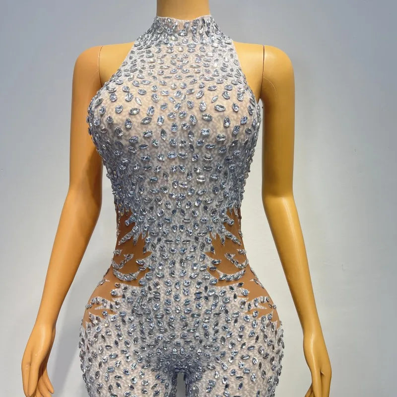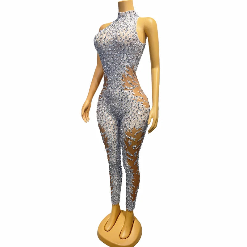 Wow the crowd at your birthday celebration or evening event in this sexy sleeveless silver rhinestones mesh transparent jumpsuit. This stunning costume features stones and a bodysuit design, making it the perfect choice for a glamorous and eye-catching outfit. Stand out and celebrate in style with this alluring ensemble.
