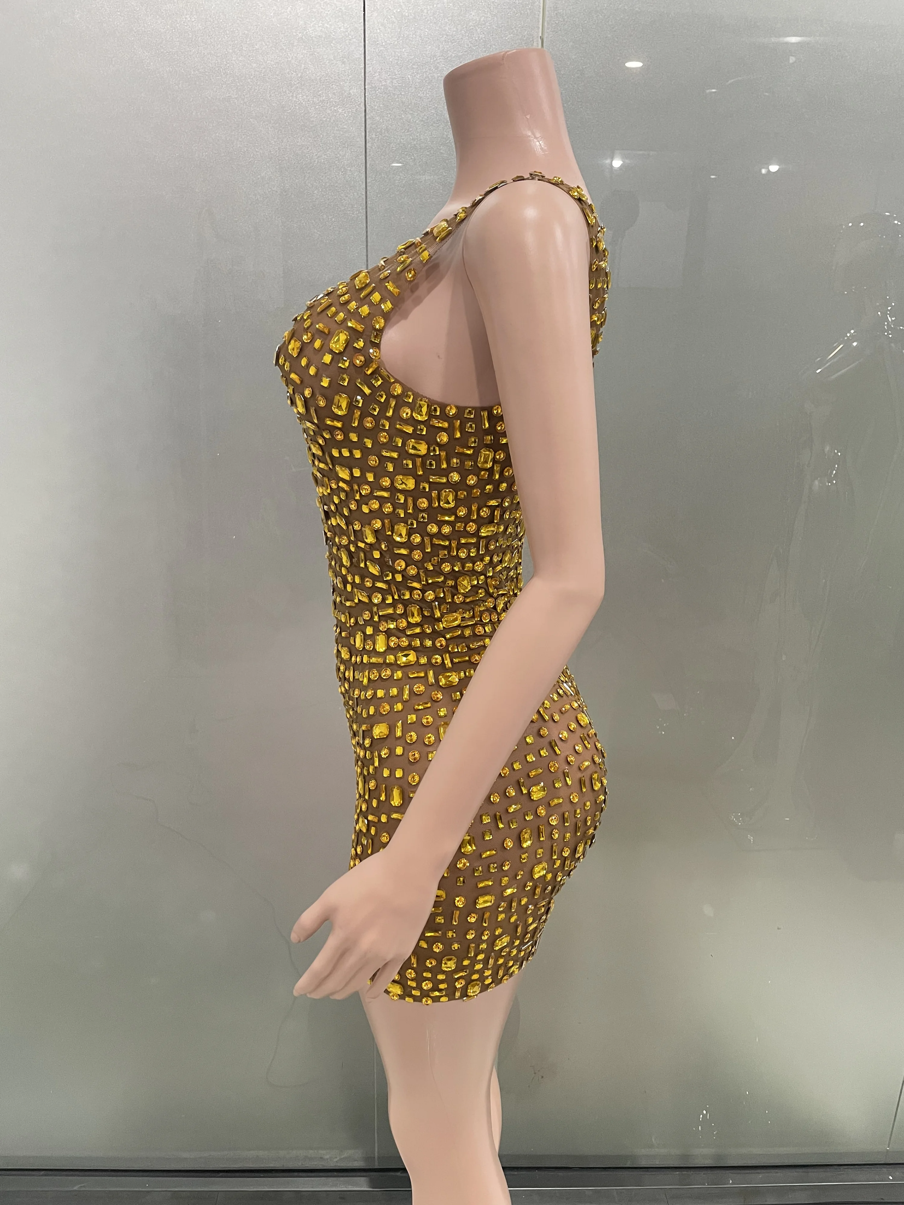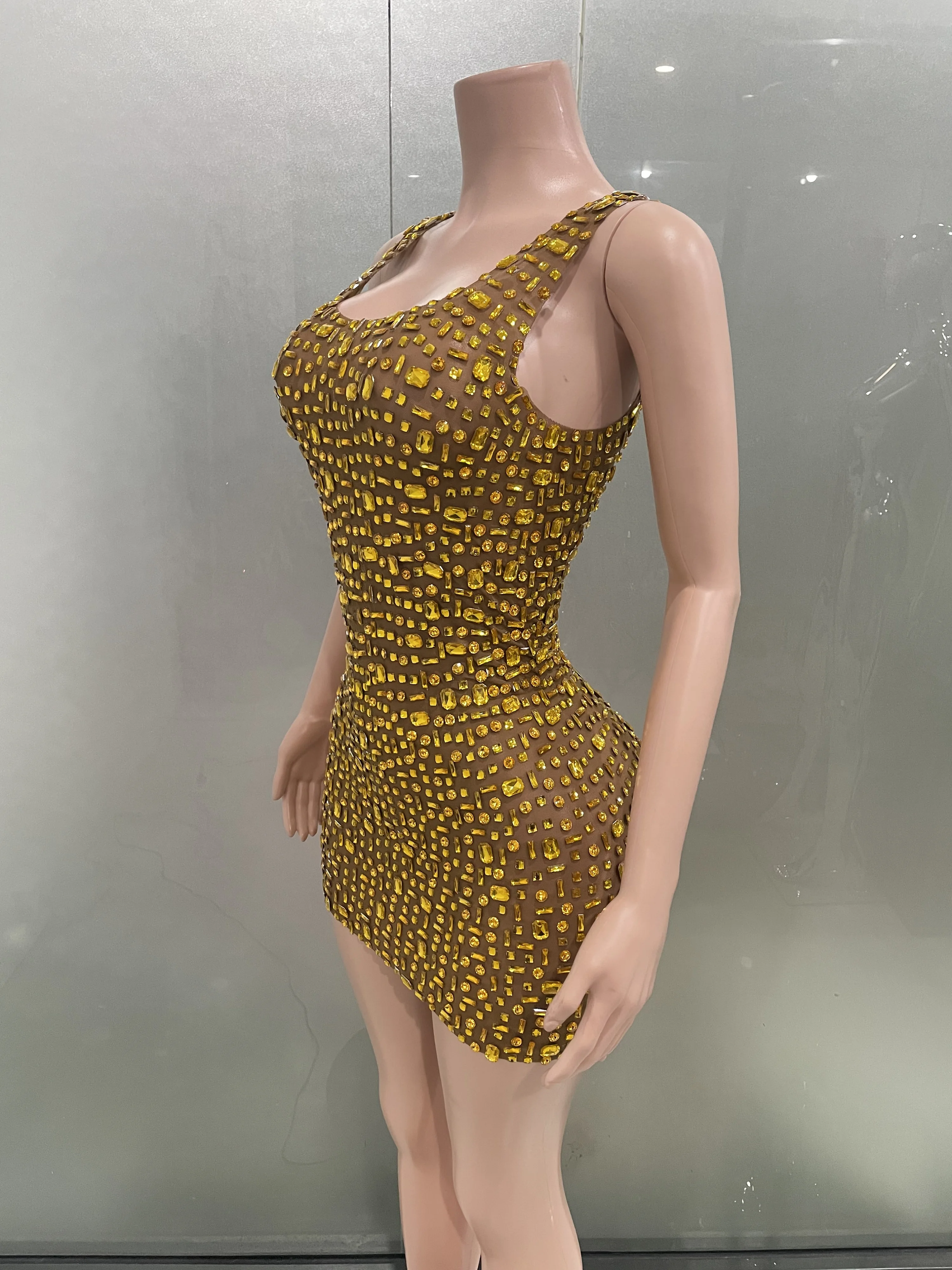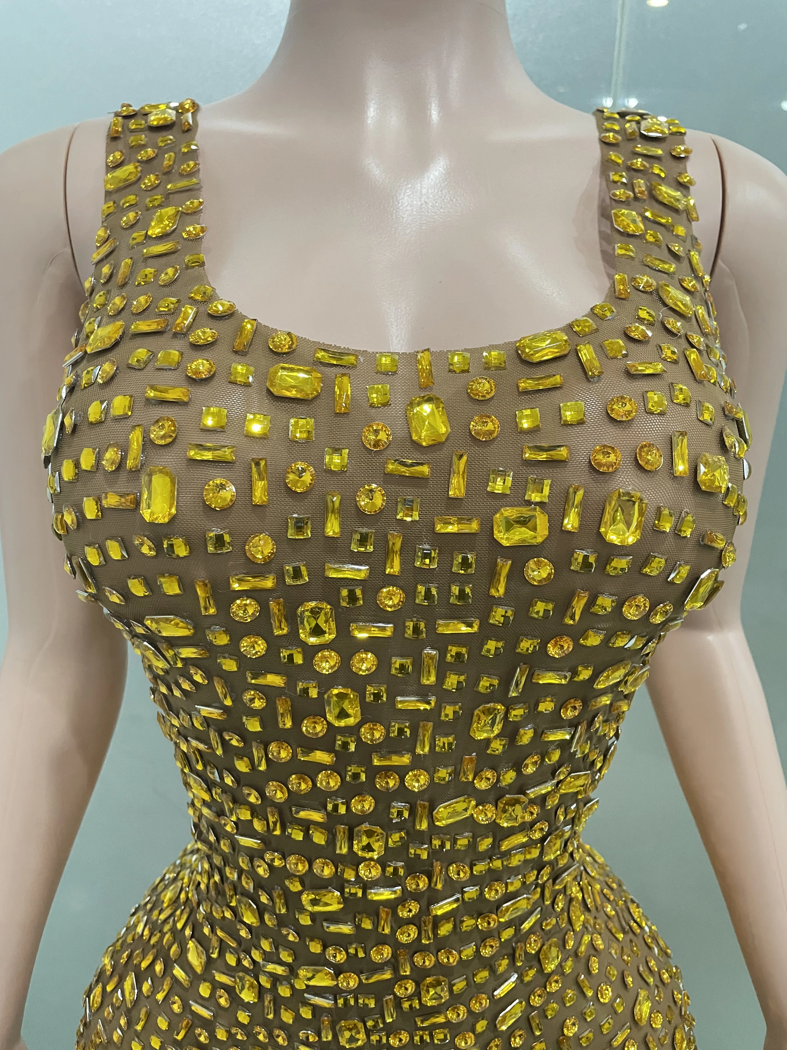 Sexy Sparkly Gold Rhinestones Sleeveless Transparent Short Dress Women Evening Birthday Gowns Club Singer Show Wear