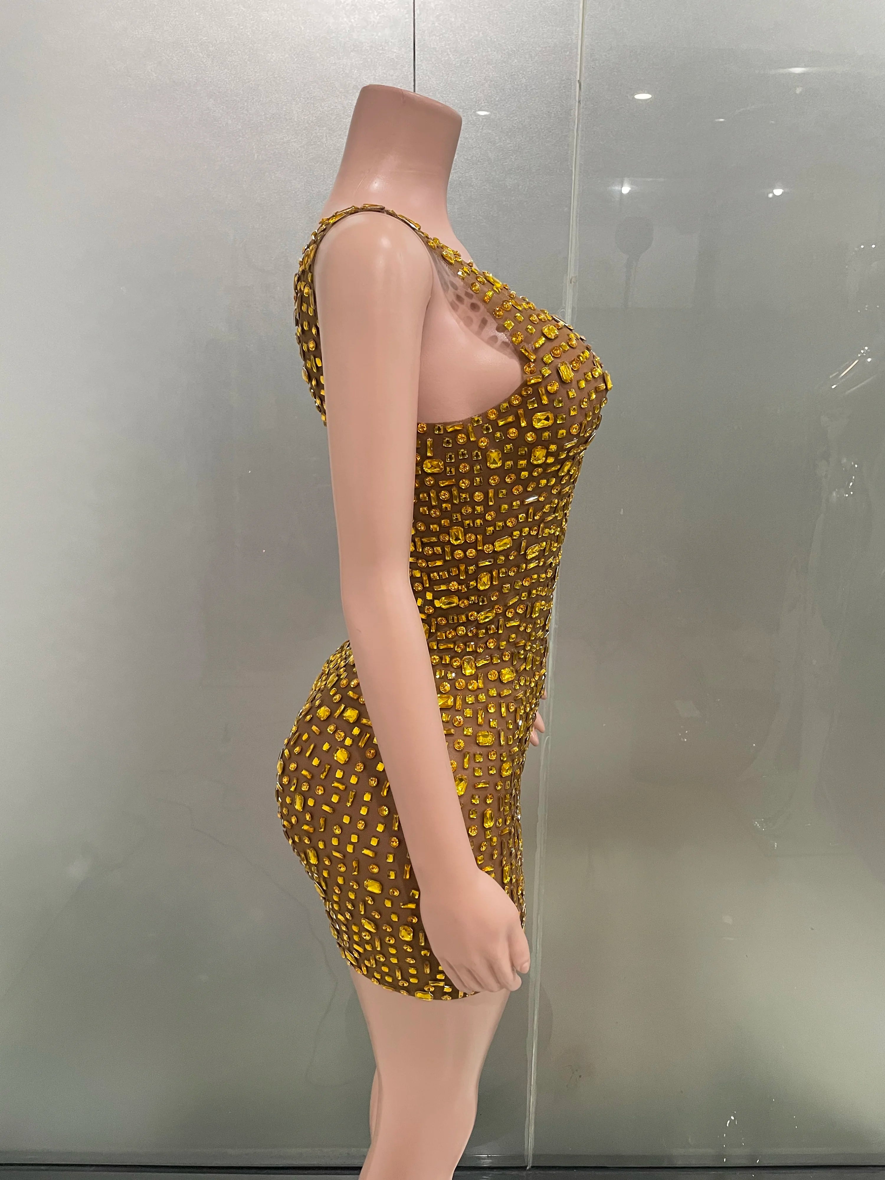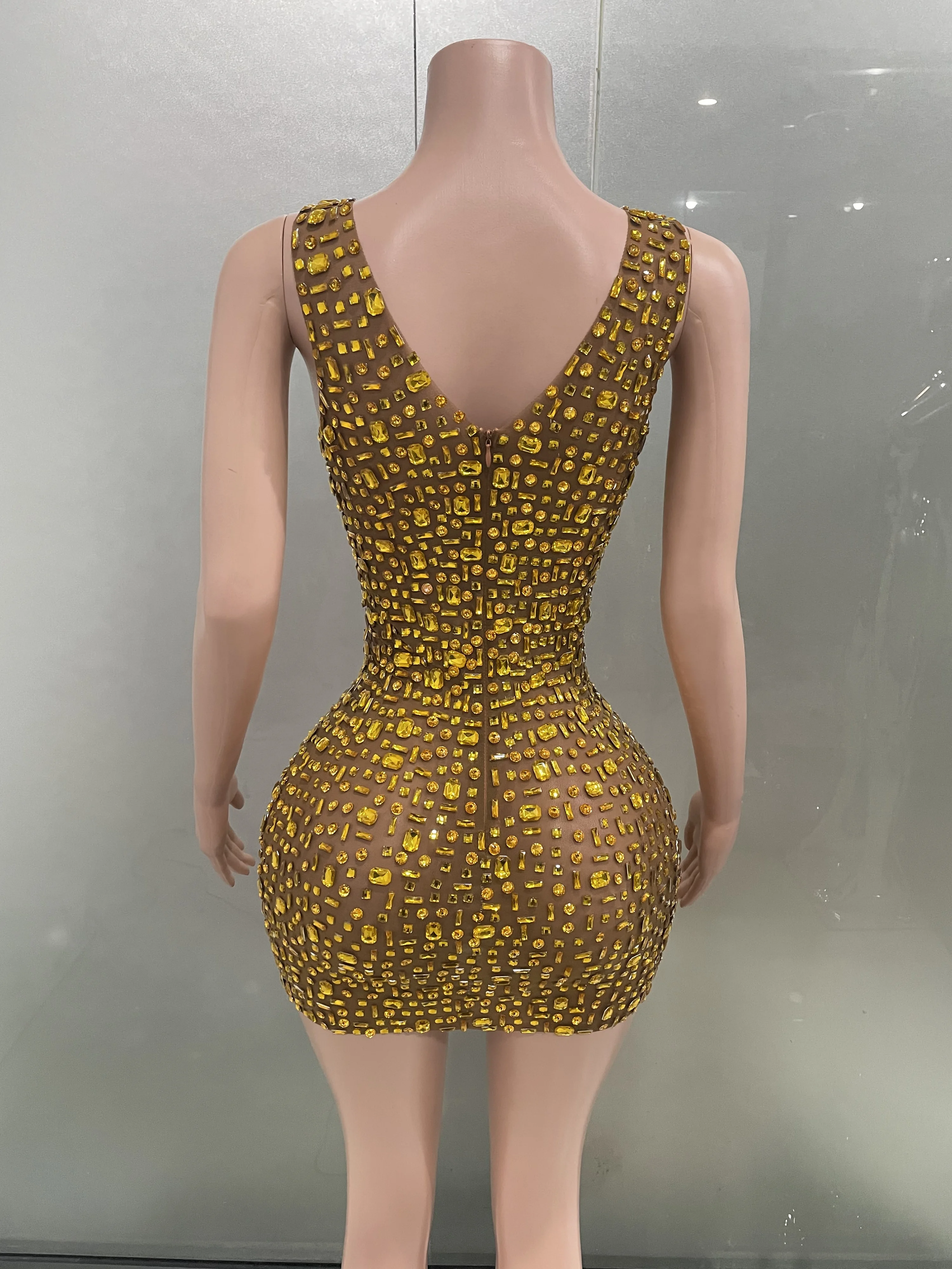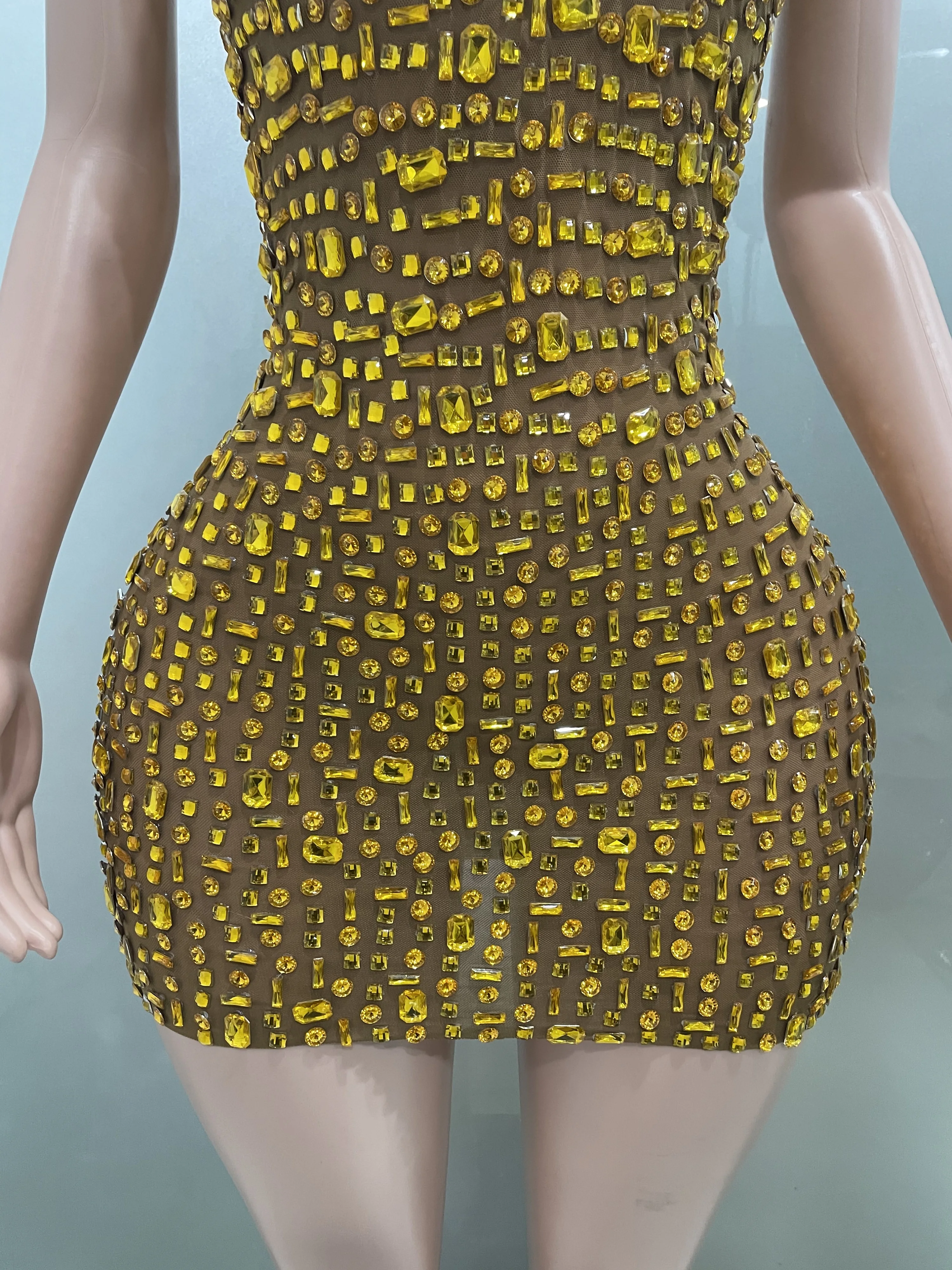 Sexy Sparkly Gold Rhinestones Sleeveless Transparent Short Dress Women Evening Birthday Gowns Club Singer Show Wear